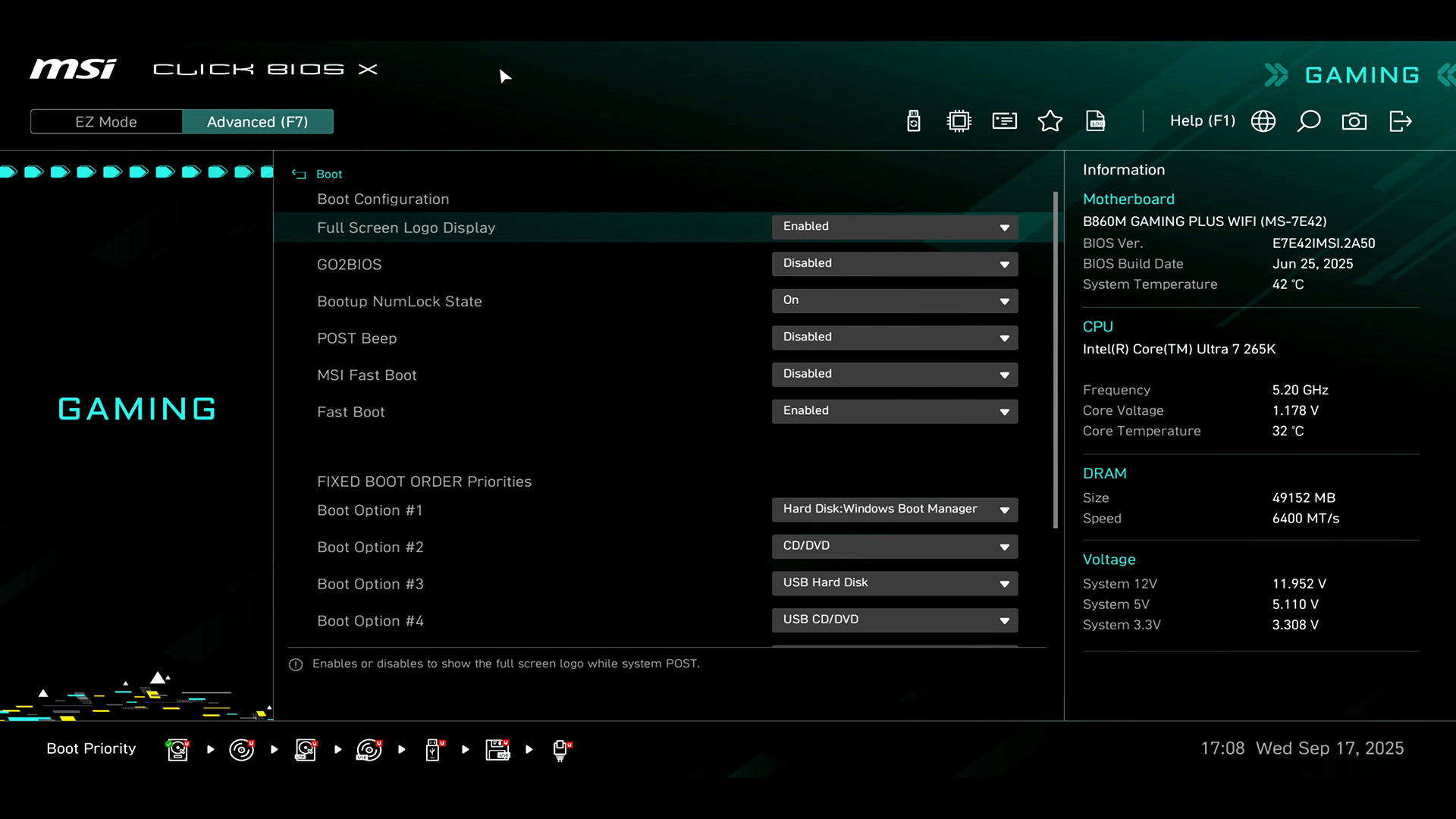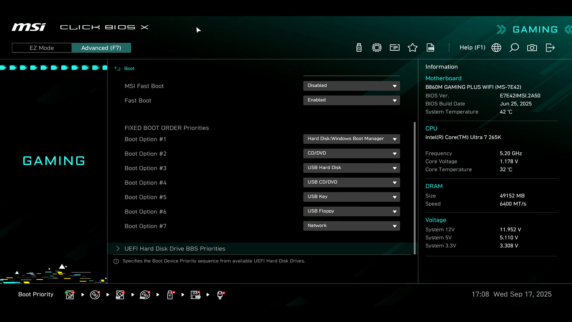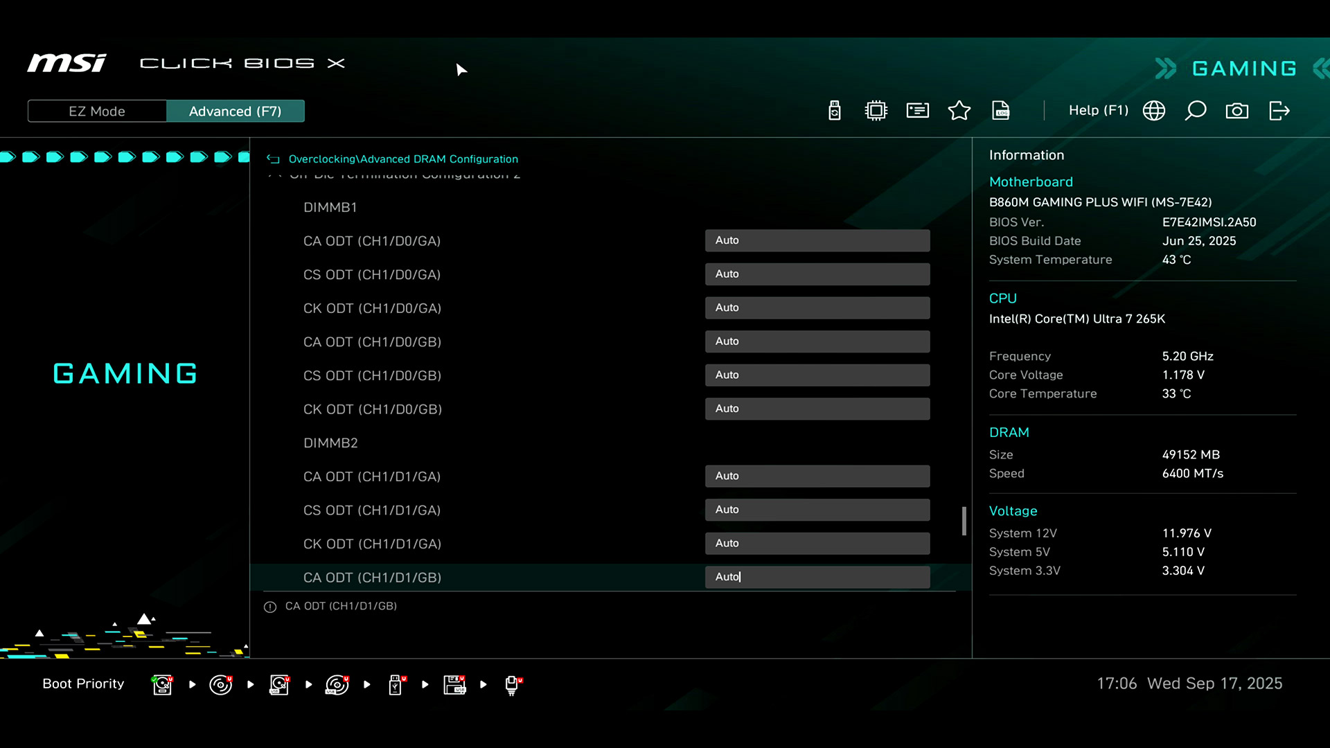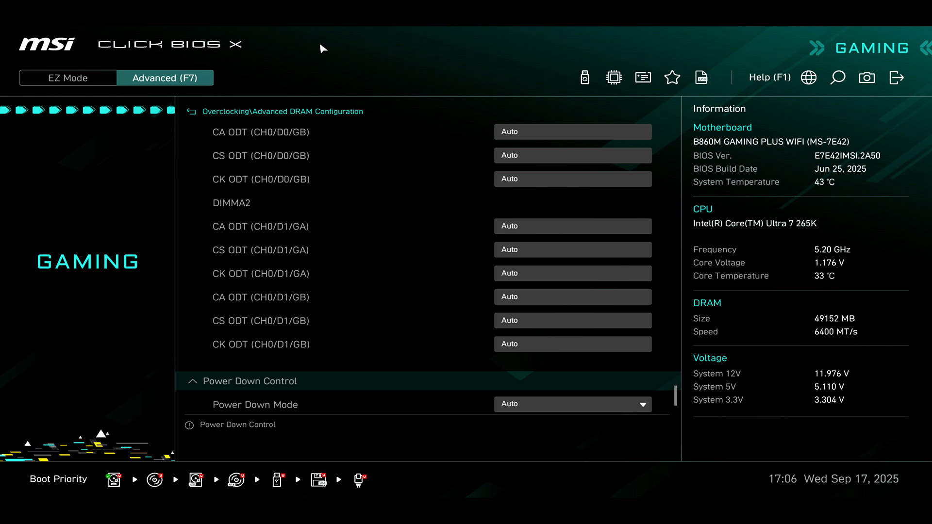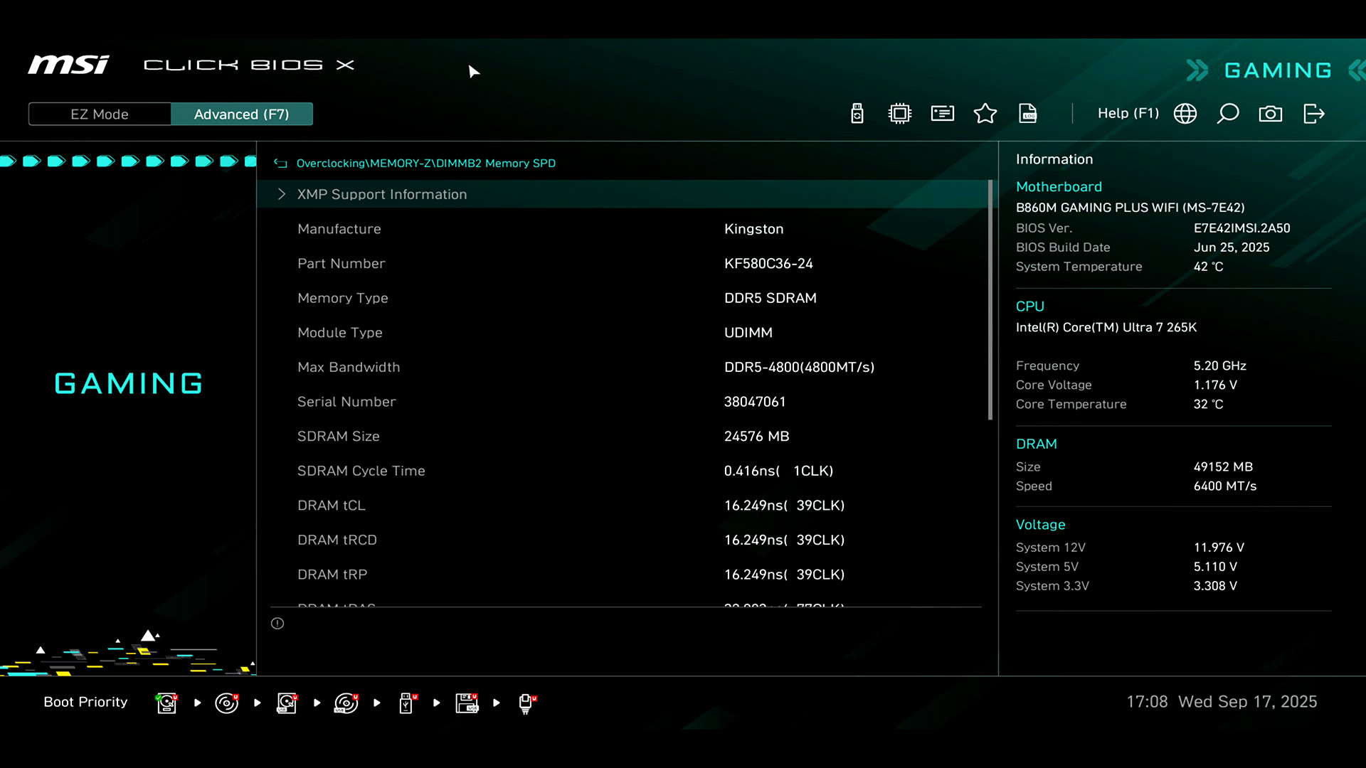 MSI B860M Gaming Plus WiFi управляется через интерфейс MSI Click BIOS X, который оперируется в режимах EZ Mode и Advanced Mode.