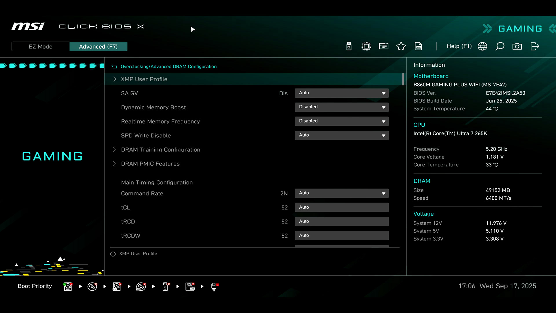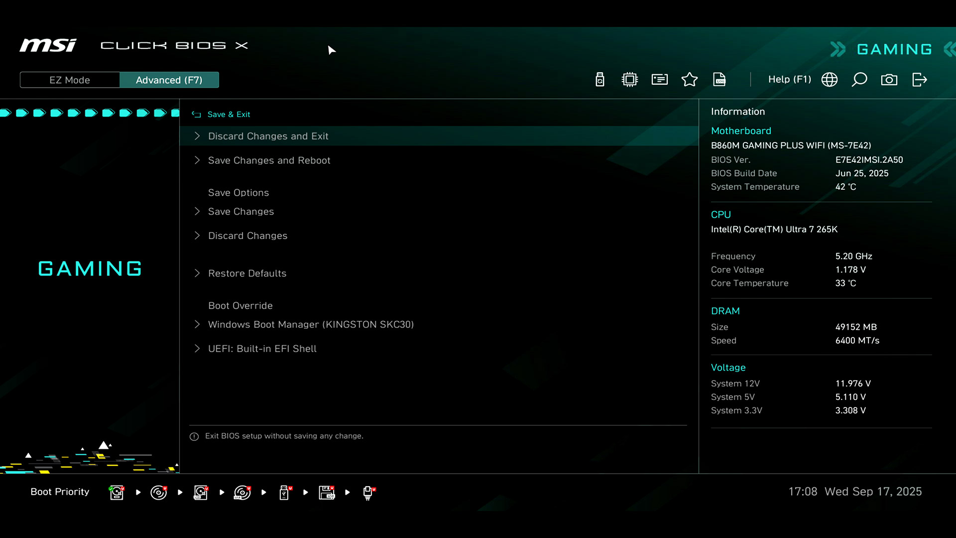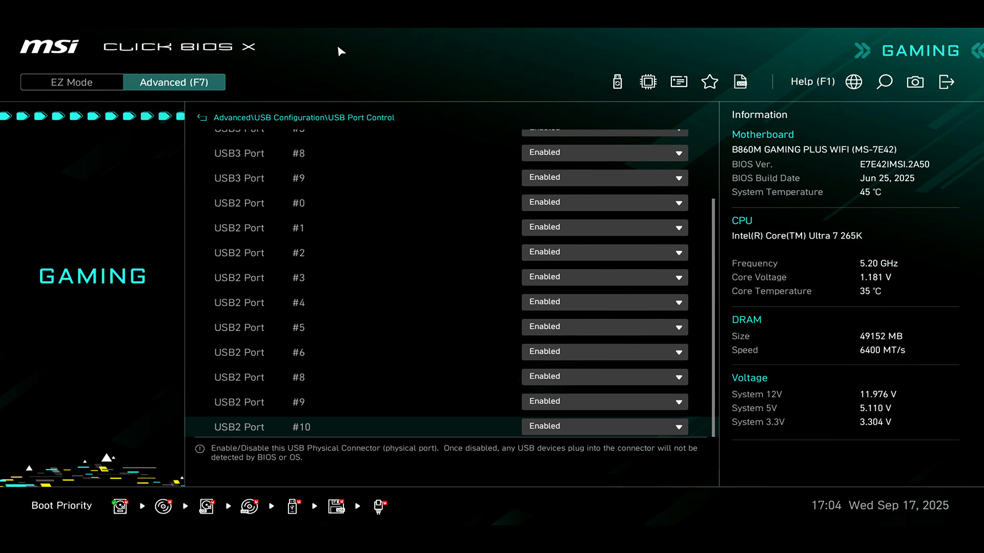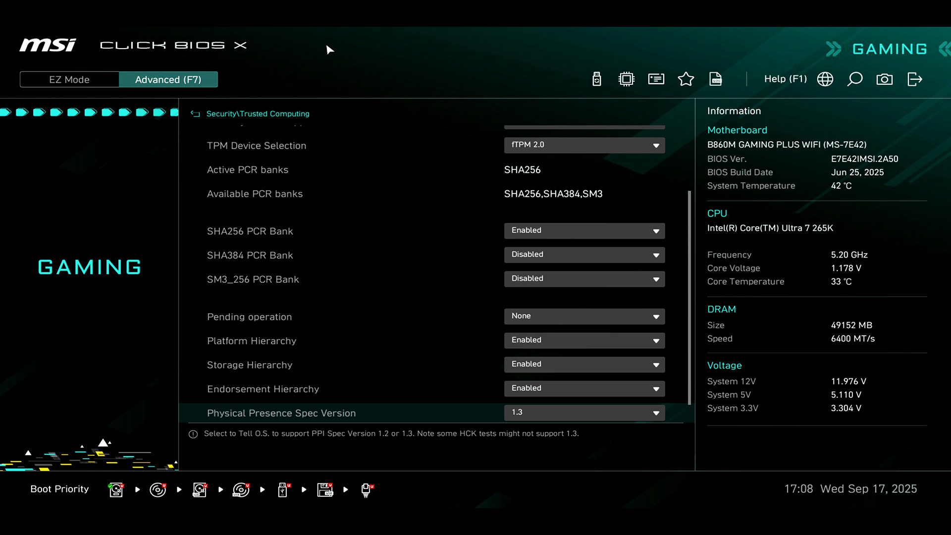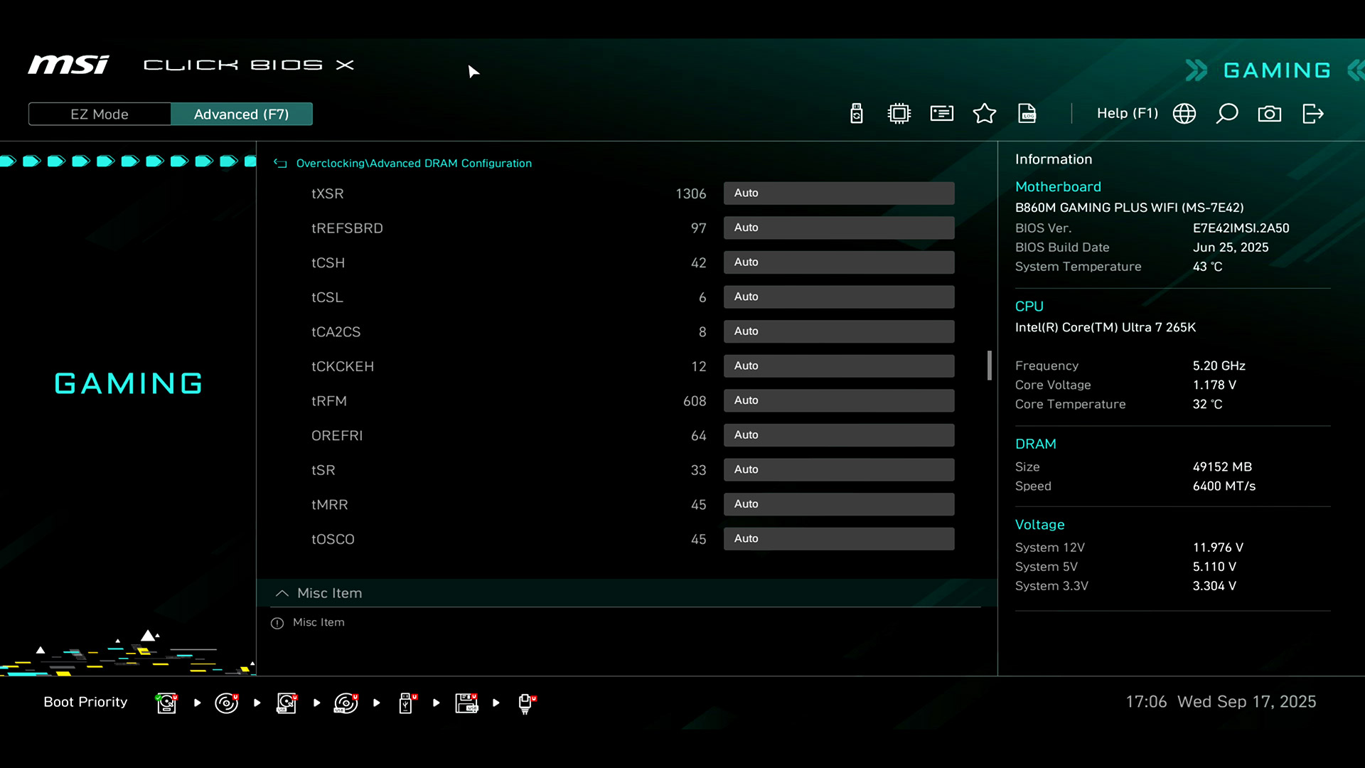 MSI B860M Gaming Plus WiFi управляется через интерфейс MSI Click BIOS X, который оперируется в режимах EZ Mode и Advanced Mode.