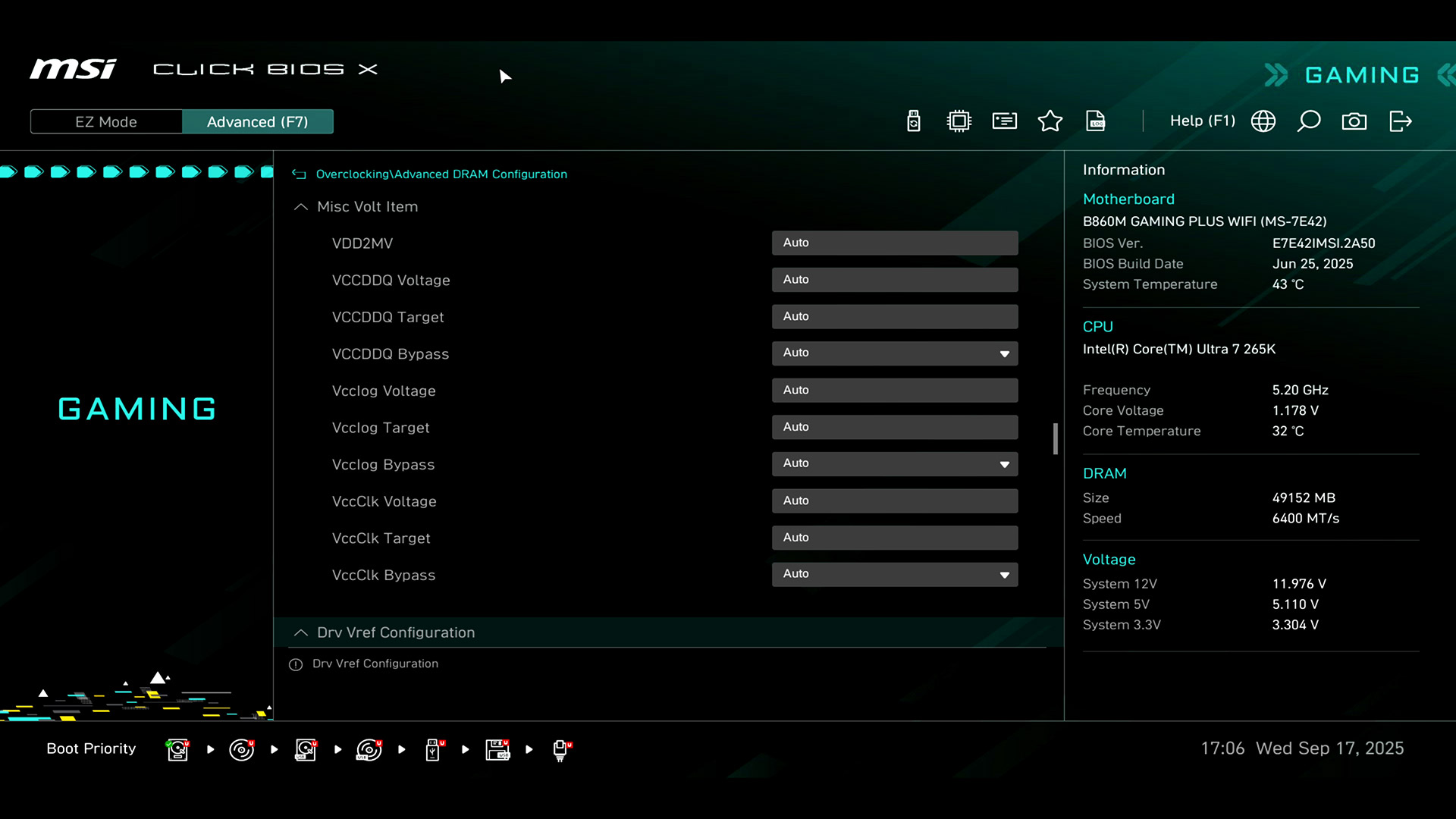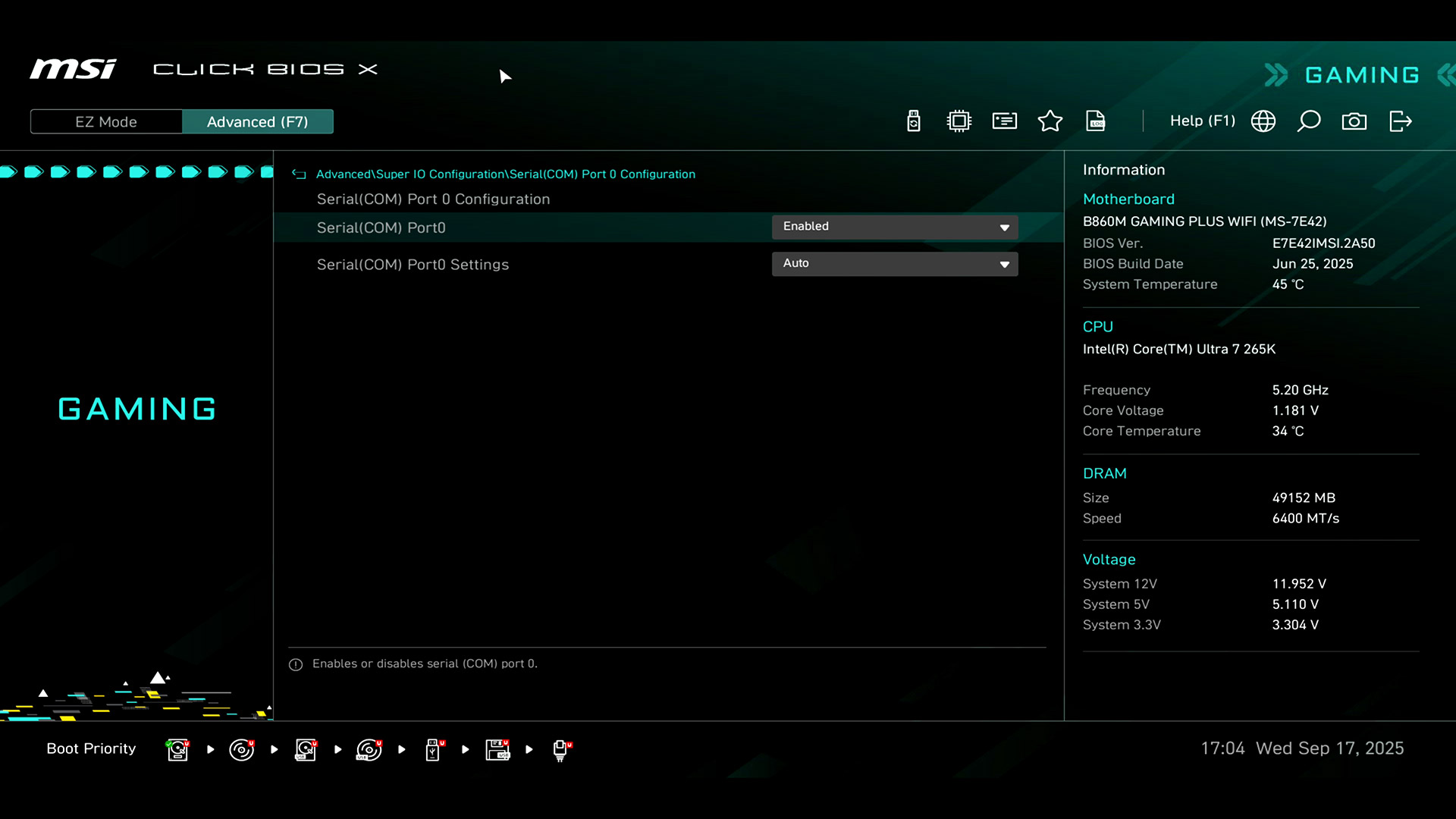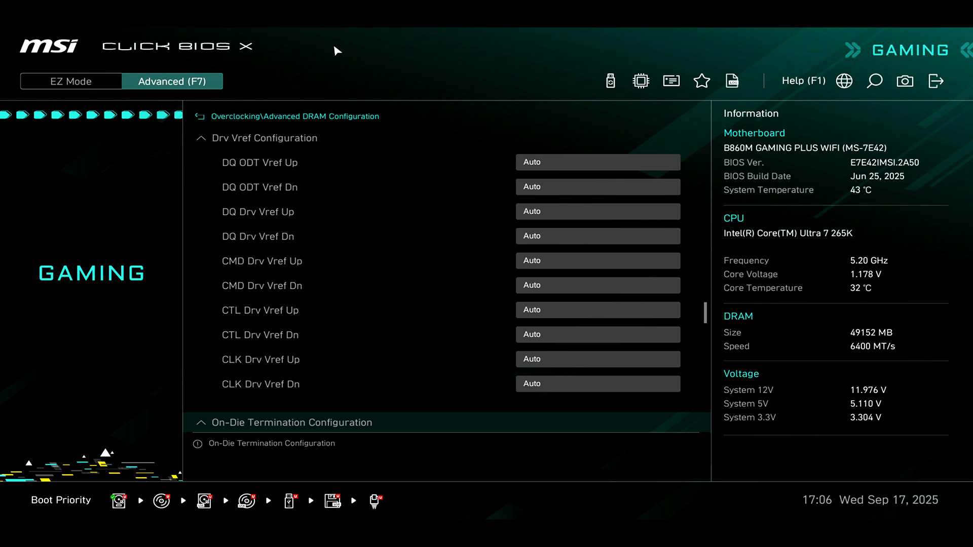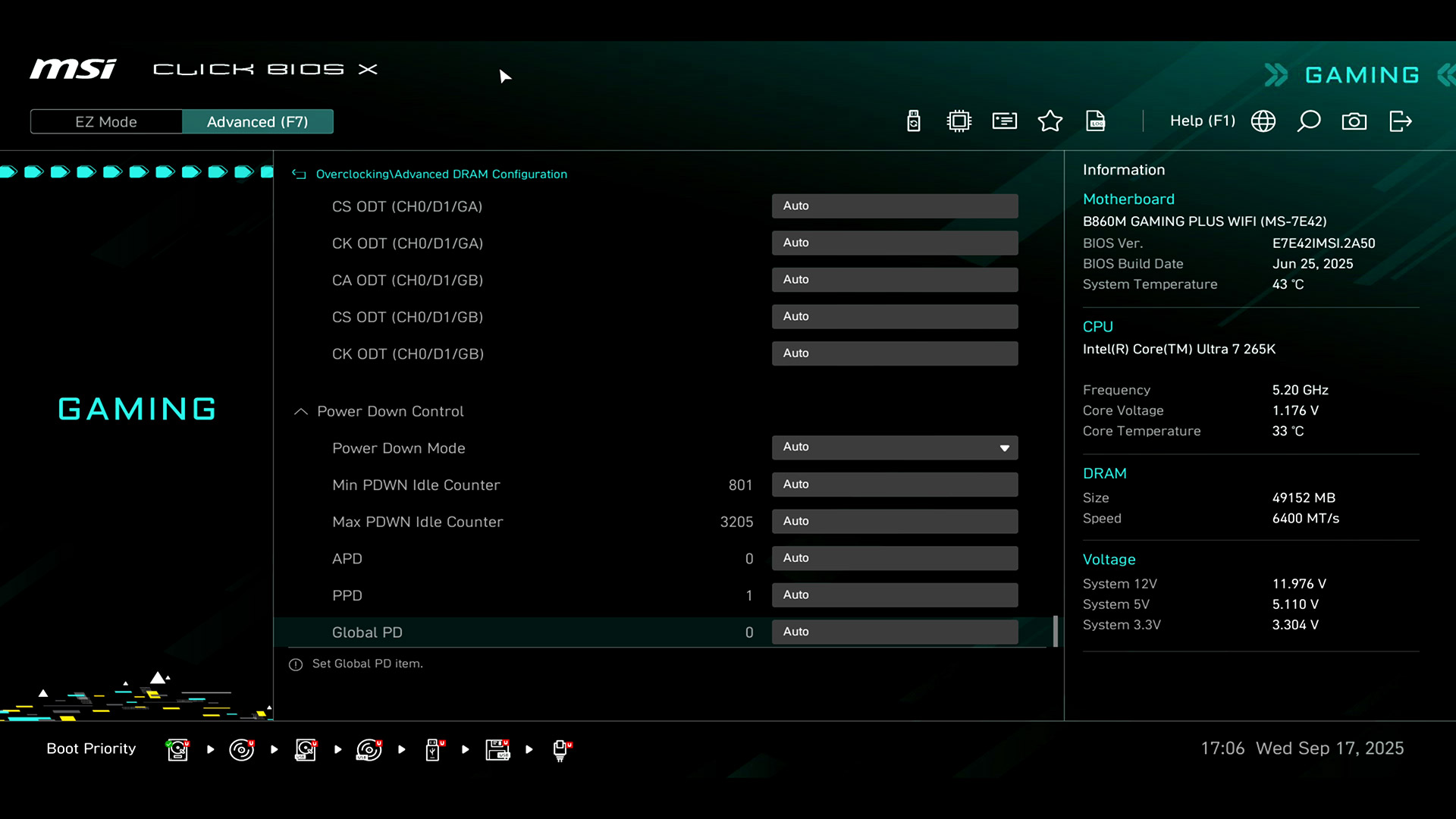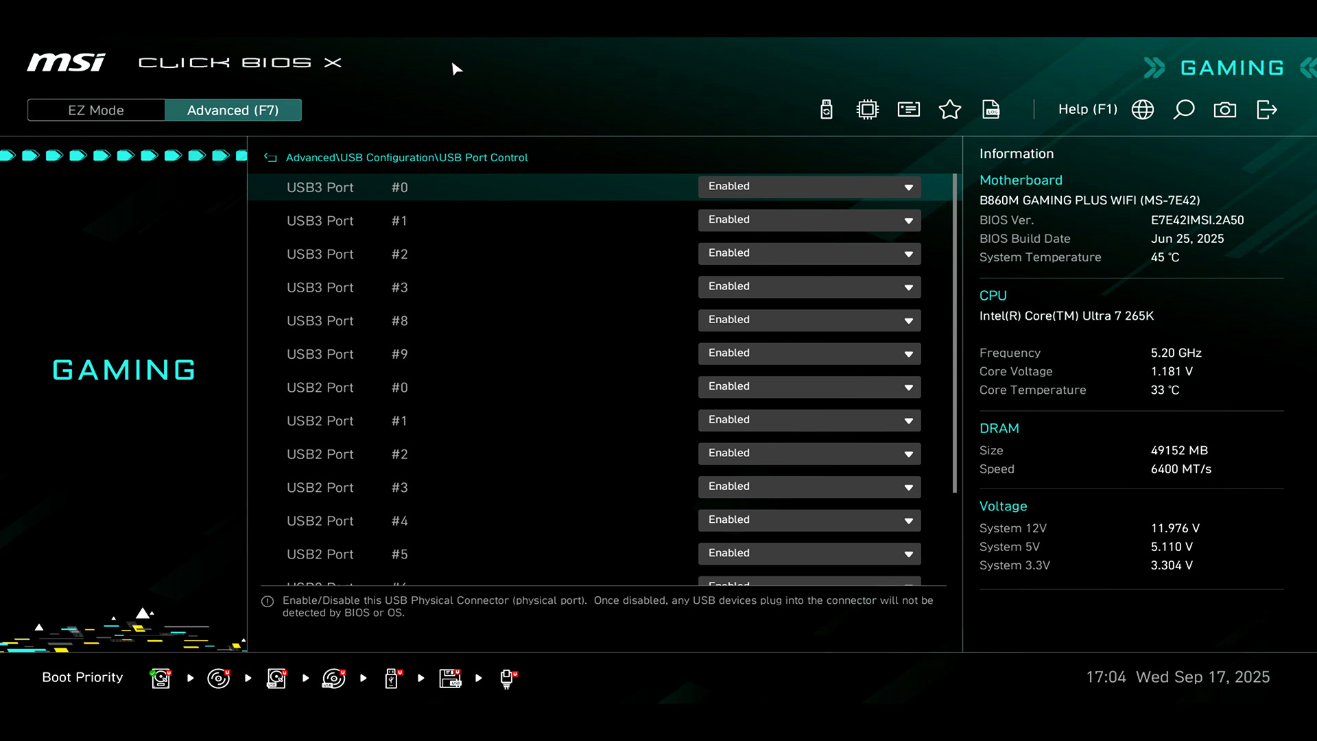 MSI B860M Gaming Plus WiFi управляется через интерфейс MSI Click BIOS X, который оперируется в режимах EZ Mode и Advanced Mode.