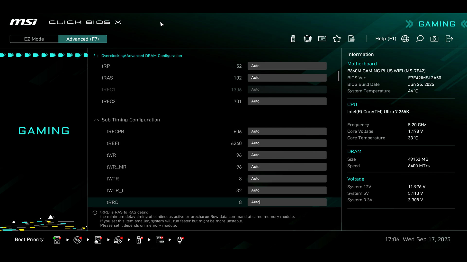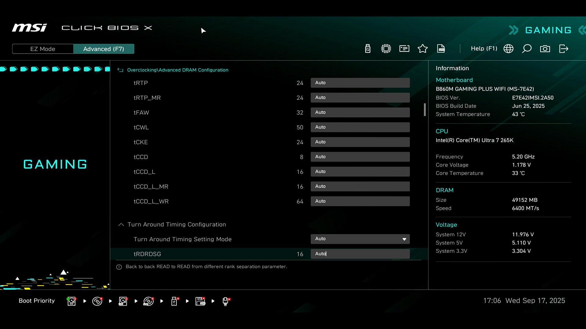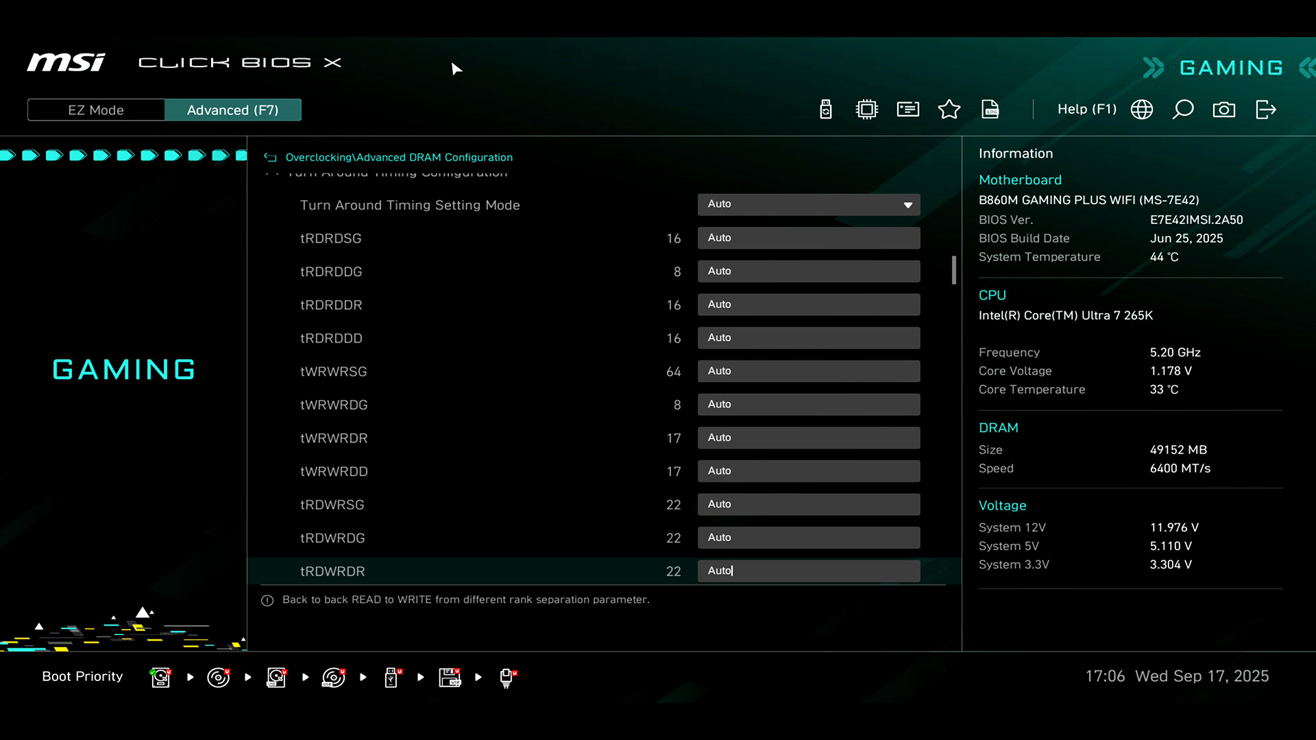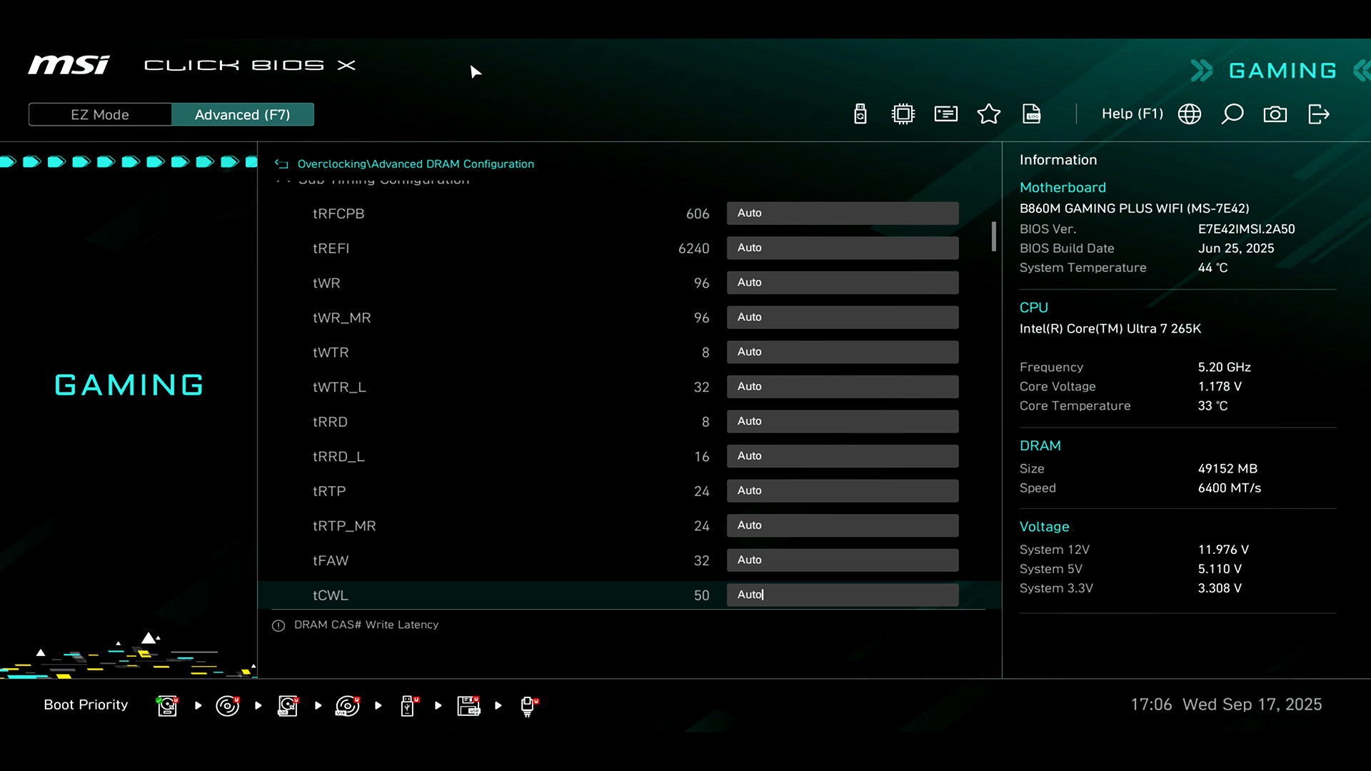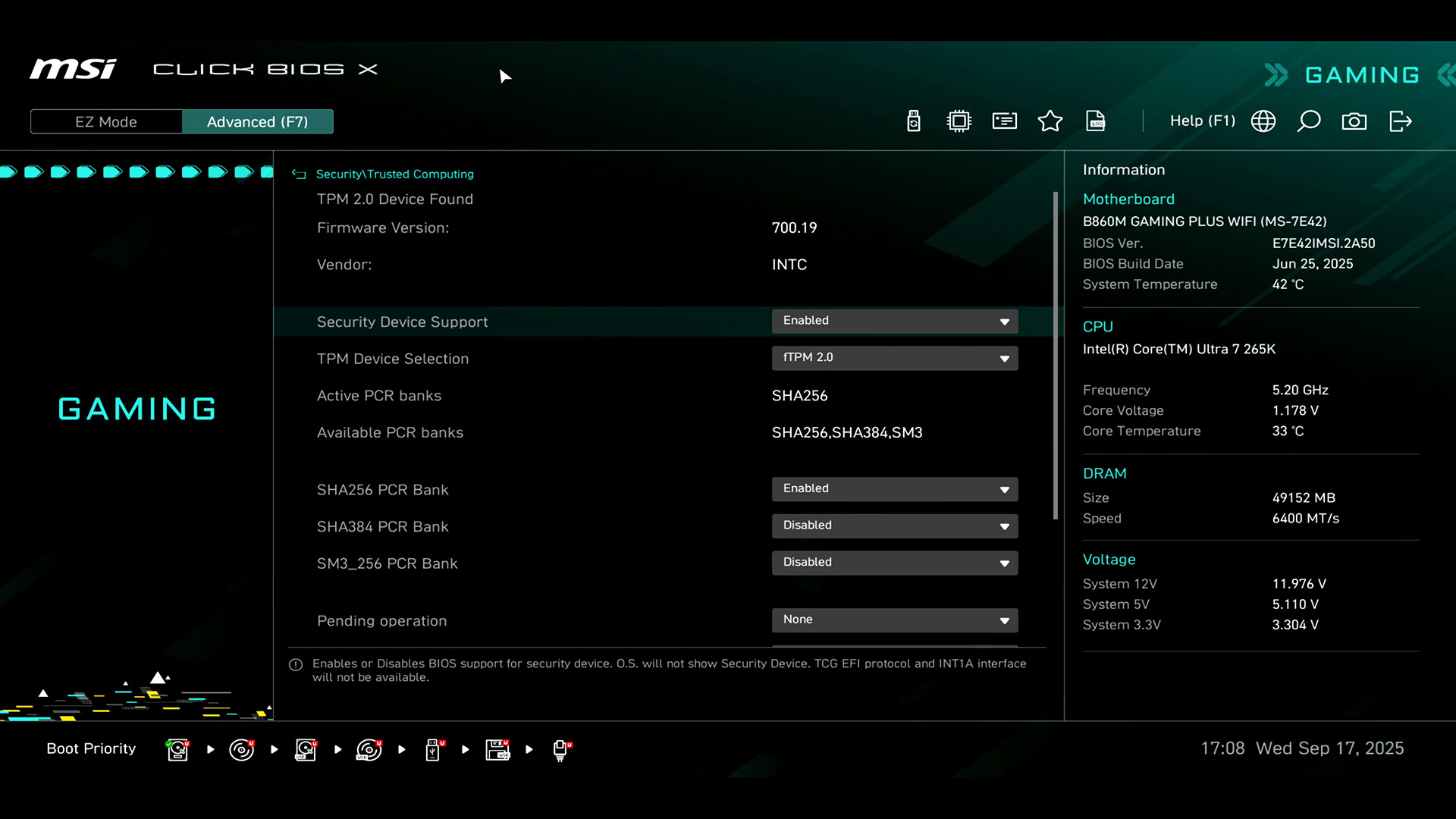 MSI B860M Gaming Plus WiFi управляется через интерфейс MSI Click BIOS X, который оперируется в режимах EZ Mode и Advanced Mode.