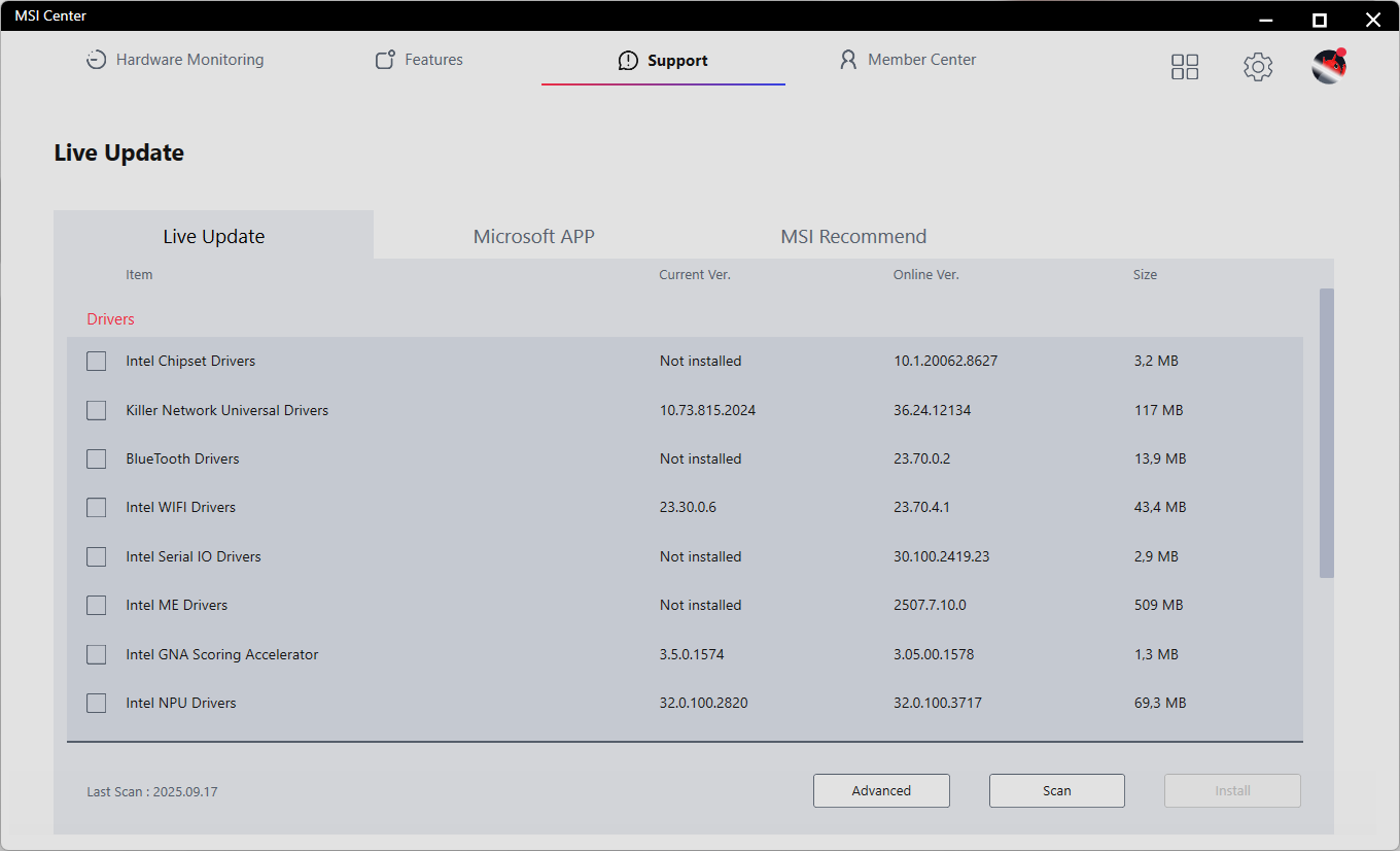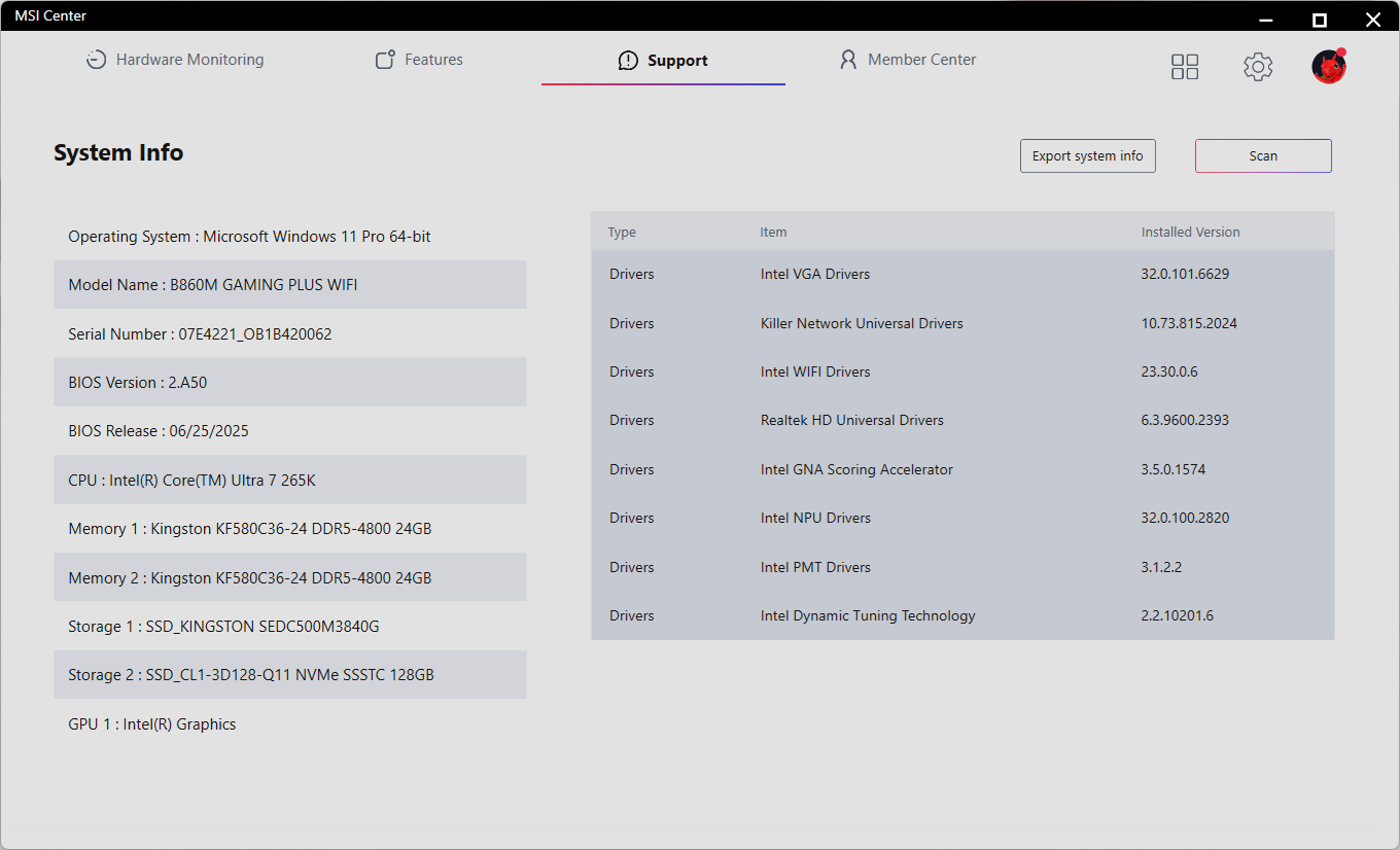 | Фирменное | MSI Center (MSI AI Engine, Game Highlights, User Scenario, MSI Companion, Smart Image Finder, Mystic Light, System Diagnosis, True Color, Cooling Wizard, Live Update), MSI Display Kit |