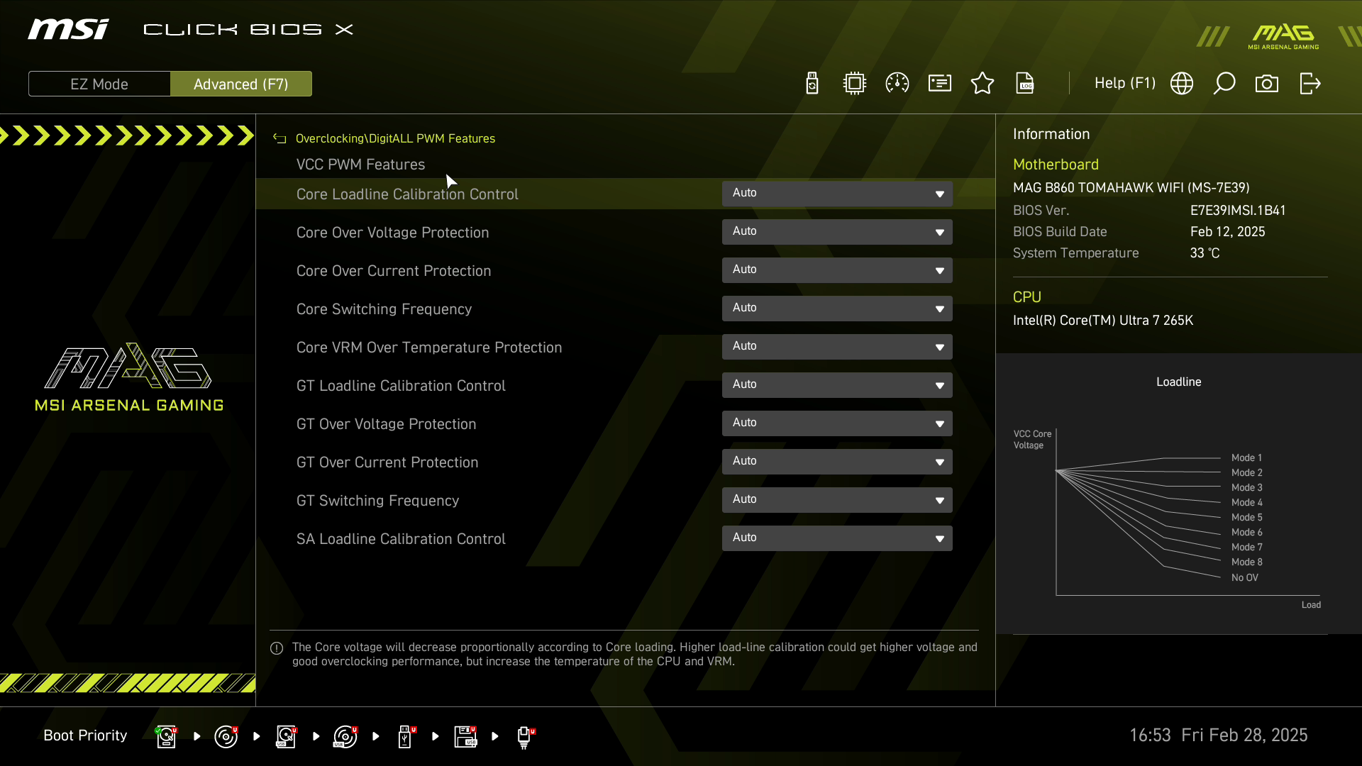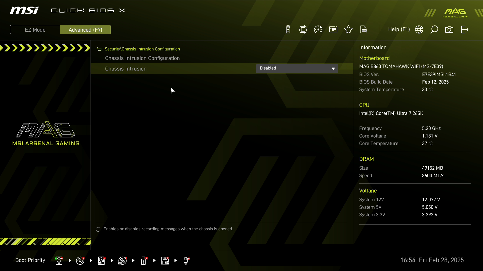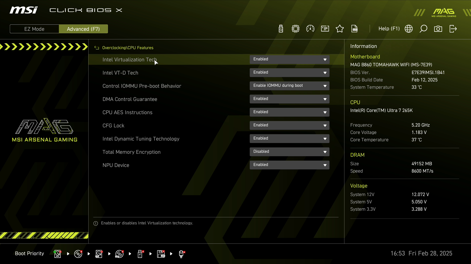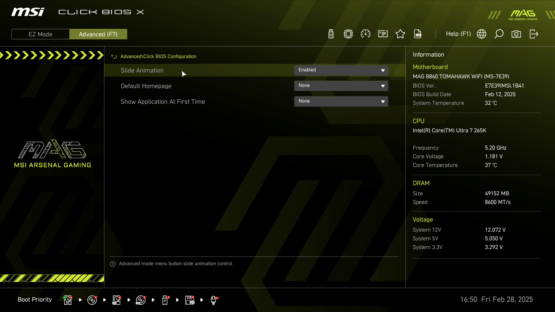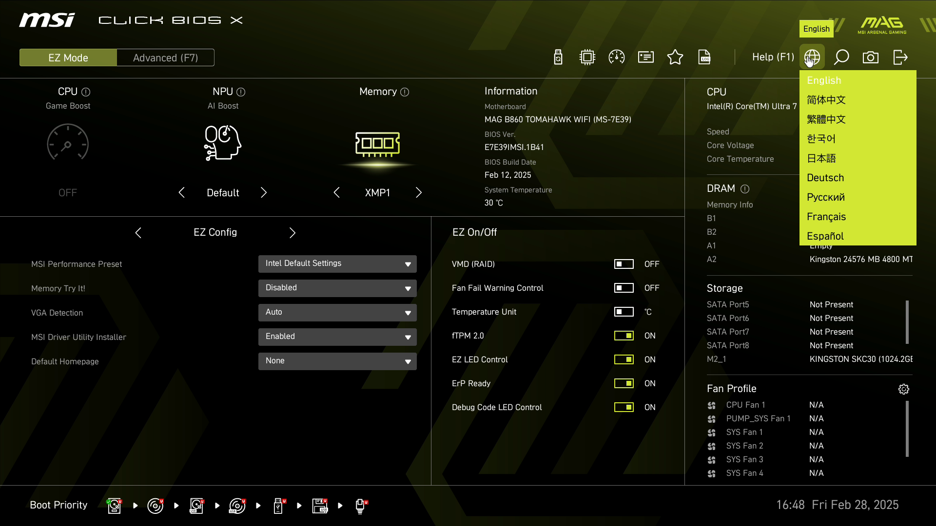 MAG B860 TOMAHAWK WIFI управляется через интерфейс MSI Click BIOS X, который оперируется в режимах EZ Mode и Advanced Mode.