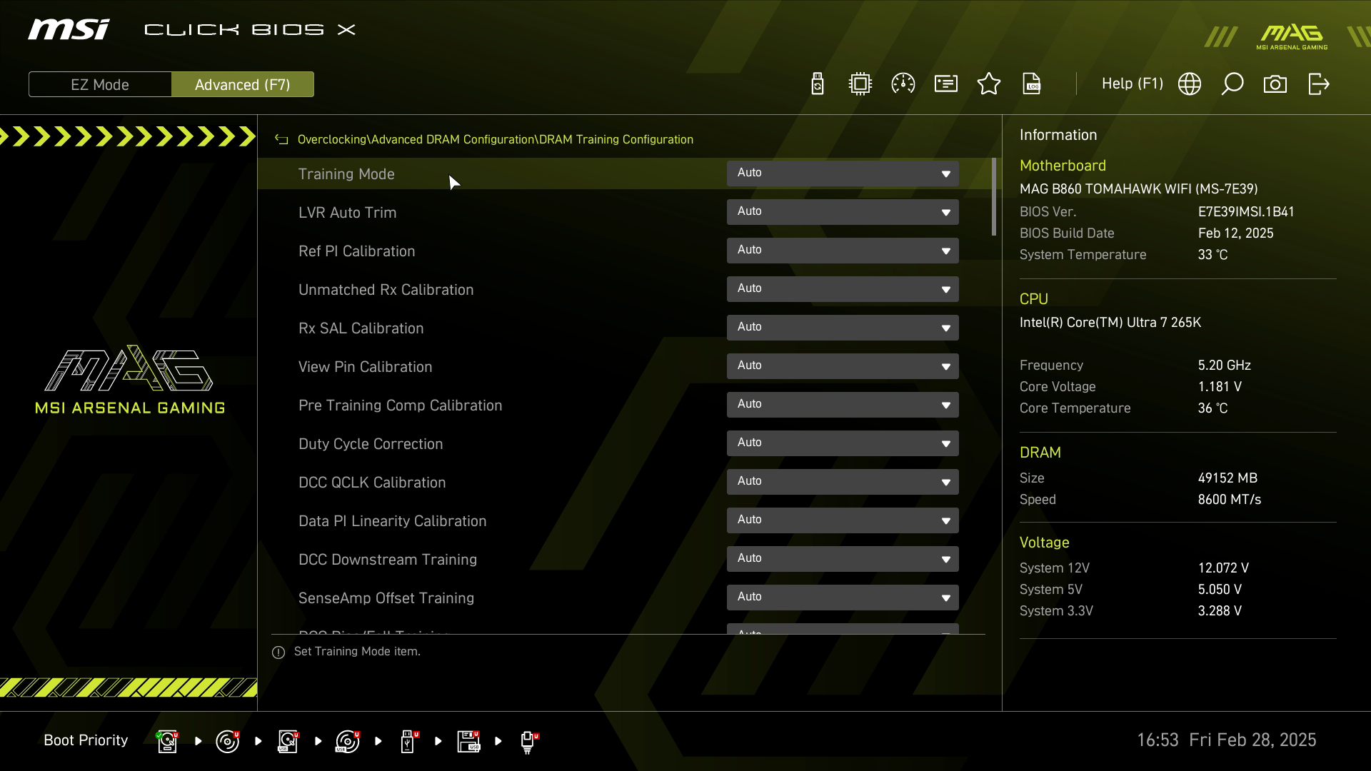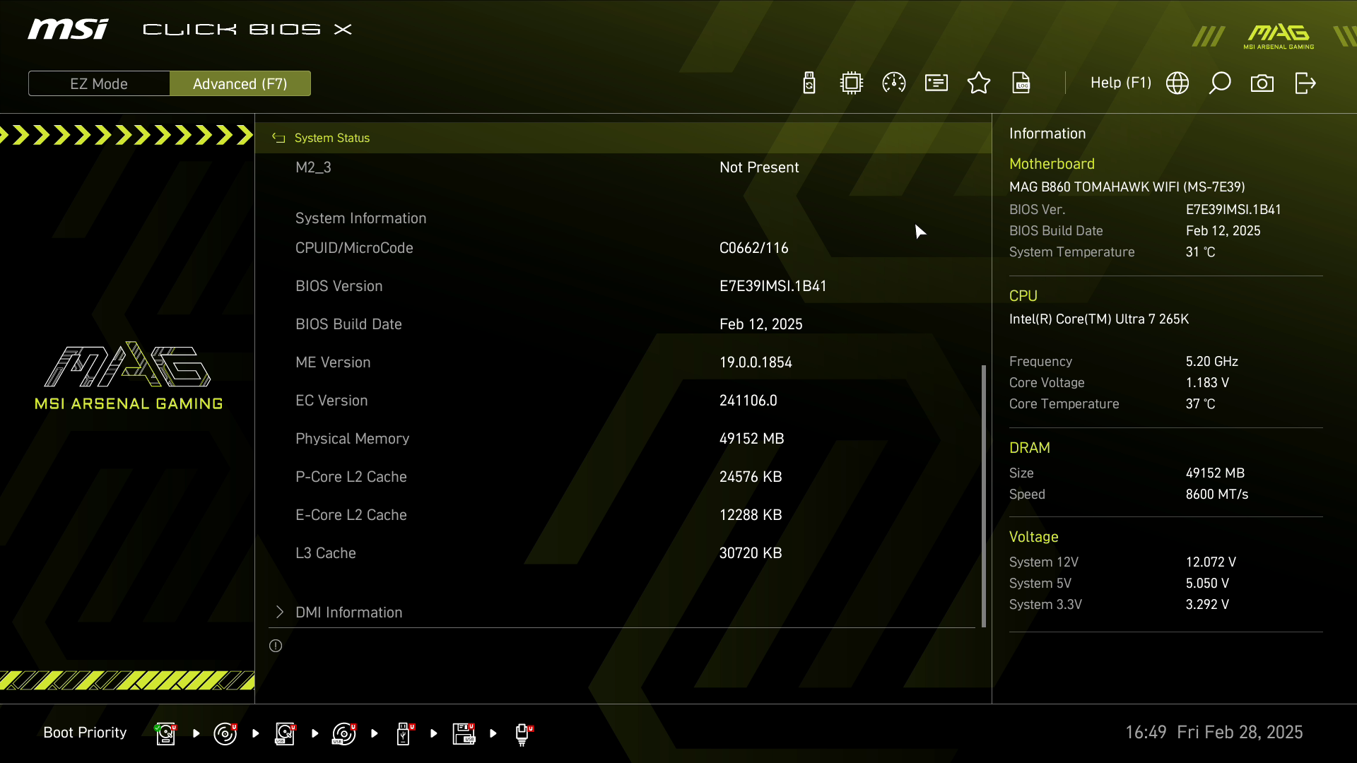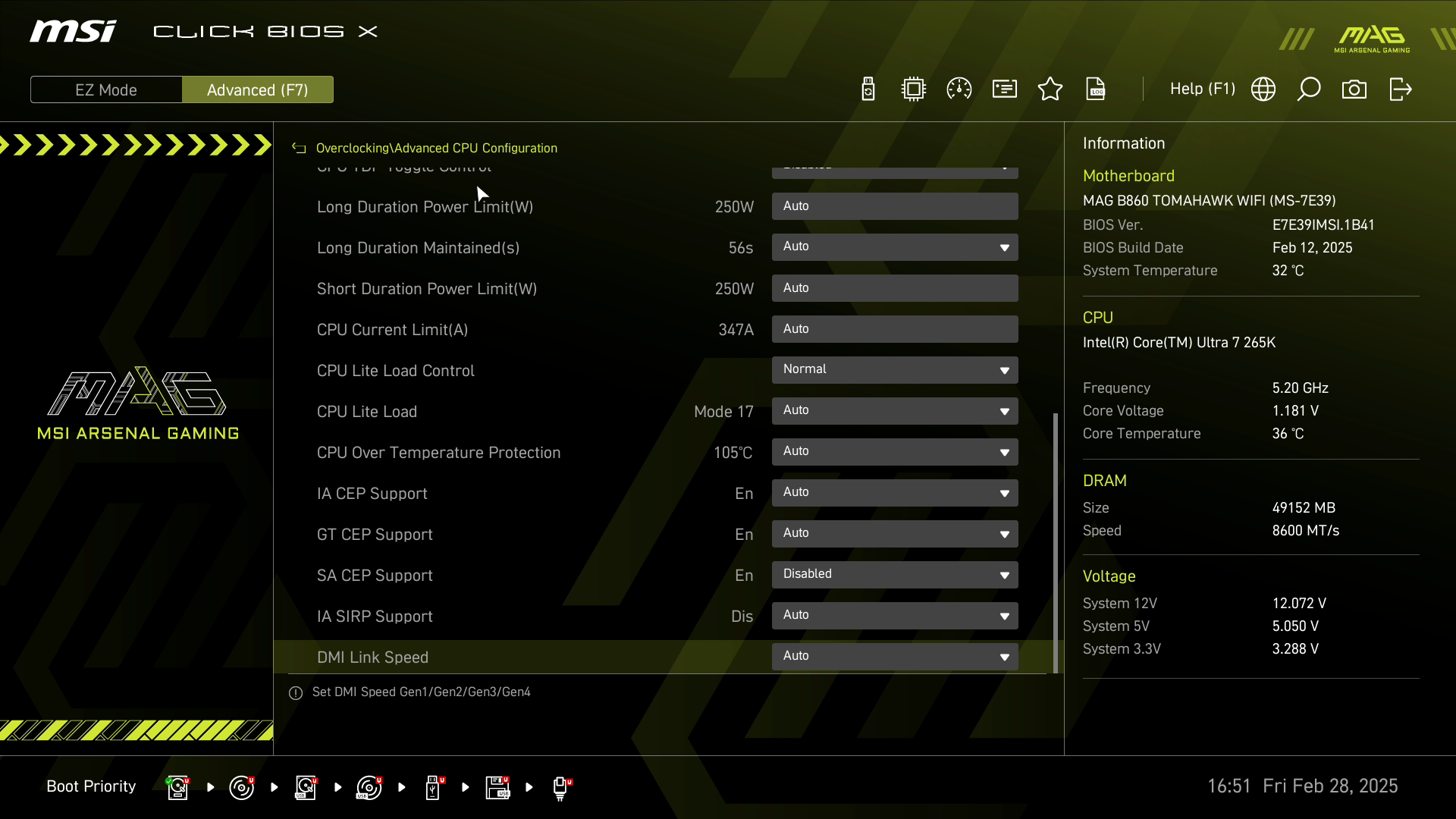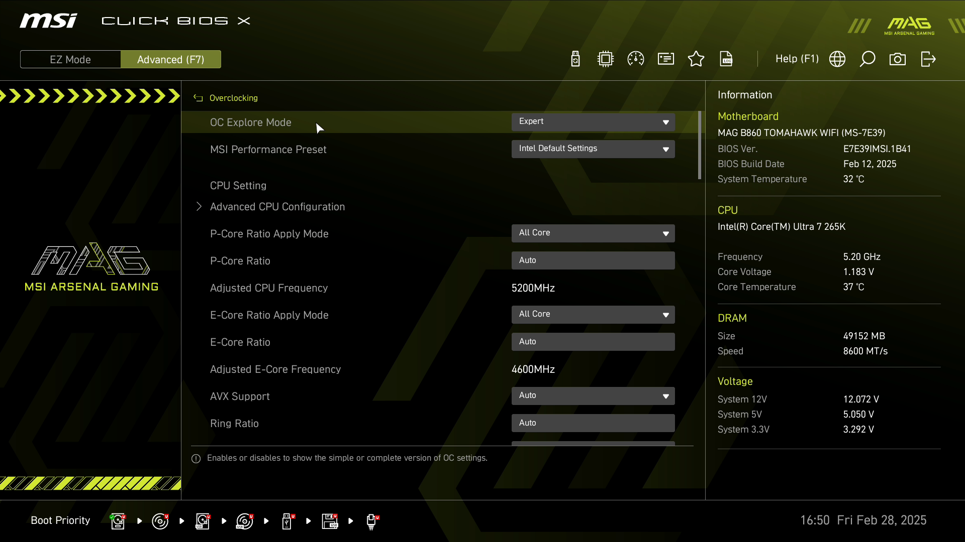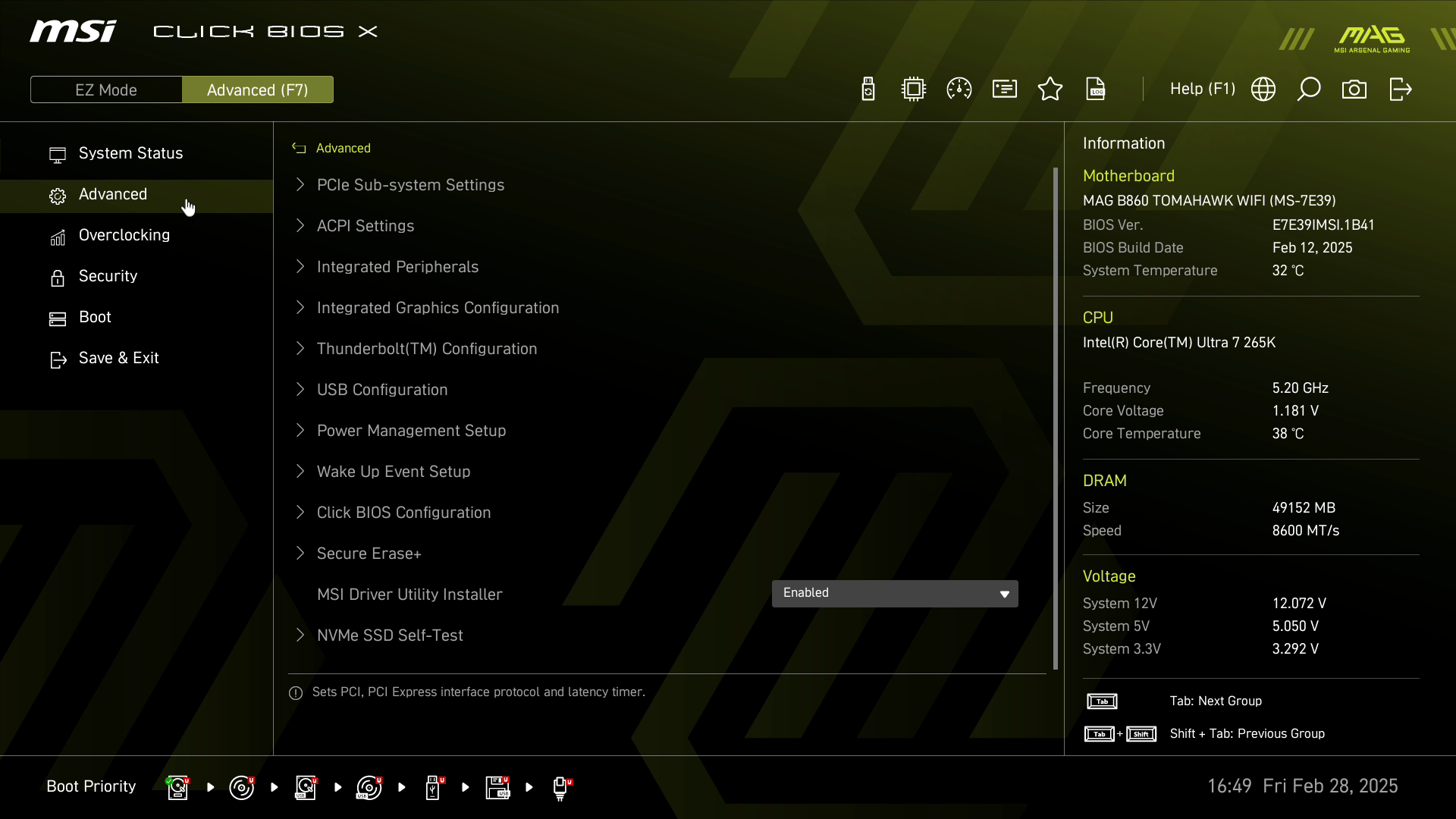 MAG B860 TOMAHAWK WIFI управляется через интерфейс MSI Click BIOS X, который оперируется в режимах EZ Mode и Advanced Mode.