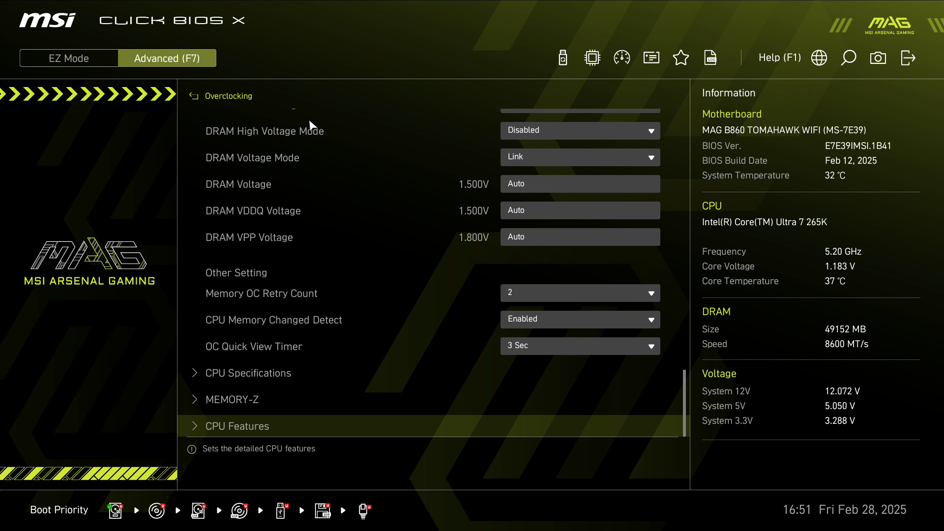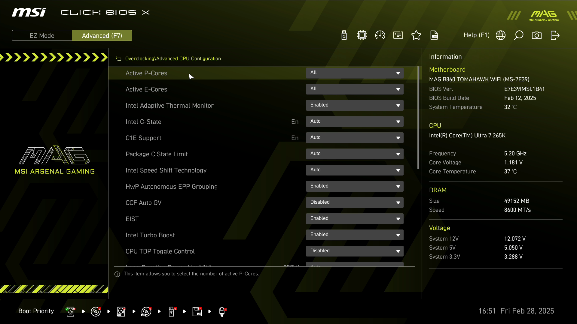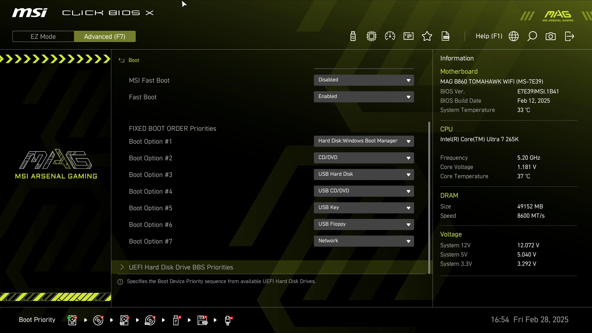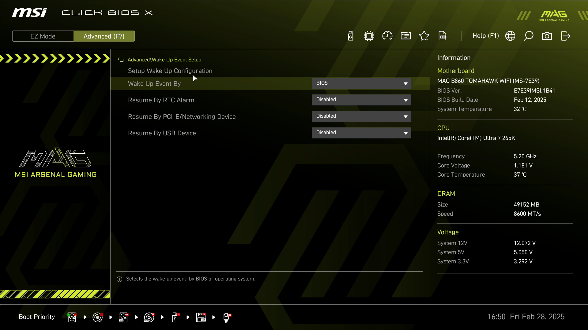MAG B860 TOMAHAWK WIFI управляется через интерфейс MSI Click BIOS X, который оперируется в режимах EZ Mode и Advanced Mode.