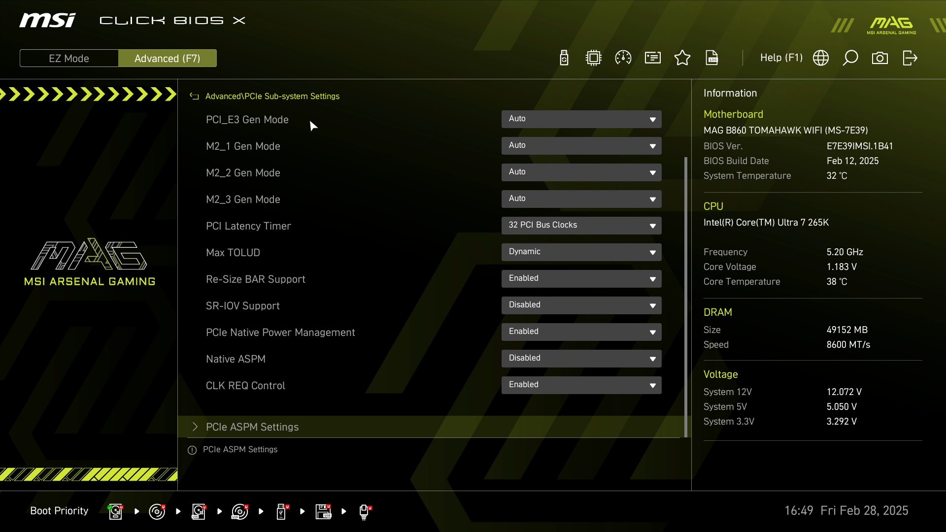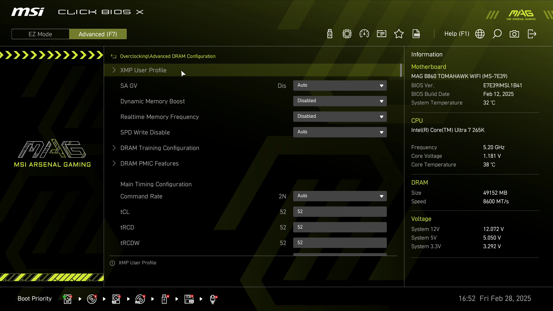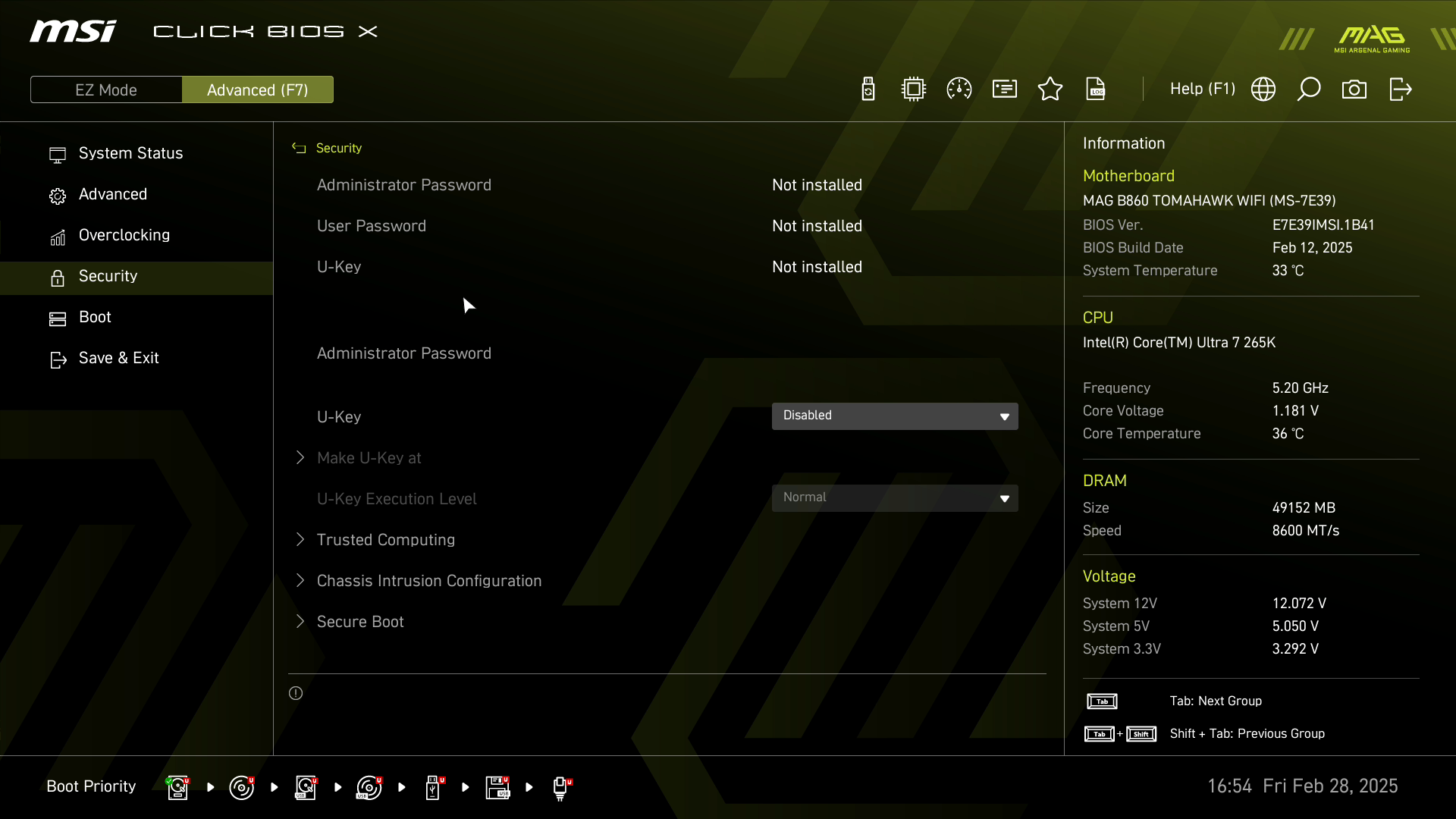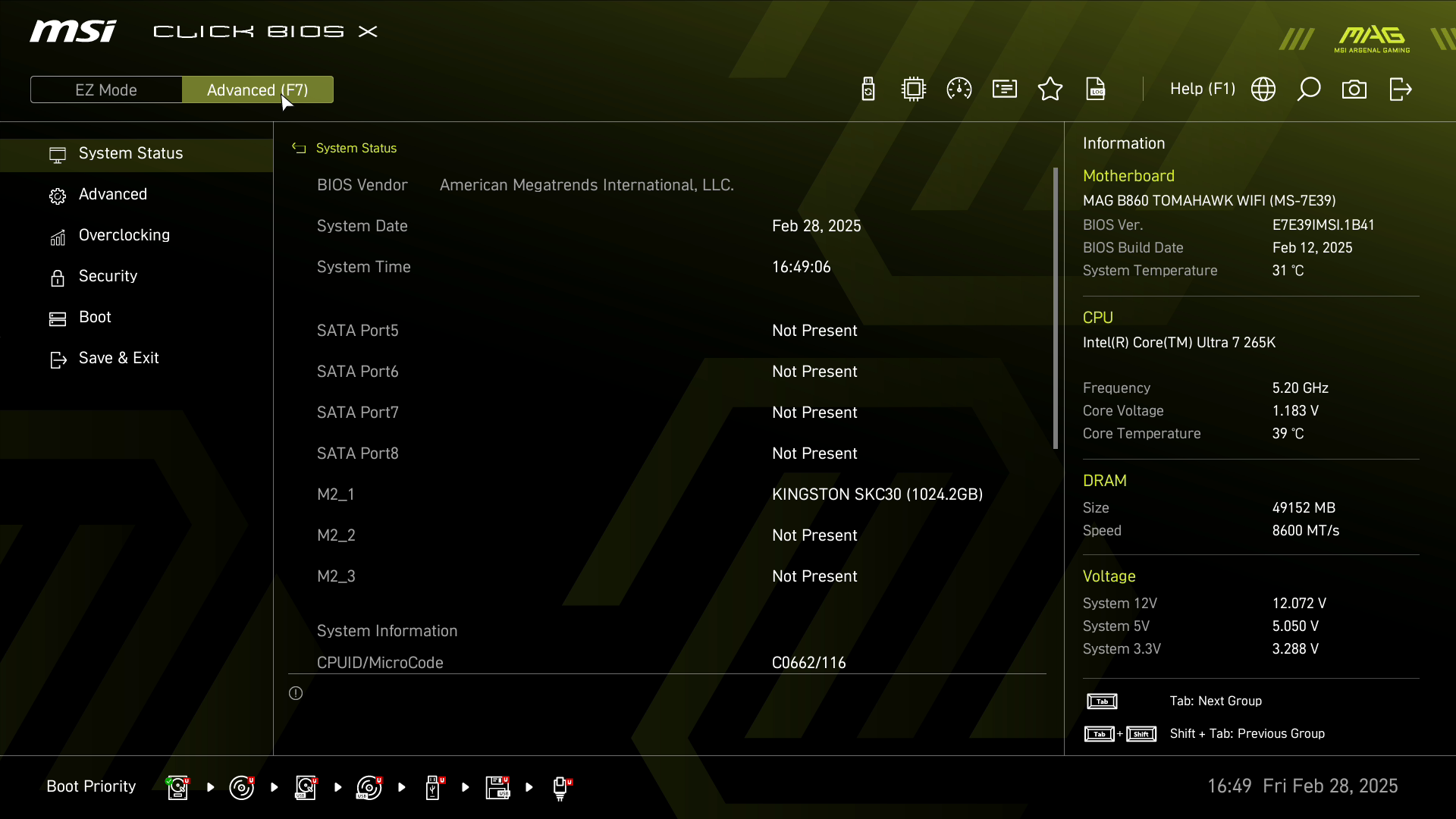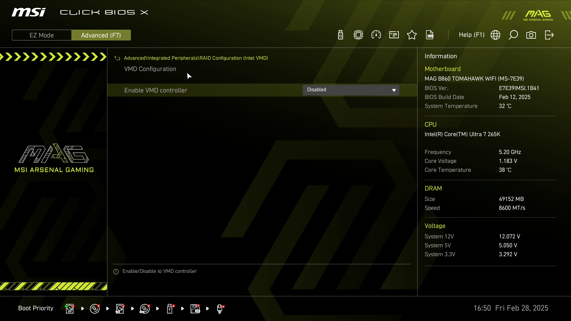 MAG B860 TOMAHAWK WIFI управляется через интерфейс MSI Click BIOS X, который оперируется в режимах EZ Mode и Advanced Mode.