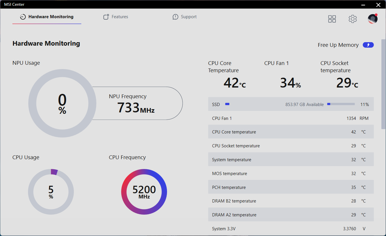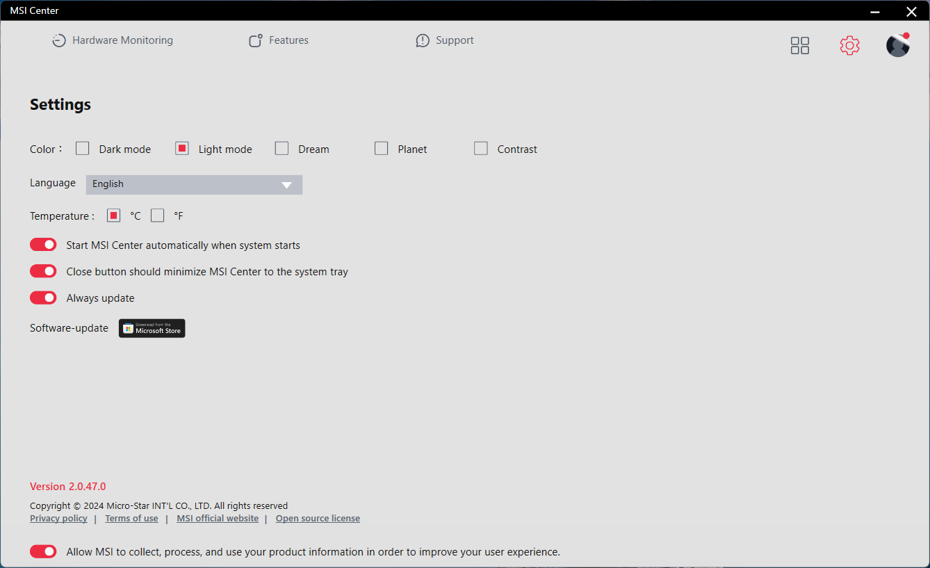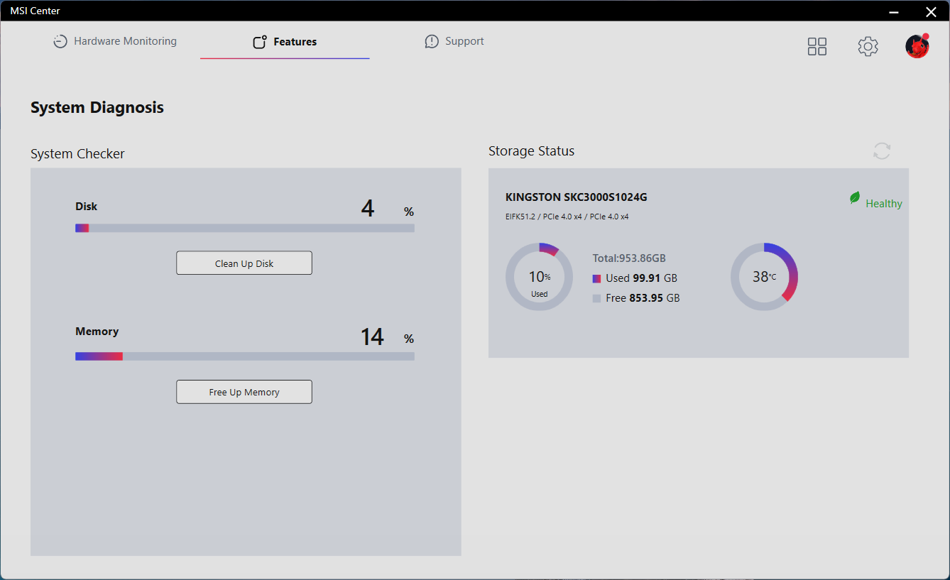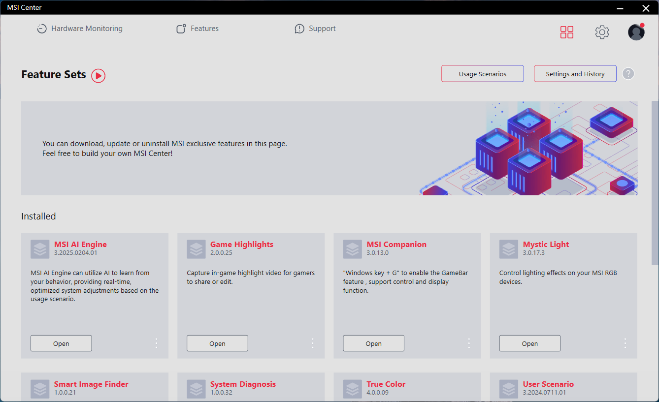 Главное ядро фирменного ПО производителя — MSI Center. Это модульное приложение, которое пользователь самостоятельно настраивает под свои задачи. Оно может быть простым средством мониторинга системы и материнской платы, но при необходимости — превратится в функциональный программный комплекс с богатыми возможностями.
