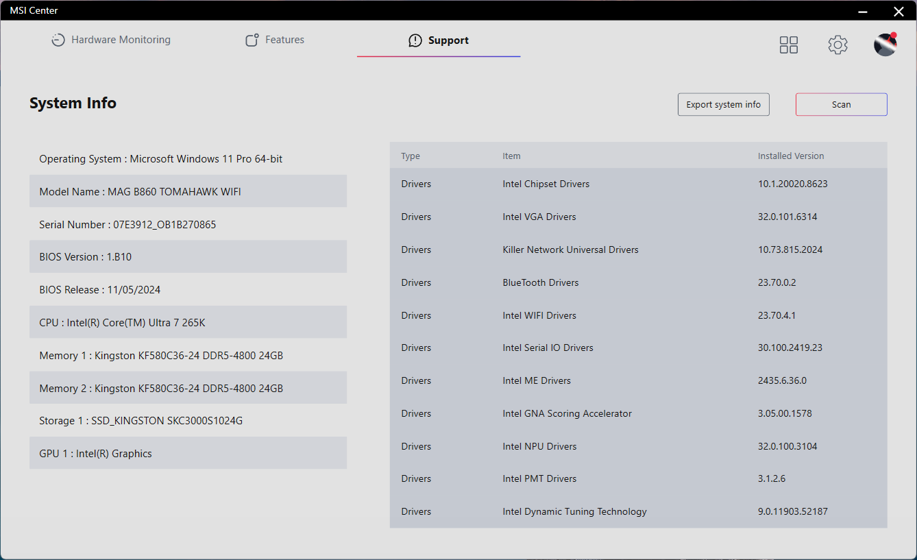 | Фирменное | MSI Center (MSI AI Engine, Game Highlights, MSI Companion, AI LAN Manager, Mystic Light, Super Charger +, System Diagnosis, True Color, Cooling Wizard, Live Update), MSI Display Kit |