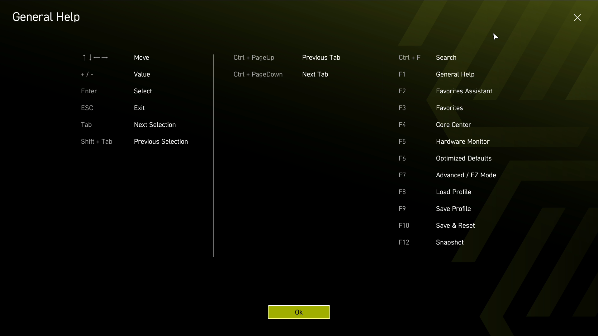 Панель меню сверху отображается статично в обоих режимах. Отсюда можно запустить обновление прошивки, вызвать меню избранных настроек (добавляются вручную), открыть журнал изменения параметров, получить отчет по CPU или DRAM, перейти в Hardware Monitor для контроля и настройки кривой оборотов/температур, найти необходимый параметр по поиску, выбрать язык интерфейса (украинского все еще нет), сделать скриншот и сохранить его на внешний накопитель, а также банально выйти из интерфейса настроек.