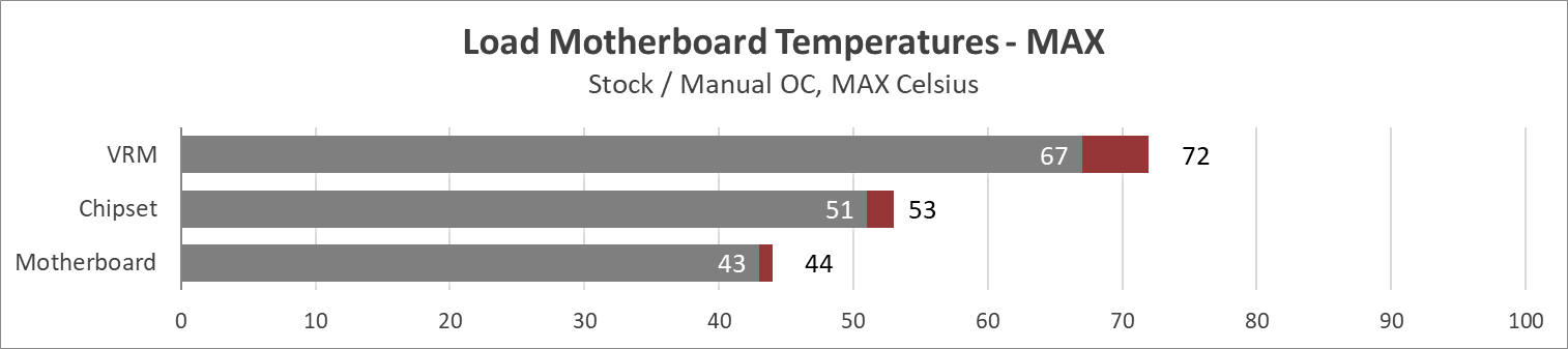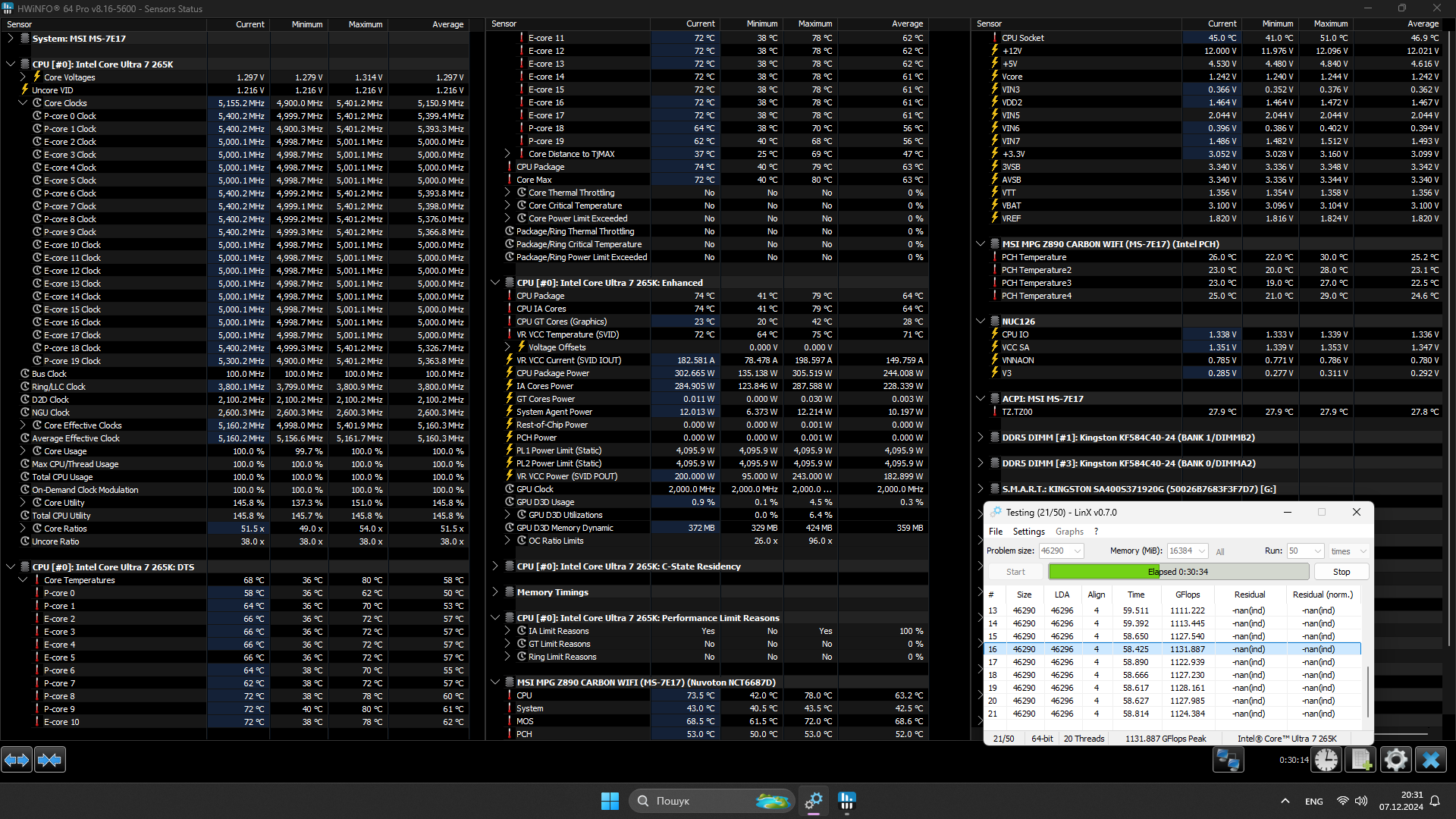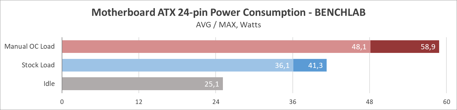 В режиме нагрузки при типичных настройках материнская плата удерживала среднюю частоту P-cores на уровне 5192 МГц с максимальным ускорением одного ядра до 5201 МГц. E-cores работали на средней частоте 4600 МГц. Глобальная средняя частота ядер составила 4836,8 МГц.