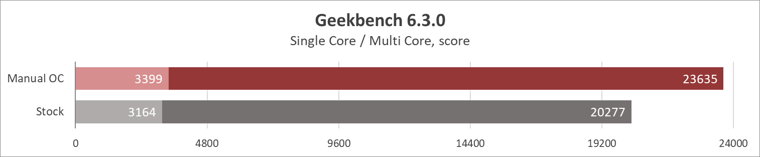 Хитрые ручонки оверклокера достигли средней частоты P-cores на уровне 5399,4 МГц. E-cores удерживались на статическом уровне 5000 МГц. Глобальная средняя частота ядер составила 5150 МГц.