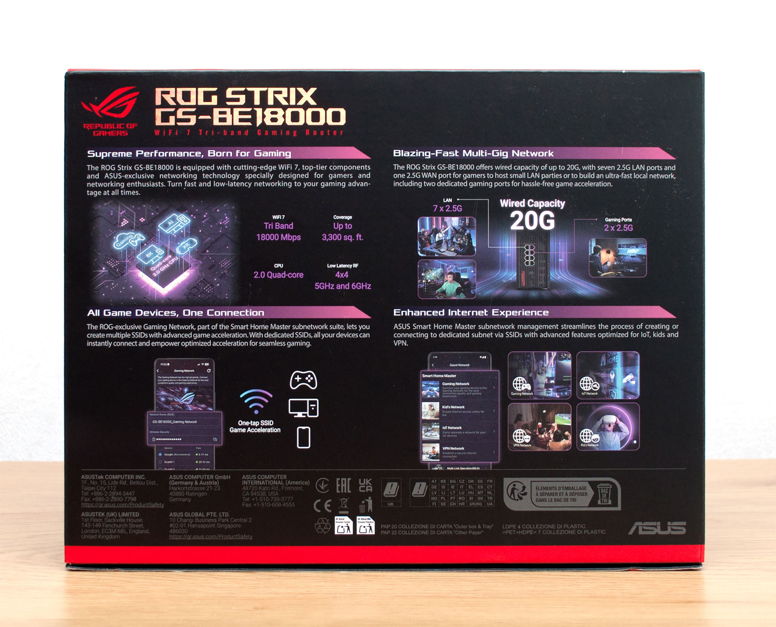В розничные торговые сети ASUS ROG STRIX GS-BE18000 поставляется в яркой картонной коробке, которая имеет относительно компактные габариты 380×250×126 мм при весе в 1150 г. В оформлении присутствуют элементы красного цвета — визитная карточка серии Republic of Gamers. На фоне фронтальной поверхности, половина которой заполнена градиентным рисунком, а вторая покрыта узором из названия серии и лозунга «FOR THOSE WHO DARE», можно увидеть наименование модели и изображение устройства, а также логотипы его основных возможностей, как-то обеспечение покрытия Wi-Fi на площади 300 кв. м, суммарную пропускную способность проводной сети 20 Гбит/с, срок гарантийного обслуживания 36 месяцев и пр.