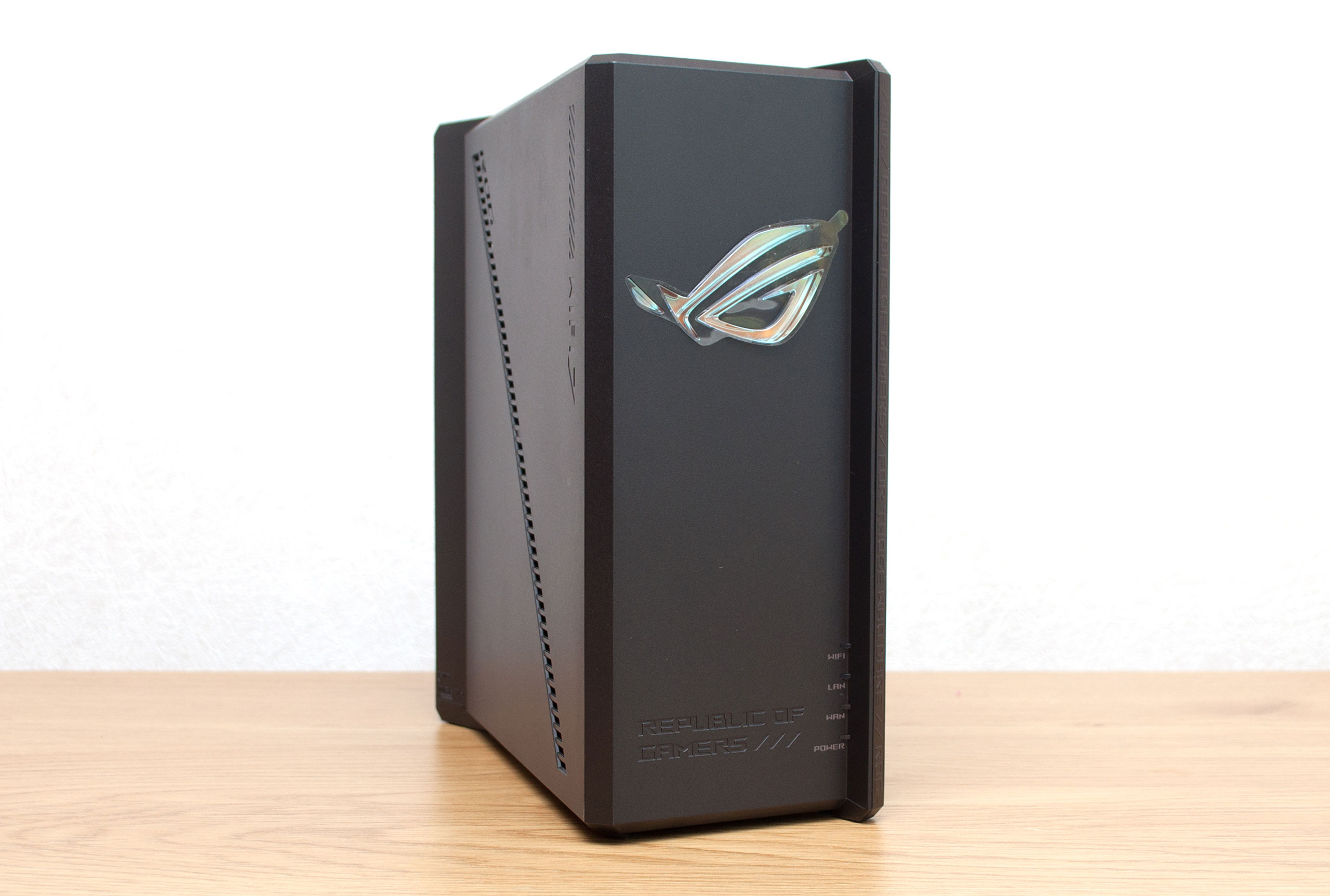 На передней панели находится украшение продукта — прозрачный логотип Republic of Gamers, который во время работы сияет всеми цветами радуги, и благодаря наличию AURA RGB пользователи могут настроить режим и цвет подсветки, или же полностью ее отключить. В нижней части выгравировано название серии продукта, а справа от нее виднеются четыре светодиодных индикатора белого цвета, сигнализирующих об активности WLAN и LAN, статусе подключения к Интернет-провайдеру и наличии питания.