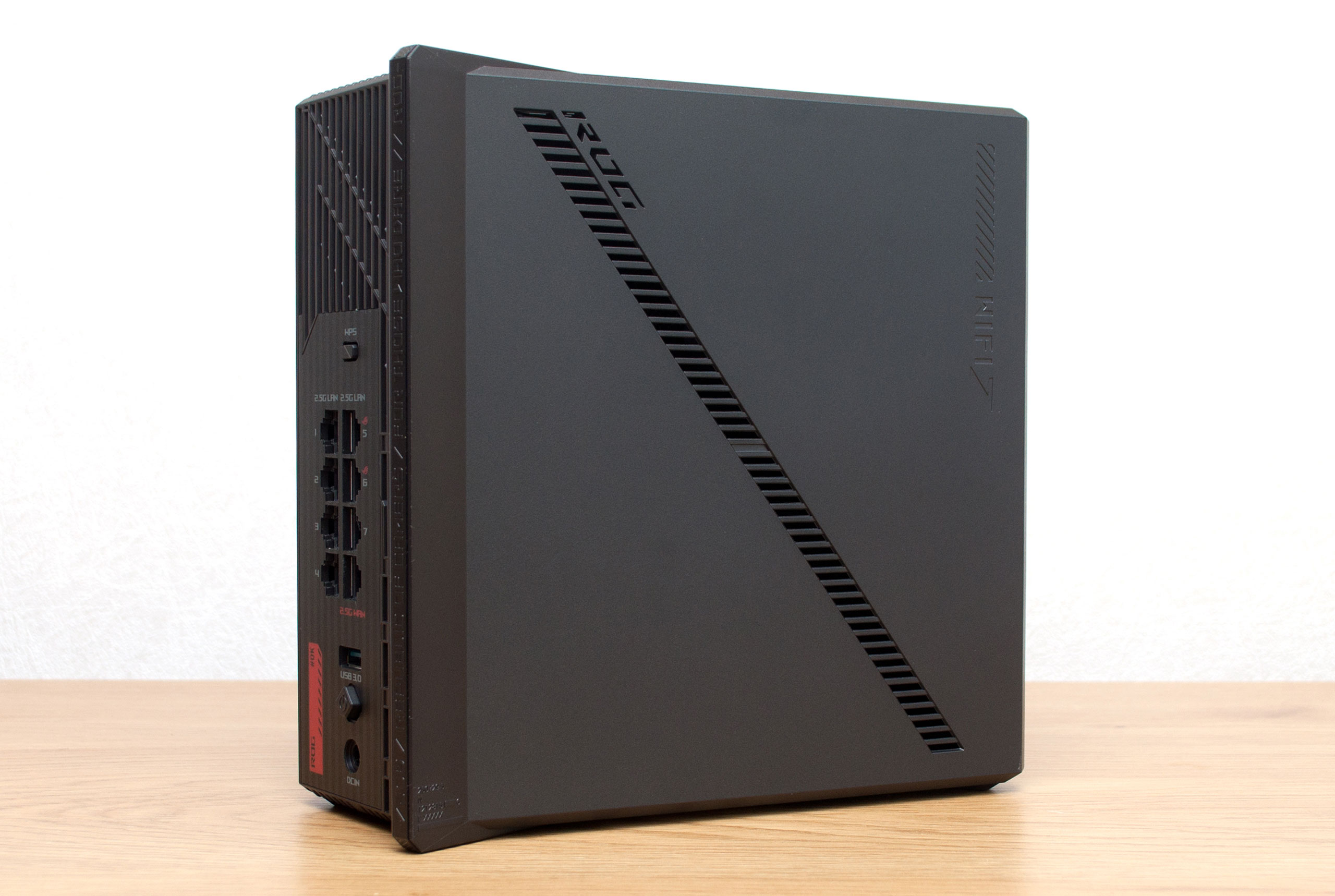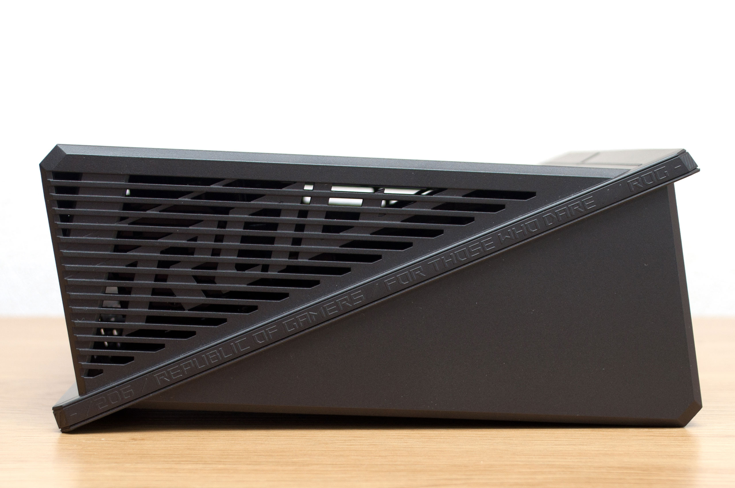 Левая боковина несет ряд вентиляционных отверстий, выстроившихся по диагонали от верхнего левого угла в правый нижний. Внимательные читатели точно заметили отсутствие внешних антенн и не зря, ведь у ROG STRIX GS-BE18000 все они внутренние, а их общее количество достигает восьми штук.