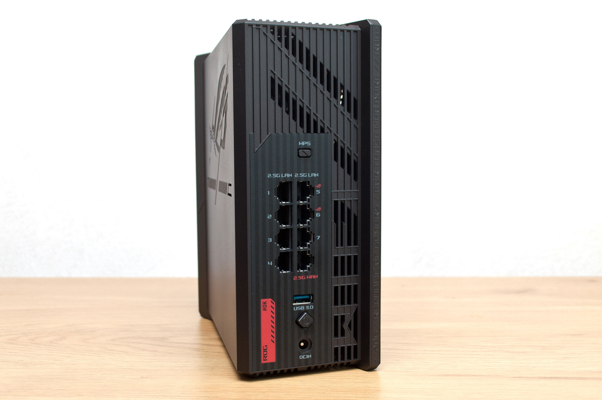 На задней панели беспроводного маршрутизатора помимо кнопки WPS для быстрого подключения клиентов Wi-Fi расположены семь портов RJ-45 для LAN и один WAN — все с поддержкой 2.5G BaseT Ethernet. Пятый и шестой разъемы, обозначенные логотипом ROG, обеспечивают автоматическое повышение приоритета игрового трафика для подключенных клиентов. Суммарная пропускная способность проводной подсистемы достигает 20 Гбит/с — довольно внушительное значение как для домашнего устройства. Под сетевыми портами находится порт USB 3.2 Gen1 Type‑A, разъем для подключения внешнего блока питания и кнопка включения устройства. Также, следует отметить наличие значительного количества вентиляционных отверстий на задней панели.