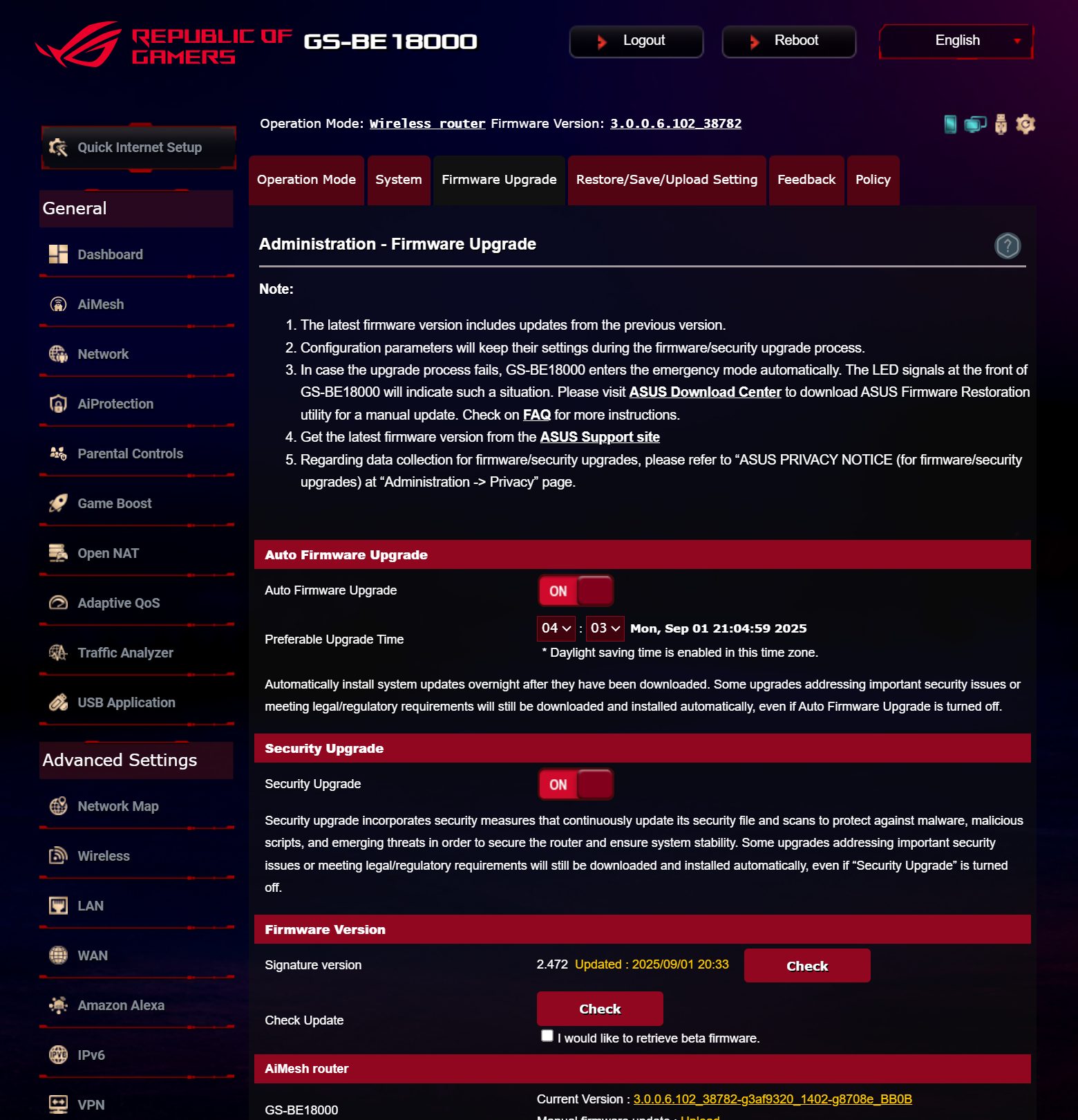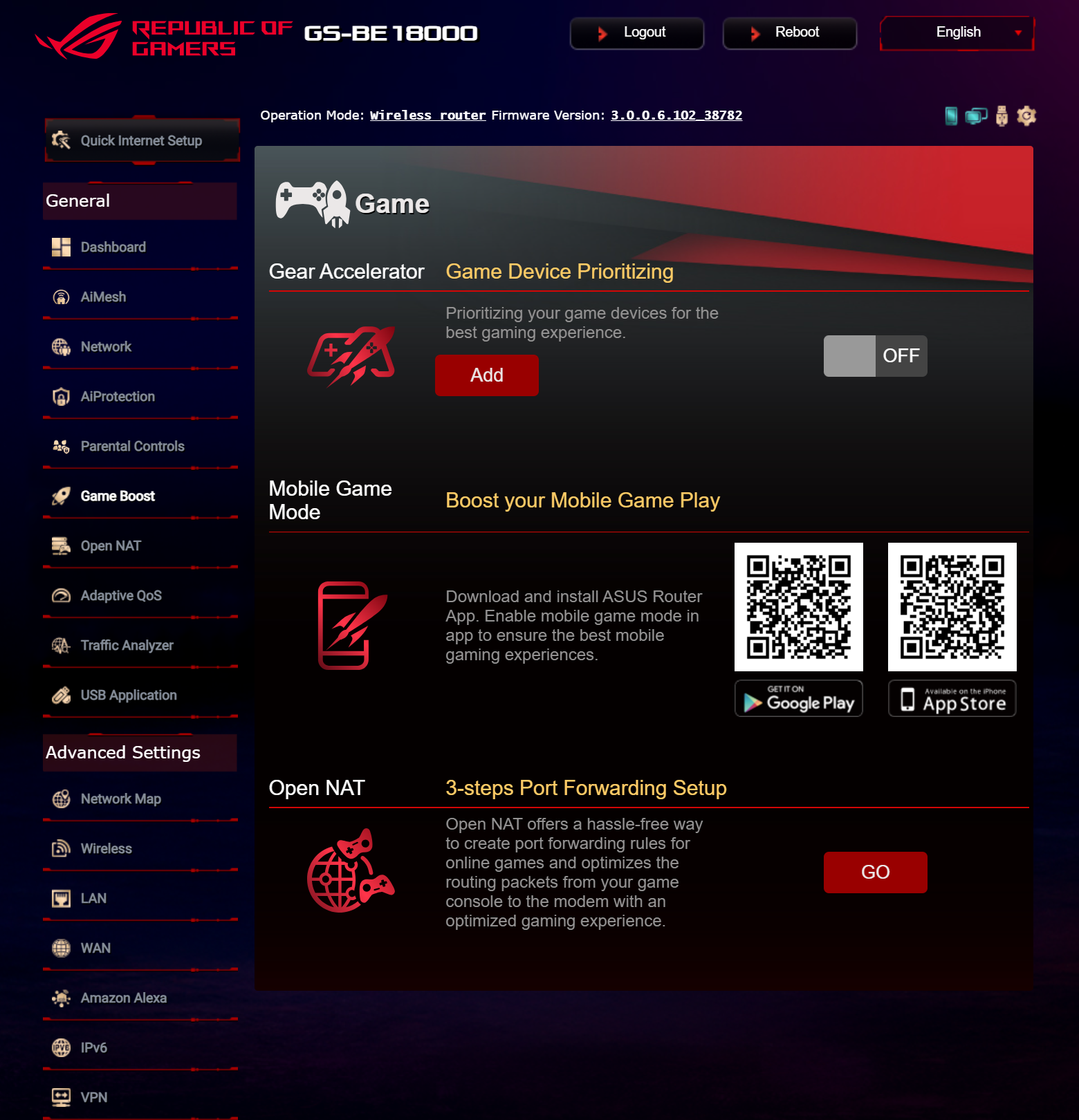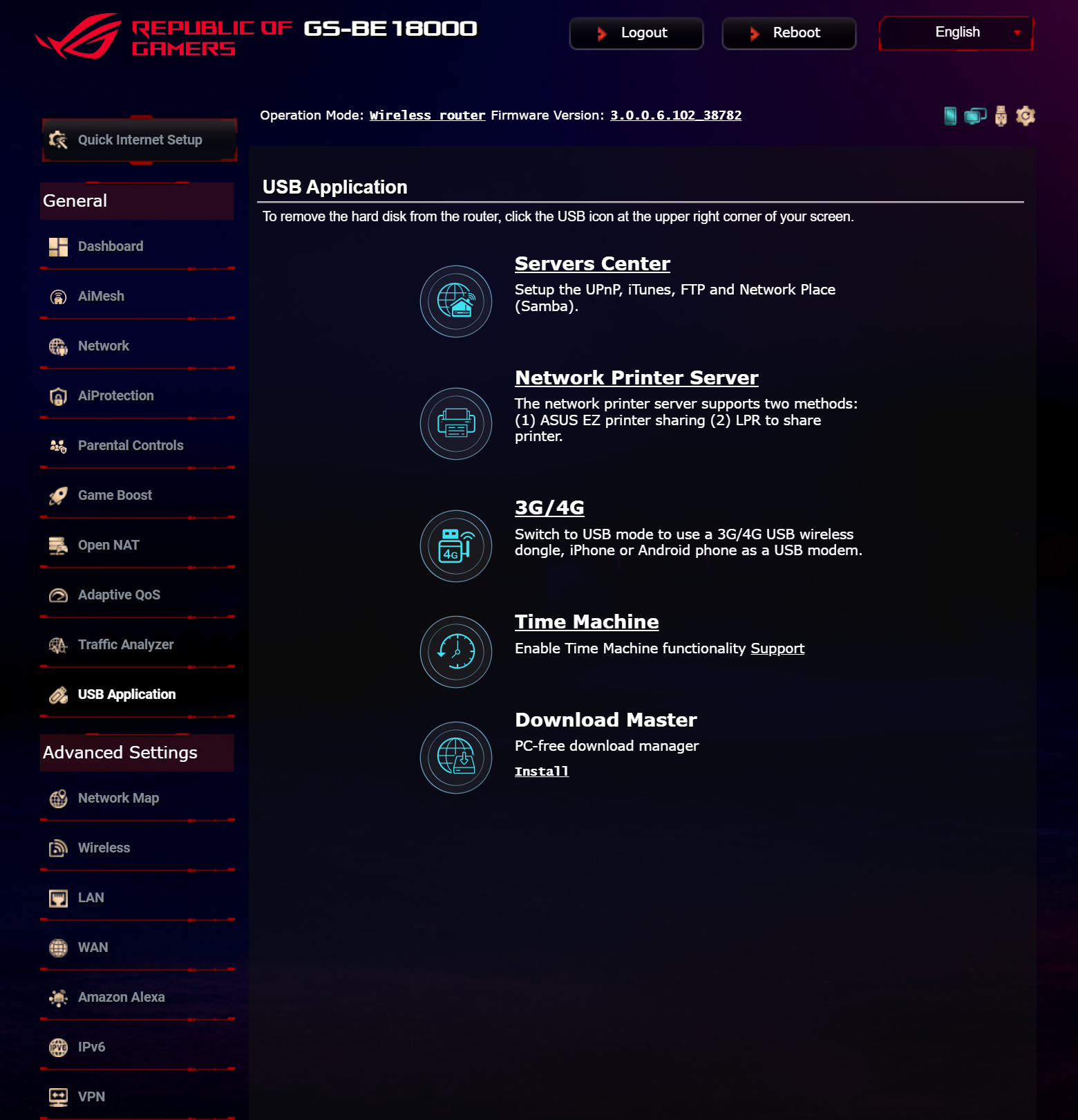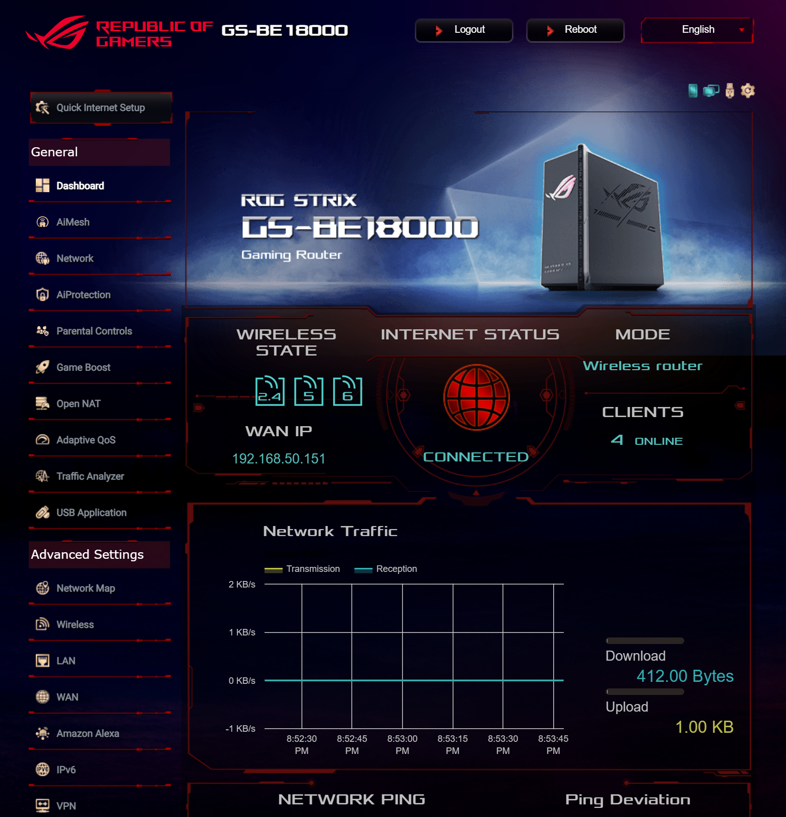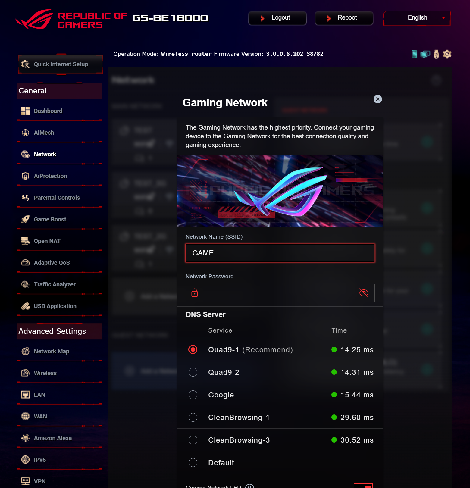 ASUS ROG STRIX GS-BE18000 оснащен прошивкой ASUSWRT 5.0 на базе операционной системы Linux. Интерфейс пользователя имеет черты, присущие серии Republic of Gamers, в частности, цветовую гамму в красных тонах и вкладку Dashboard, на которую выведен статус подключения к сети Интернет и состояние Wi-Fi, мониторинг трафика, а также мгновенное значение задержки доступа к сети и его среднее отклонение. Кроме того, Dashboard позволяет управлять подсветкой AURA RGB и искать серверы популярных онлайн игр с наименьшей задержкой.