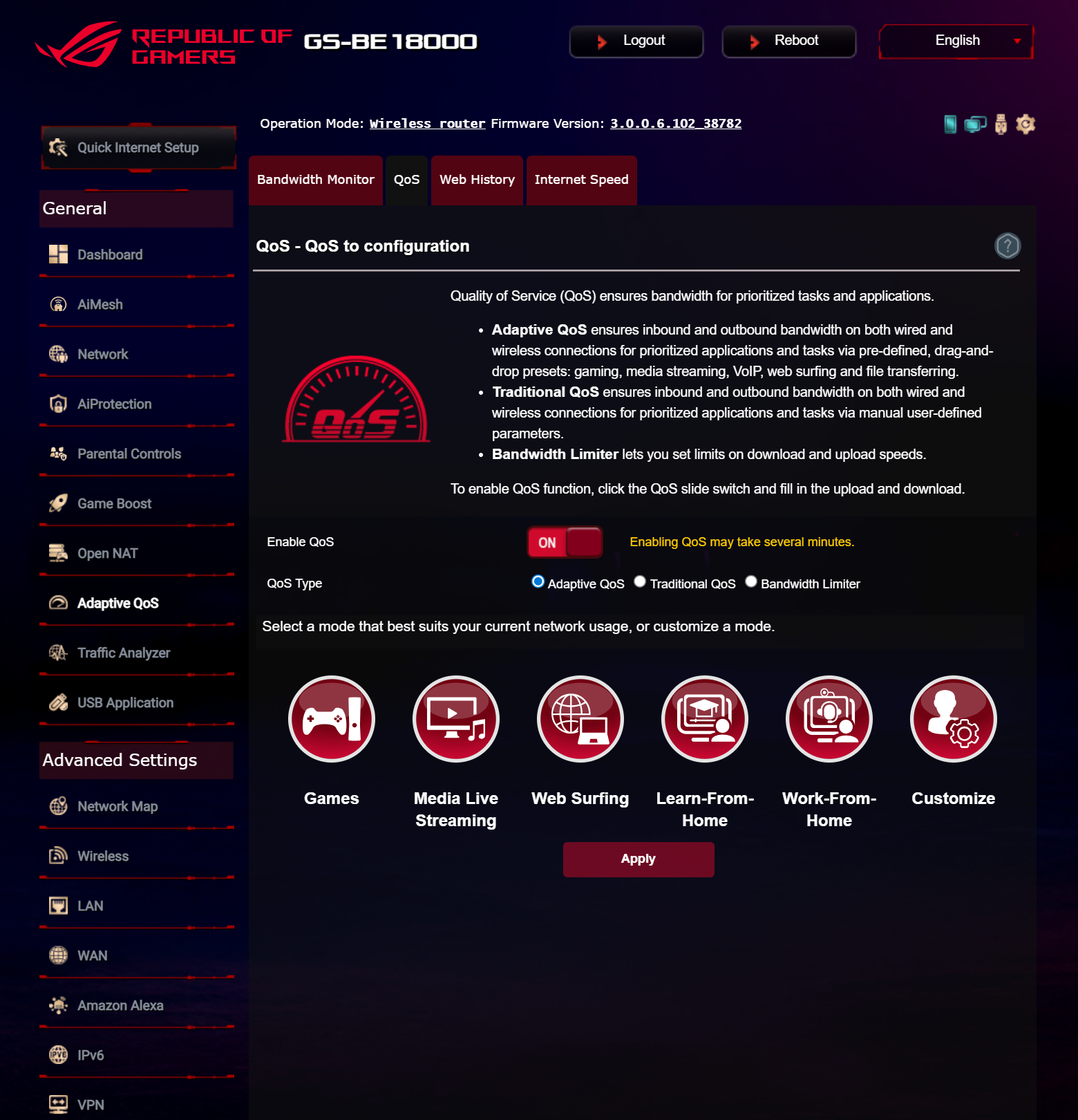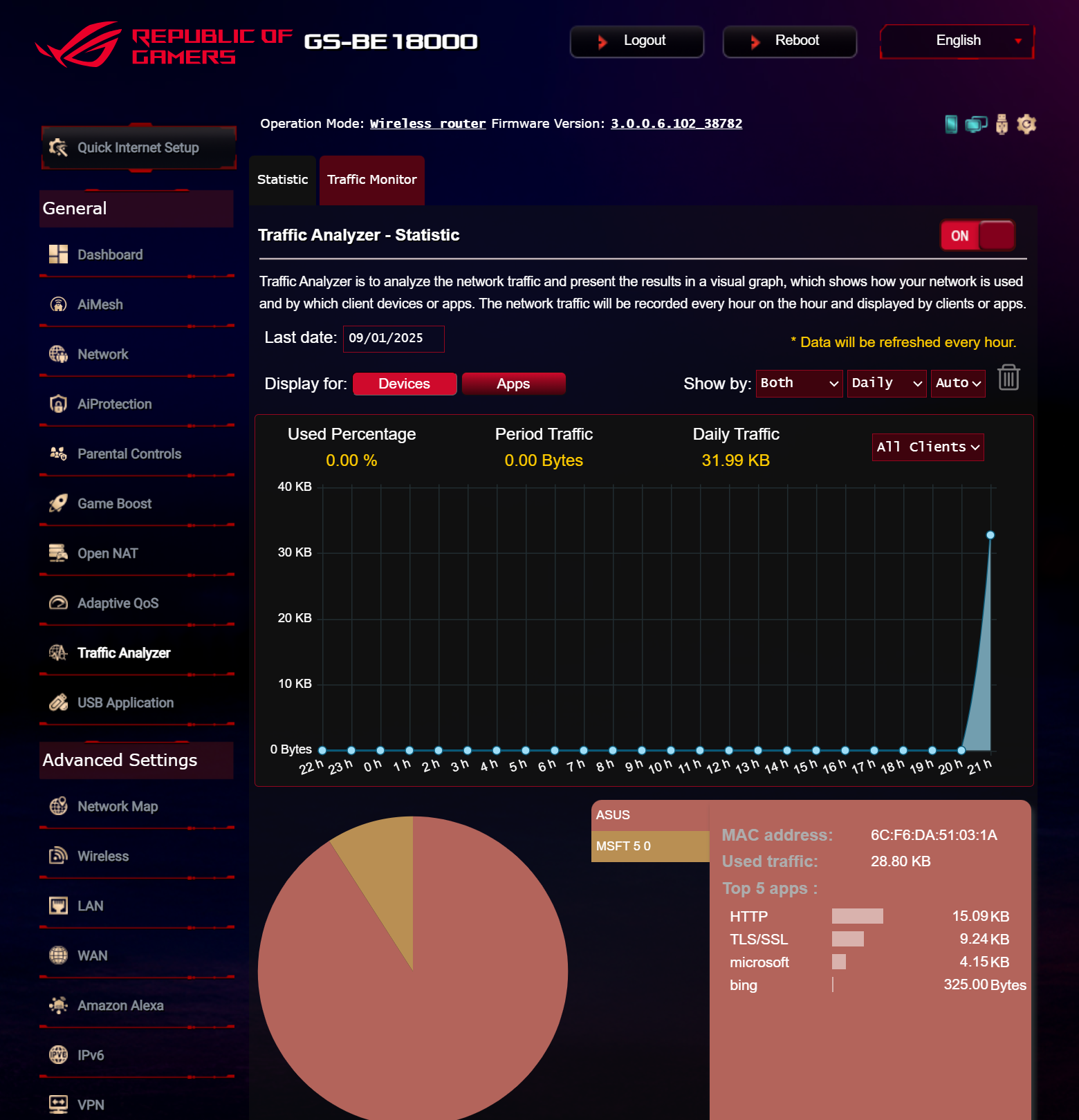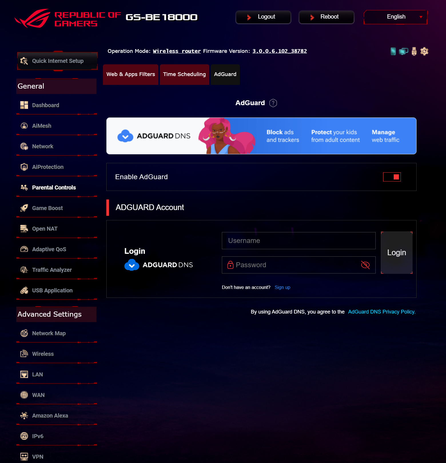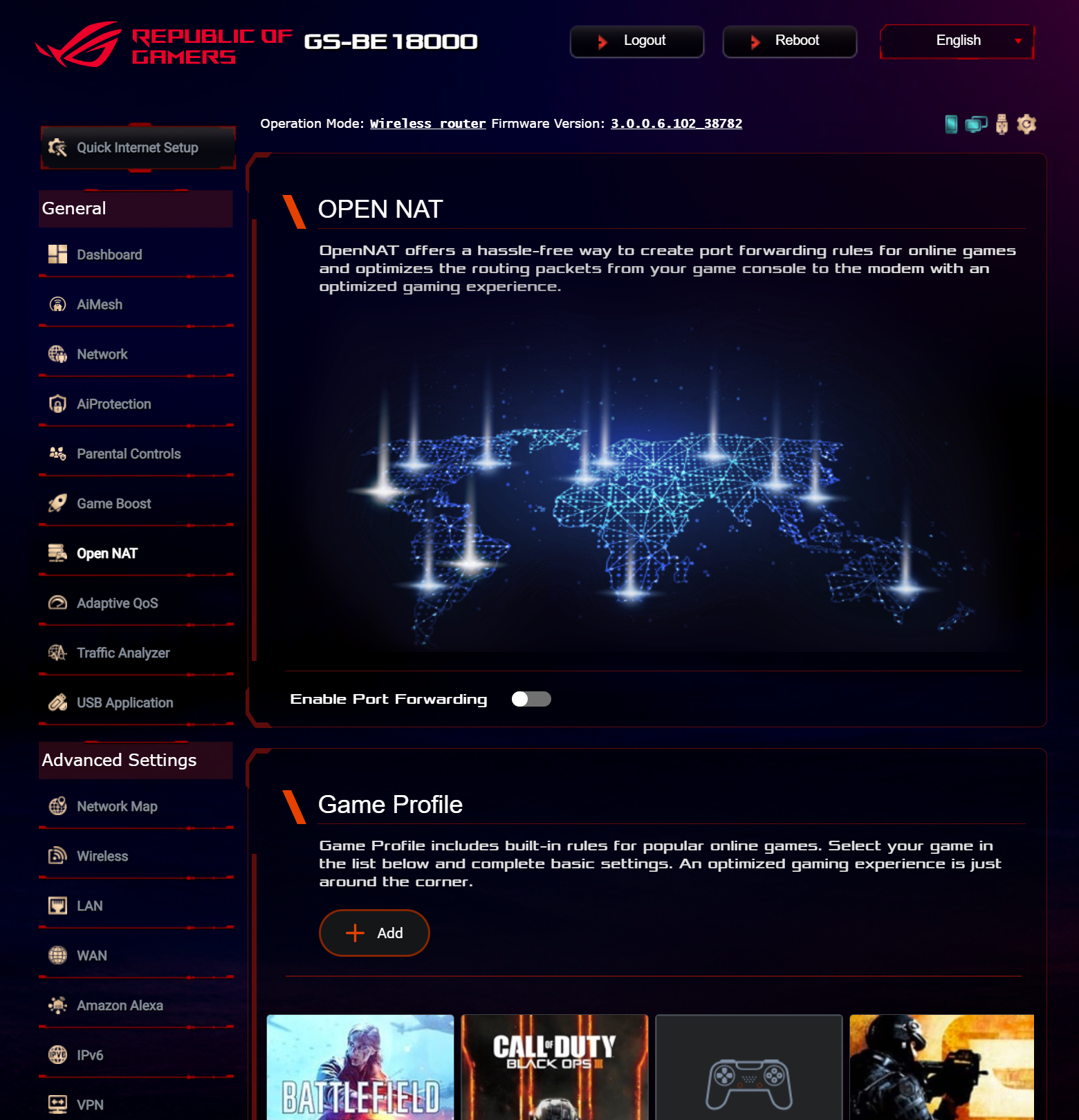 ASUS ROG STRIX GS-BE18000 оснащен прошивкой ASUSWRT 5.0 на базе операционной системы Linux. Интерфейс пользователя имеет черты, присущие серии Republic of Gamers, в частности, цветовую гамму в красных тонах и вкладку Dashboard, на которую выведен статус подключения к сети Интернет и состояние Wi-Fi, мониторинг трафика, а также мгновенное значение задержки доступа к сети и его среднее отклонение. Кроме того, Dashboard позволяет управлять подсветкой AURA RGB и искать серверы популярных онлайн игр с наименьшей задержкой.