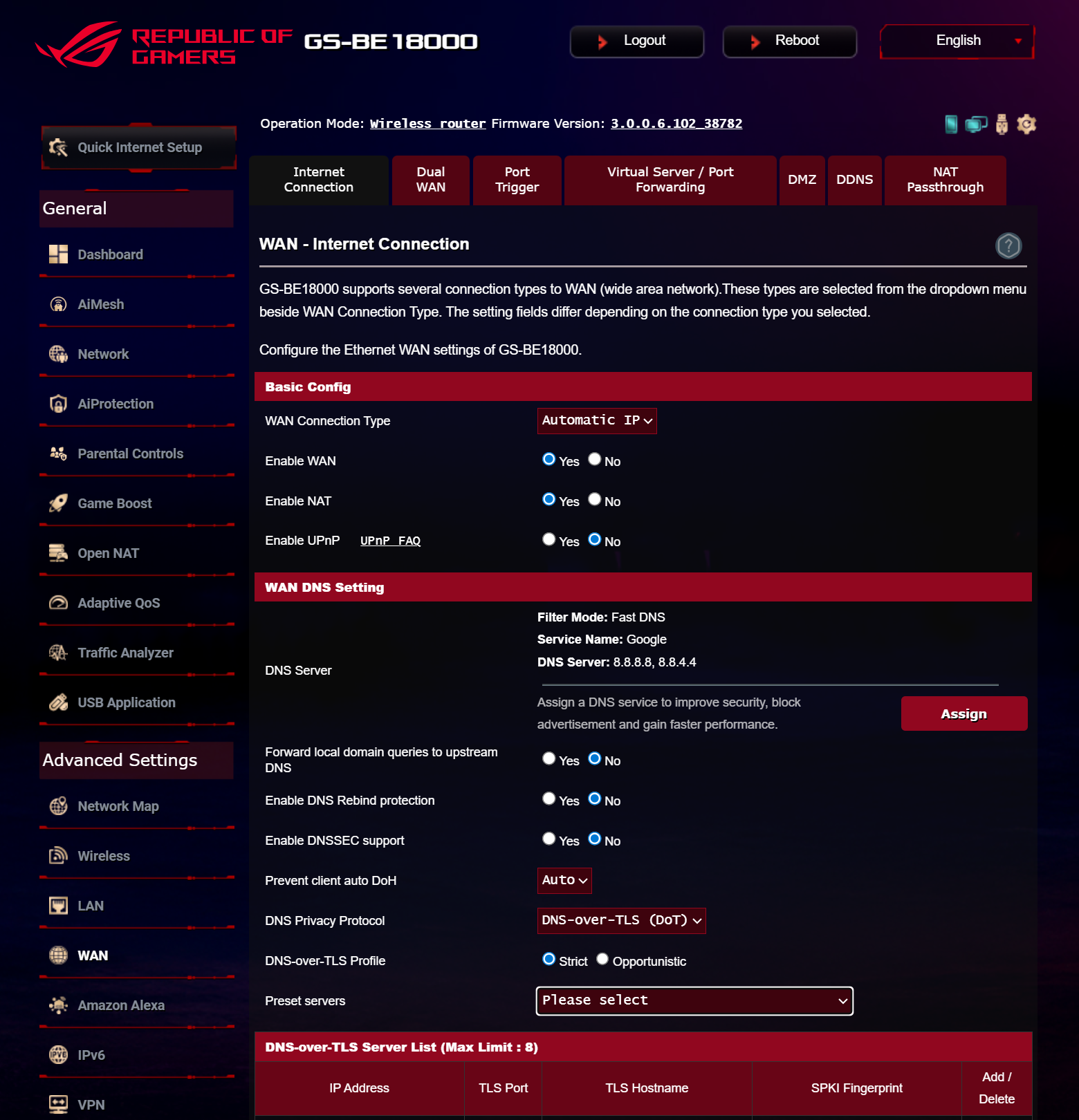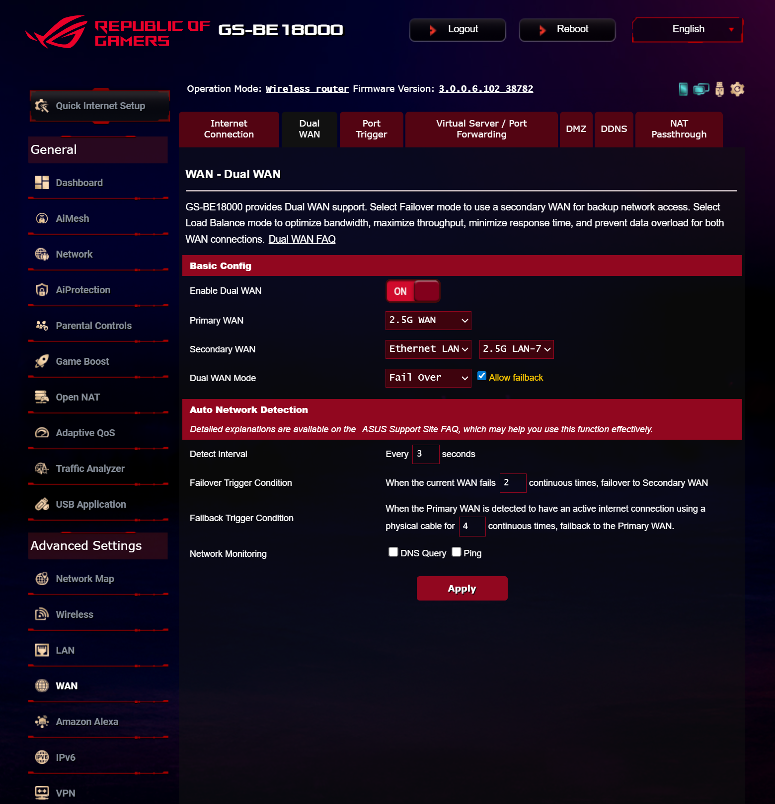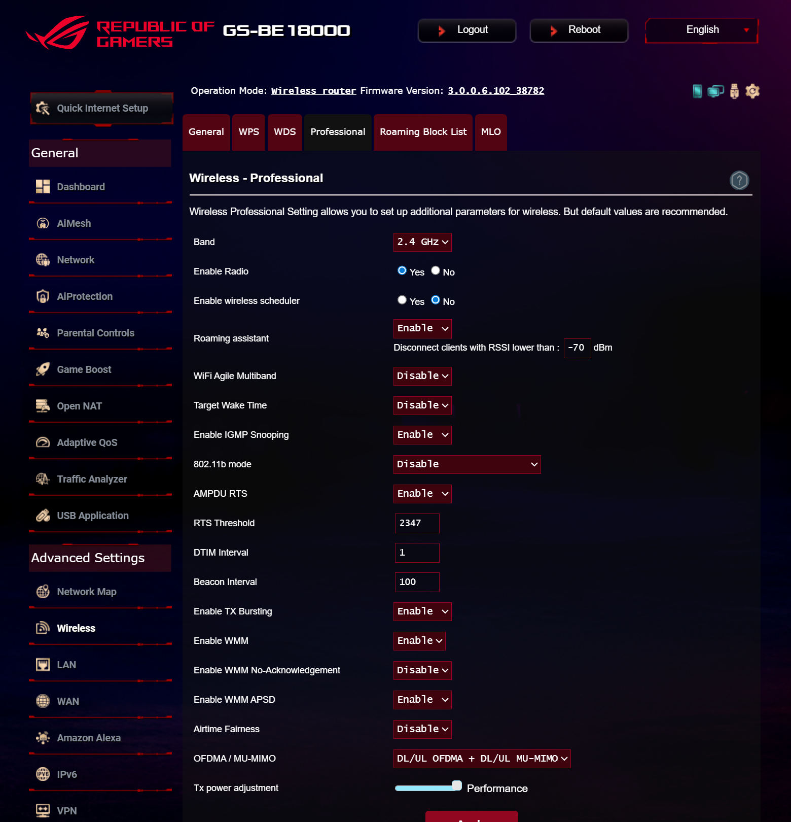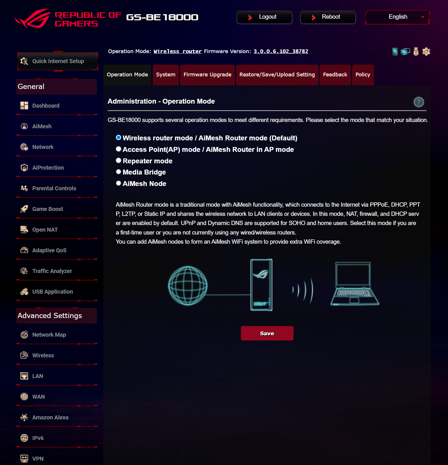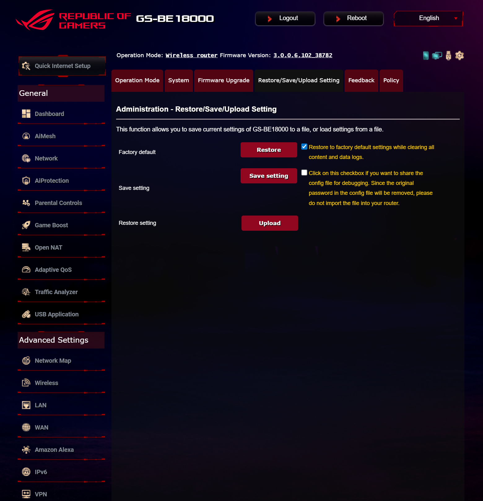 ASUS ROG STRIX GS-BE18000 оснащен прошивкой ASUSWRT 5.0 на базе операционной системы Linux. Интерфейс пользователя имеет черты, присущие серии Republic of Gamers, в частности, цветовую гамму в красных тонах и вкладку Dashboard, на которую выведен статус подключения к сети Интернет и состояние Wi-Fi, мониторинг трафика, а также мгновенное значение задержки доступа к сети и его среднее отклонение. Кроме того, Dashboard позволяет управлять подсветкой AURA RGB и искать серверы популярных онлайн игр с наименьшей задержкой.