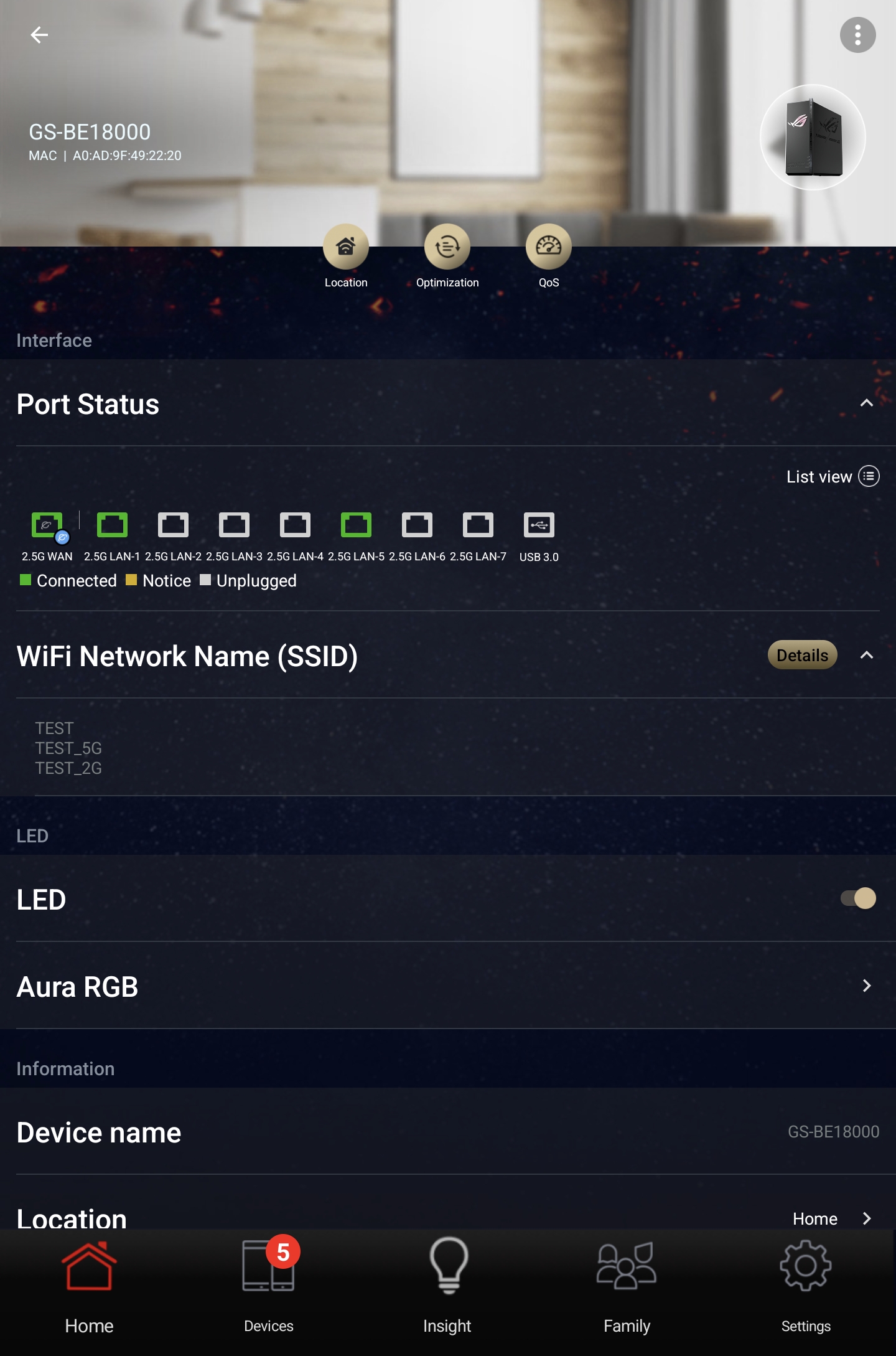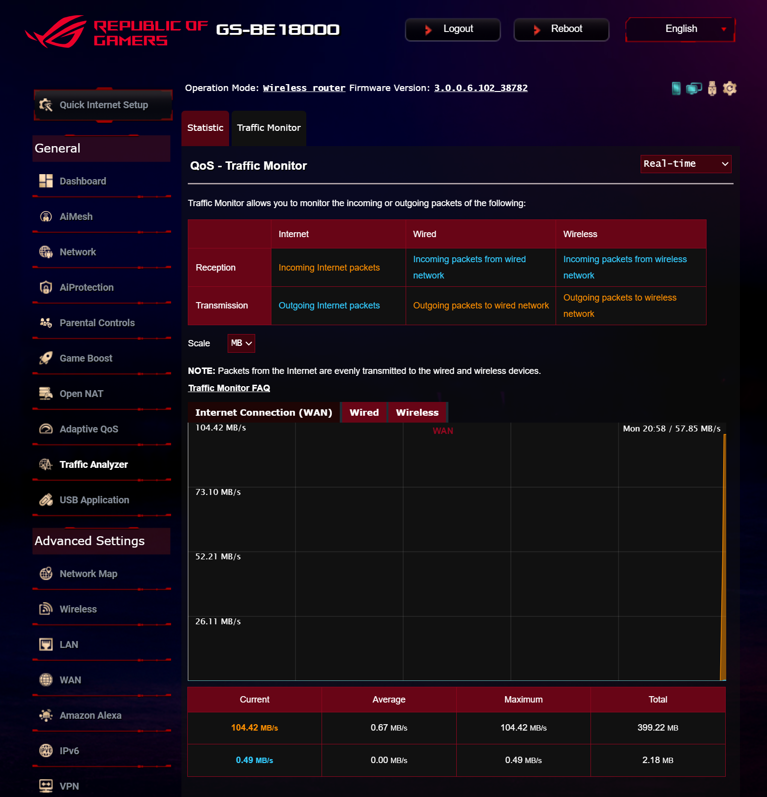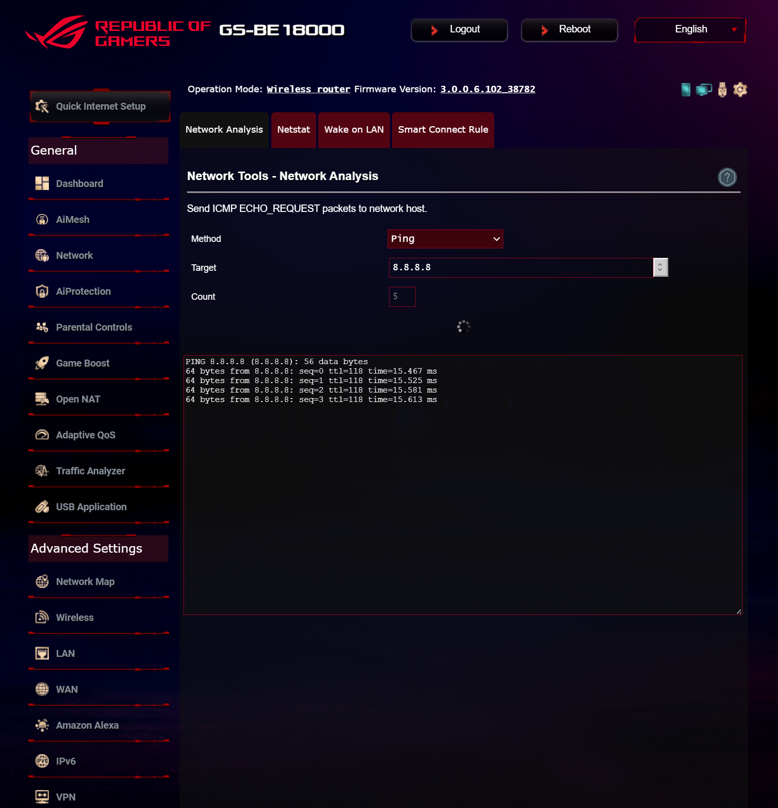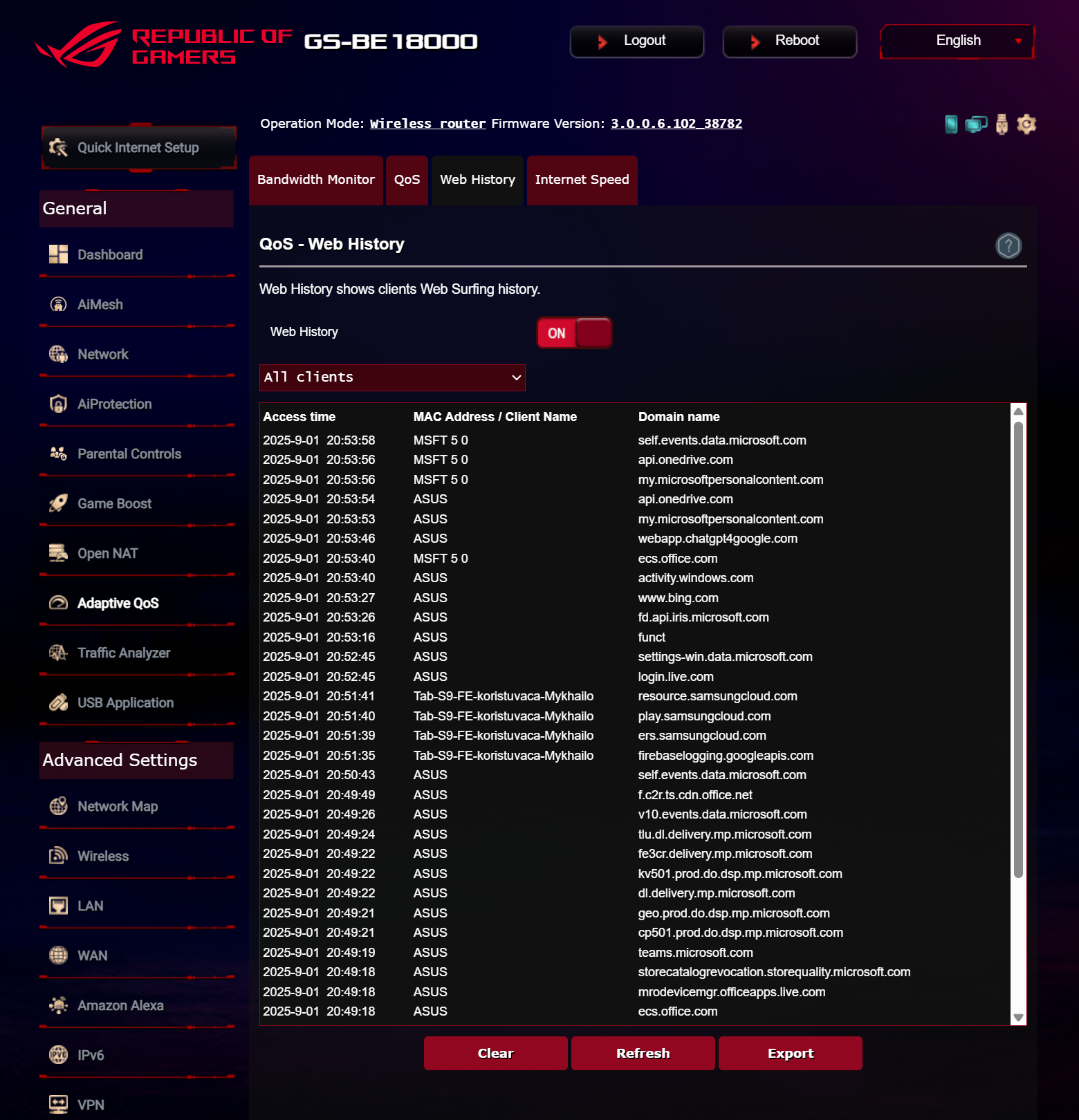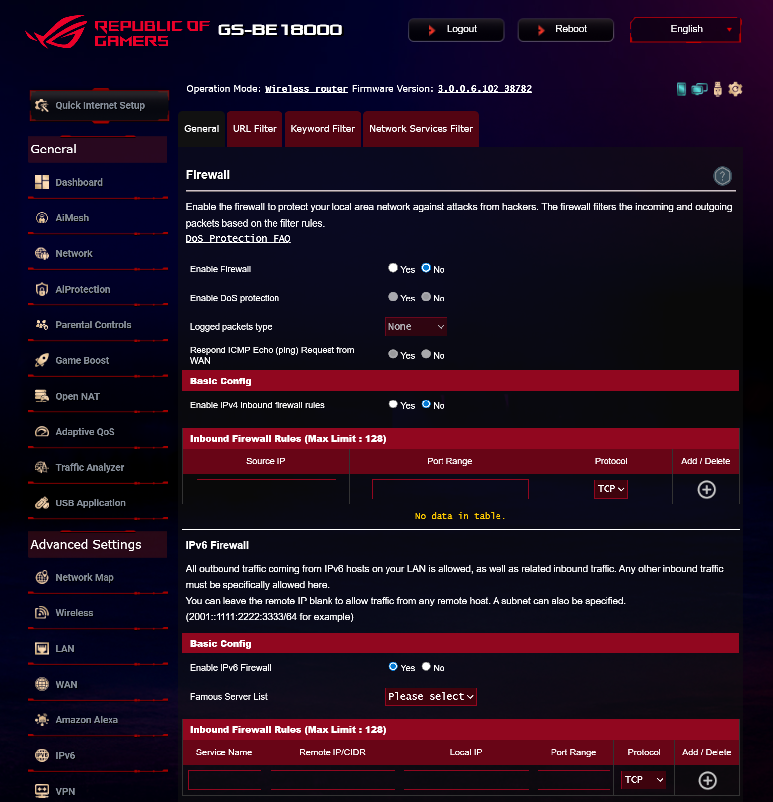 ASUS ROG STRIX GS-BE18000 оснащен прошивкой ASUSWRT 5.0 на базе операционной системы Linux. Интерфейс пользователя имеет черты, присущие серии Republic of Gamers, в частности, цветовую гамму в красных тонах и вкладку Dashboard, на которую выведен статус подключения к сети Интернет и состояние Wi-Fi, мониторинг трафика, а также мгновенное значение задержки доступа к сети и его среднее отклонение. Кроме того, Dashboard позволяет управлять подсветкой AURA RGB и искать серверы популярных онлайн игр с наименьшей задержкой.