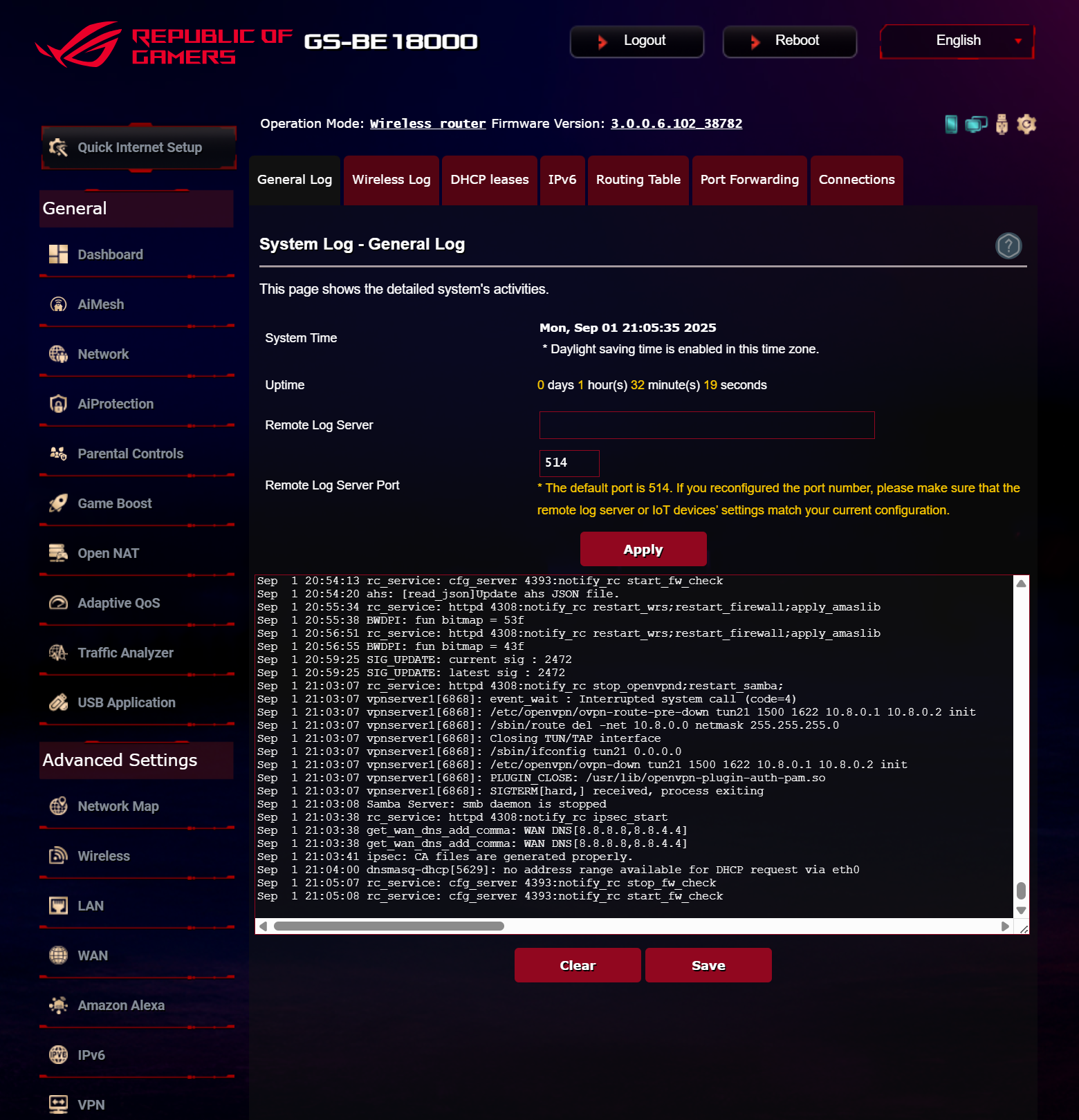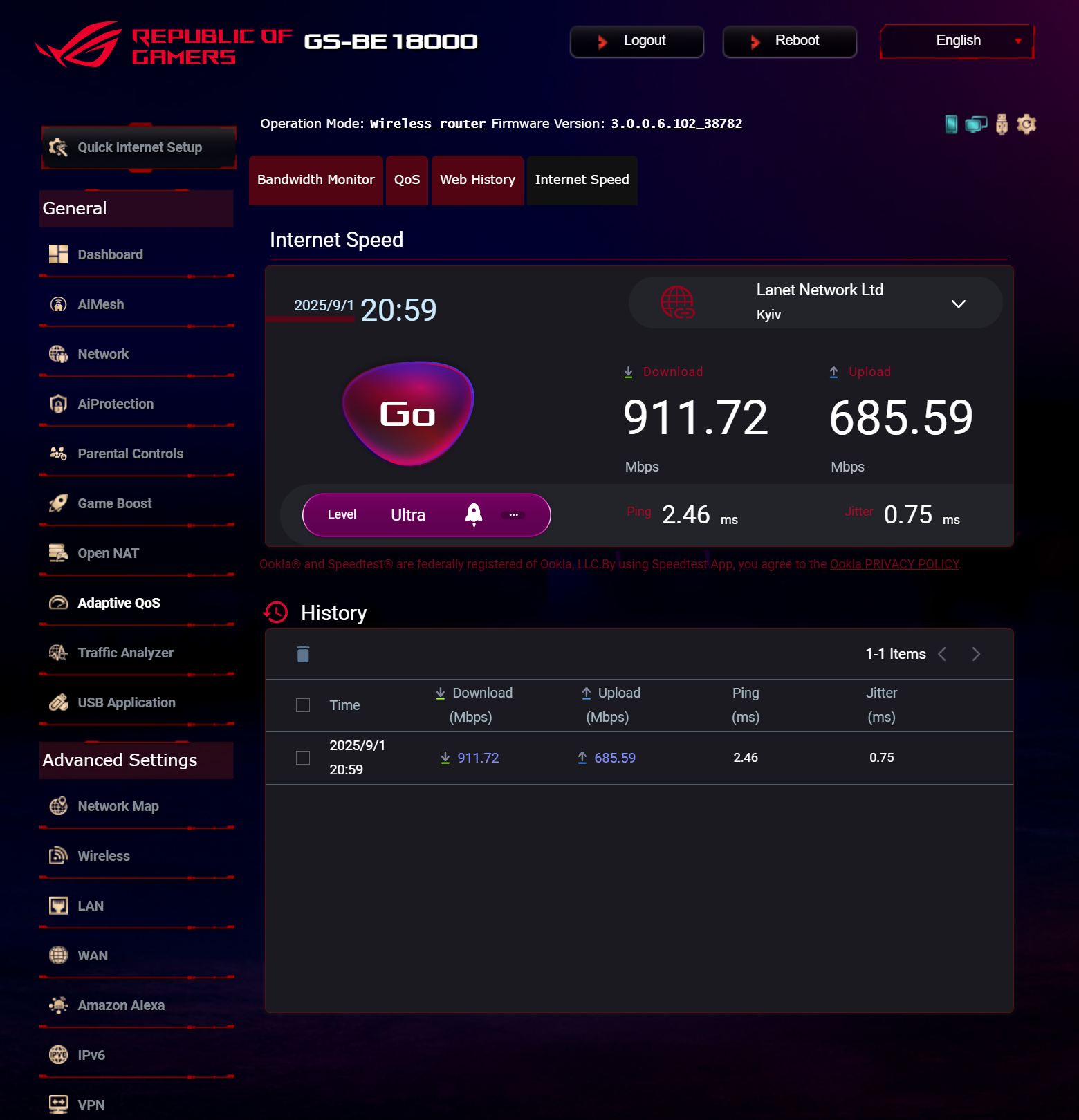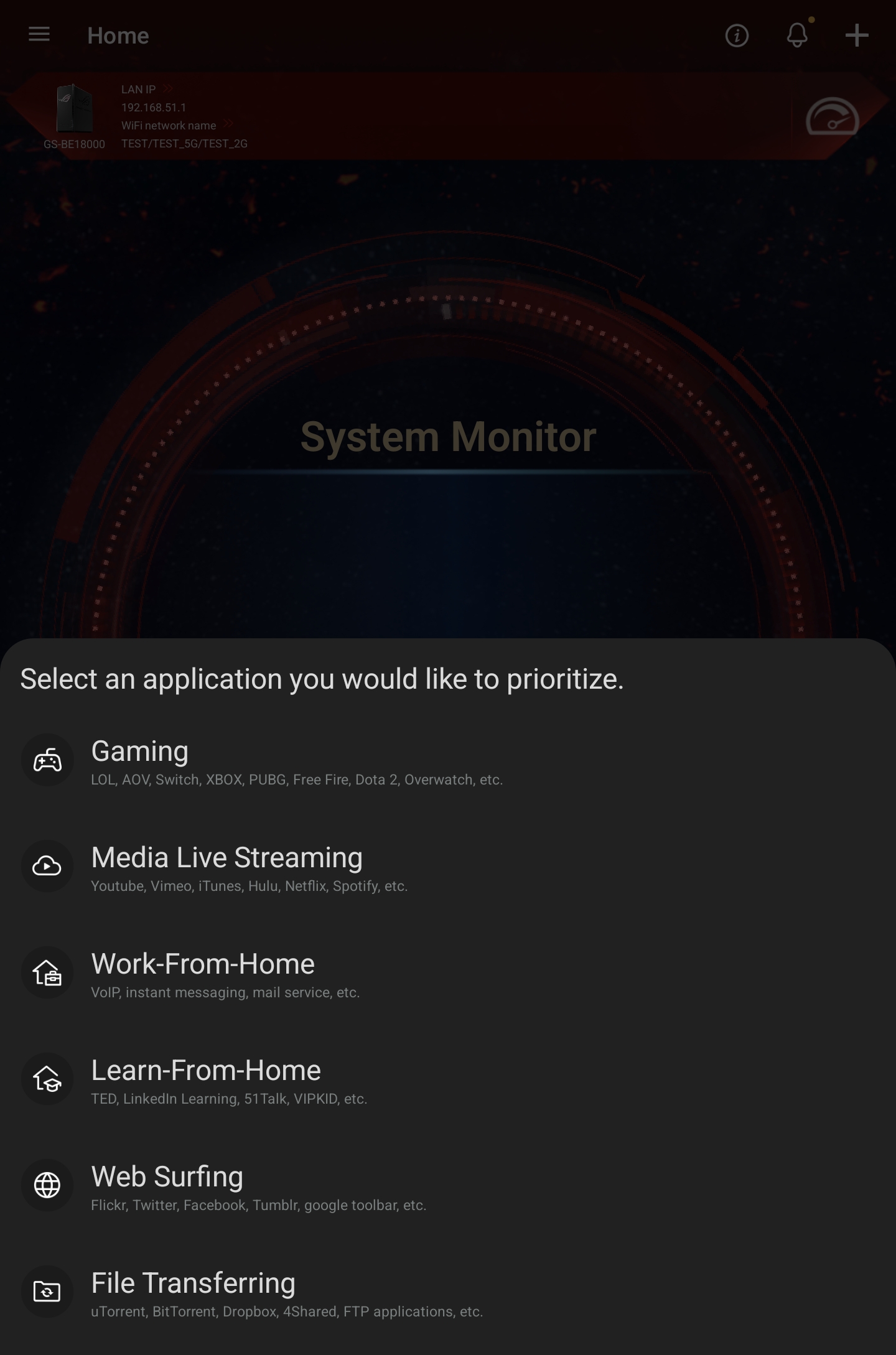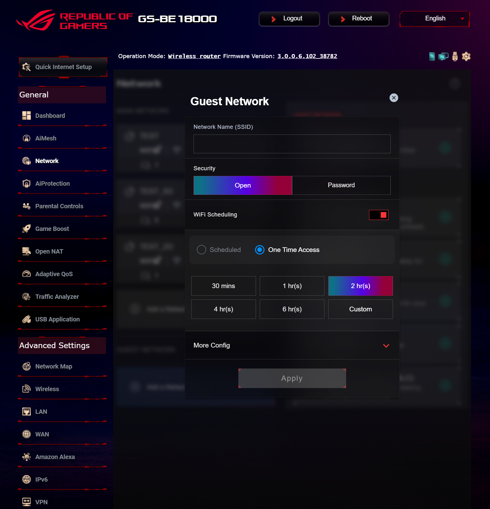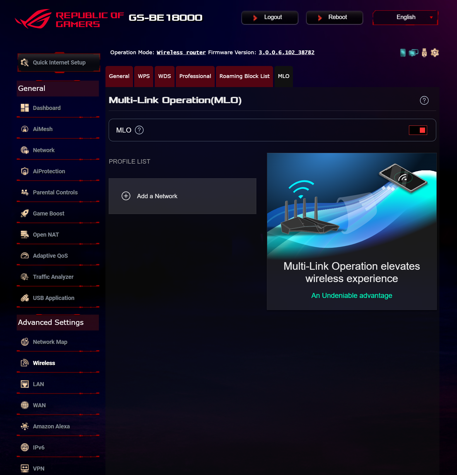 ASUS ROG STRIX GS-BE18000 оснащен прошивкой ASUSWRT 5.0 на базе операционной системы Linux. Интерфейс пользователя имеет черты, присущие серии Republic of Gamers, в частности, цветовую гамму в красных тонах и вкладку Dashboard, на которую выведен статус подключения к сети Интернет и состояние Wi-Fi, мониторинг трафика, а также мгновенное значение задержки доступа к сети и его среднее отклонение. Кроме того, Dashboard позволяет управлять подсветкой AURA RGB и искать серверы популярных онлайн игр с наименьшей задержкой.