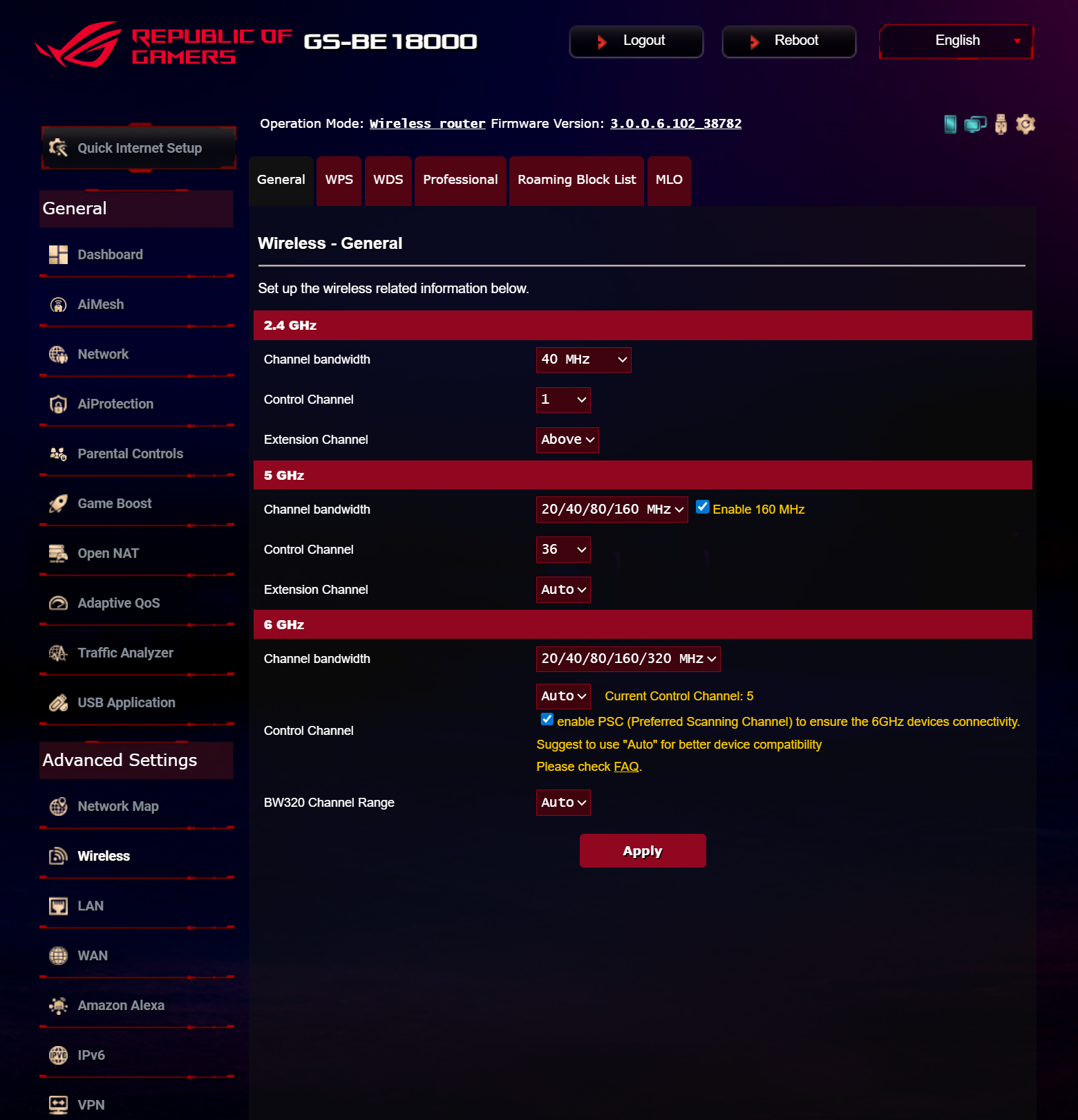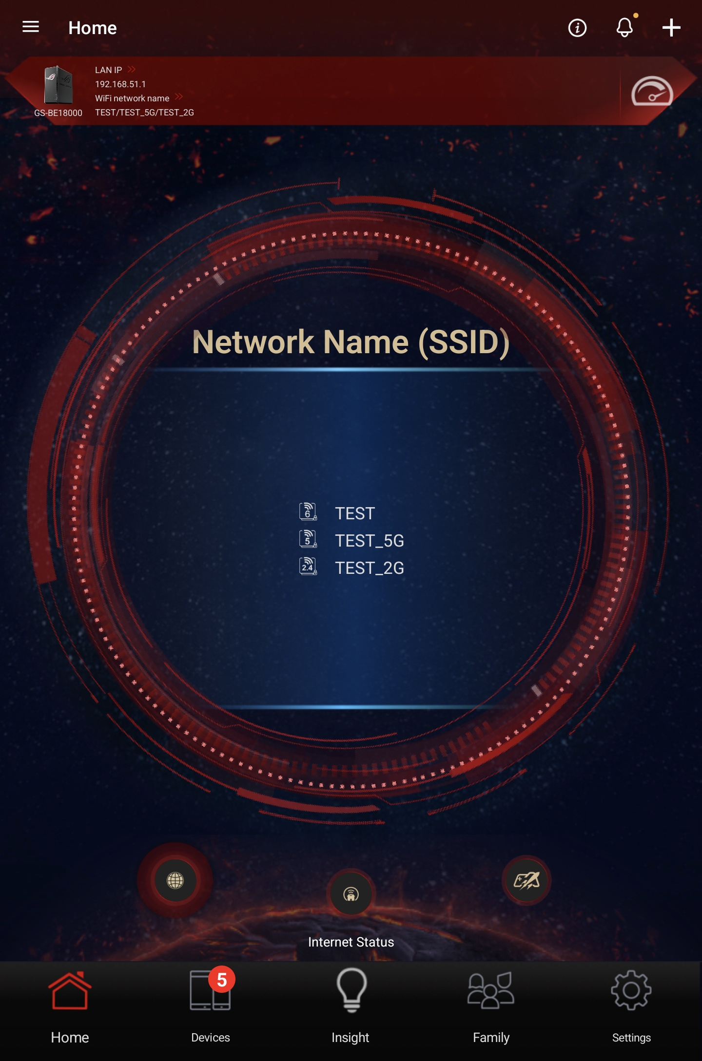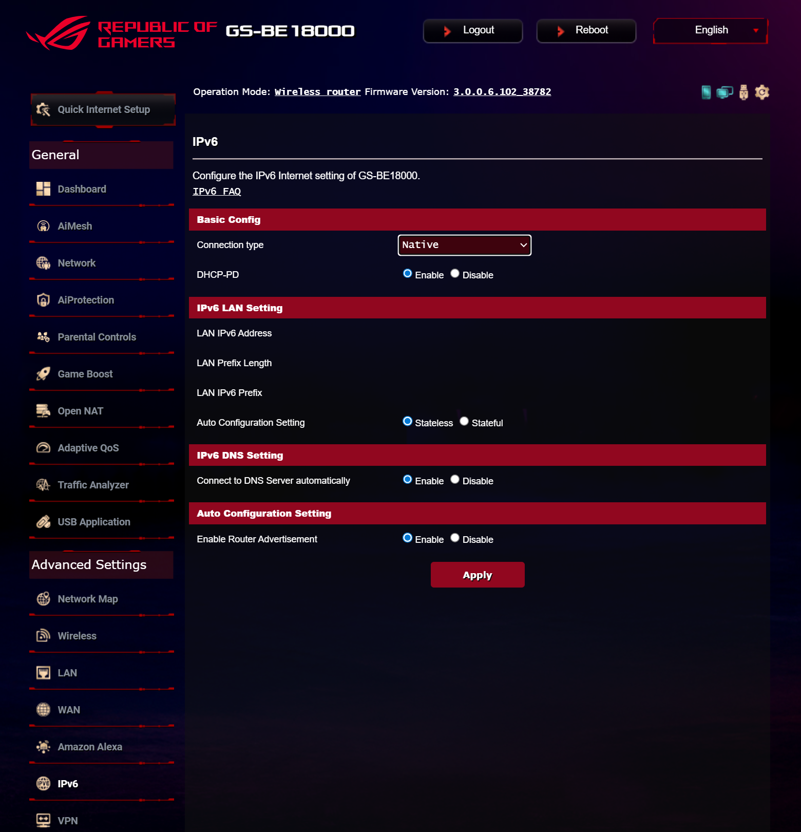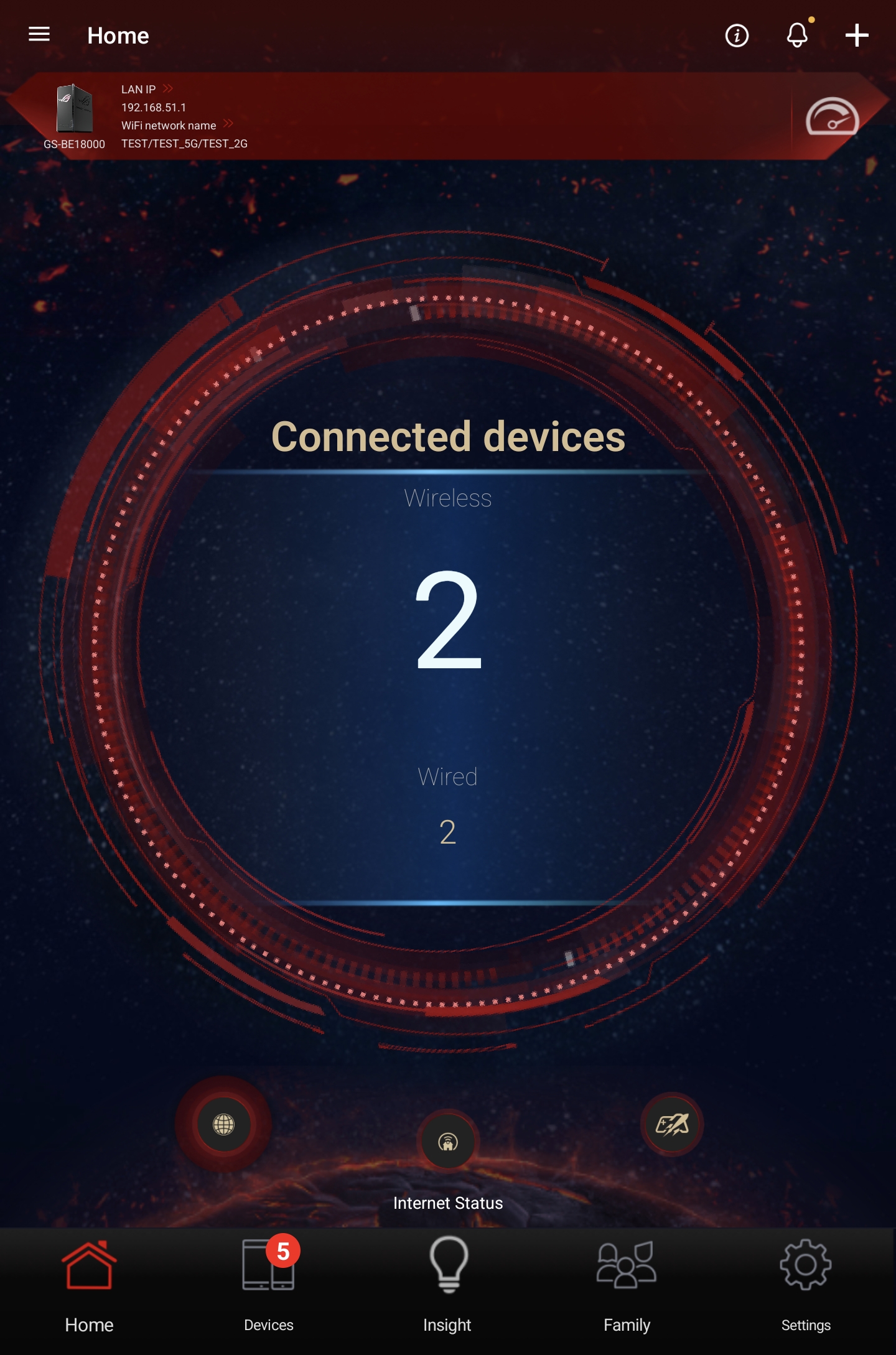 ASUS ROG STRIX GS-BE18000 оснащен прошивкой ASUSWRT 5.0 на базе операционной системы Linux. Интерфейс пользователя имеет черты, присущие серии Republic of Gamers, в частности, цветовую гамму в красных тонах и вкладку Dashboard, на которую выведен статус подключения к сети Интернет и состояние Wi-Fi, мониторинг трафика, а также мгновенное значение задержки доступа к сети и его среднее отклонение. Кроме того, Dashboard позволяет управлять подсветкой AURA RGB и искать серверы популярных онлайн игр с наименьшей задержкой.