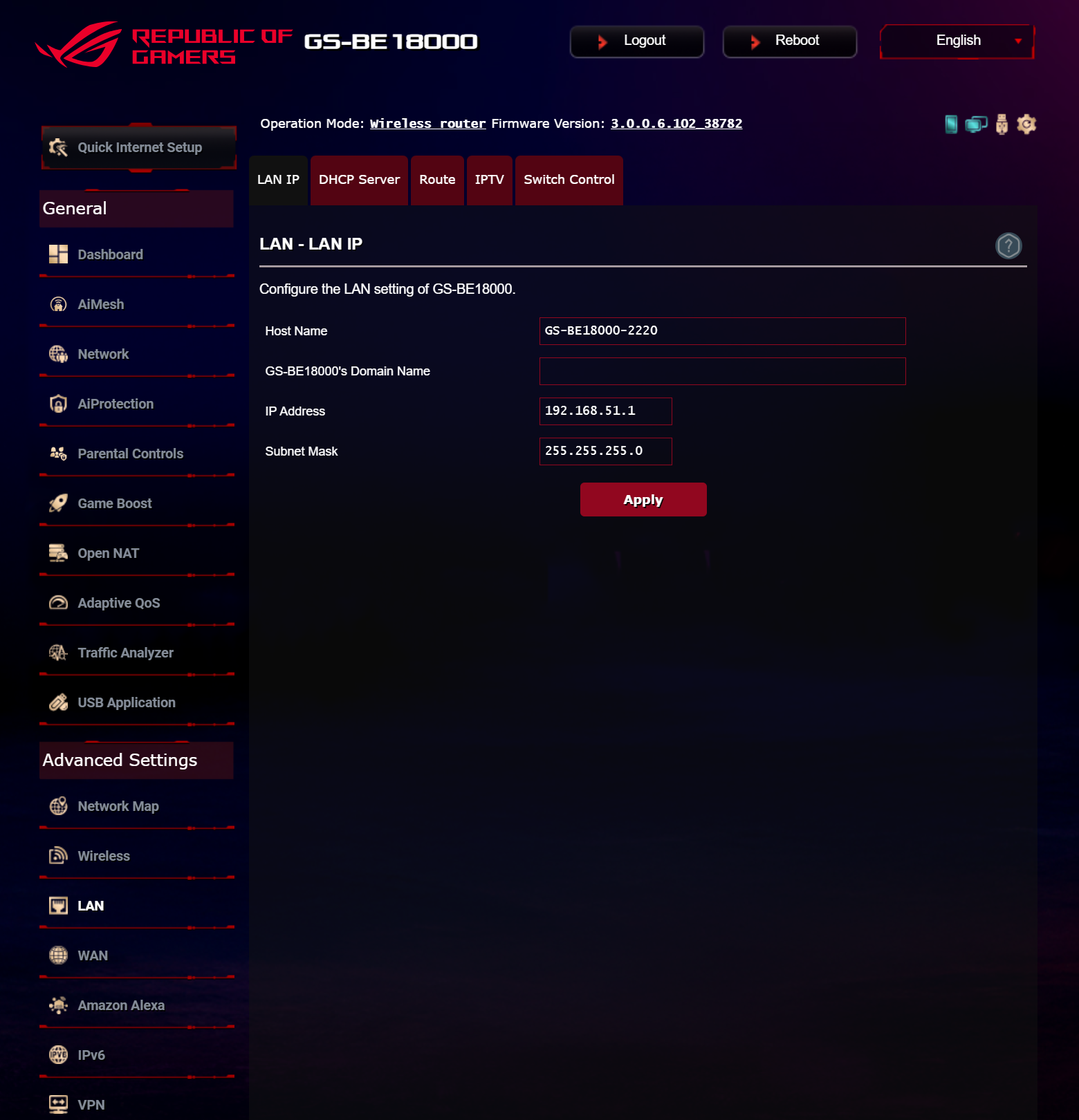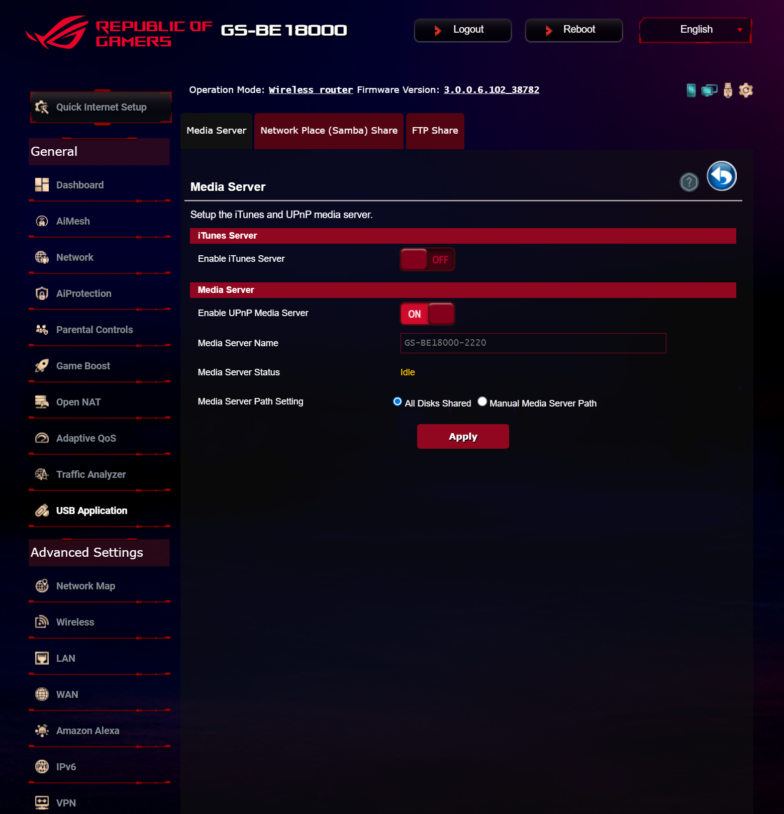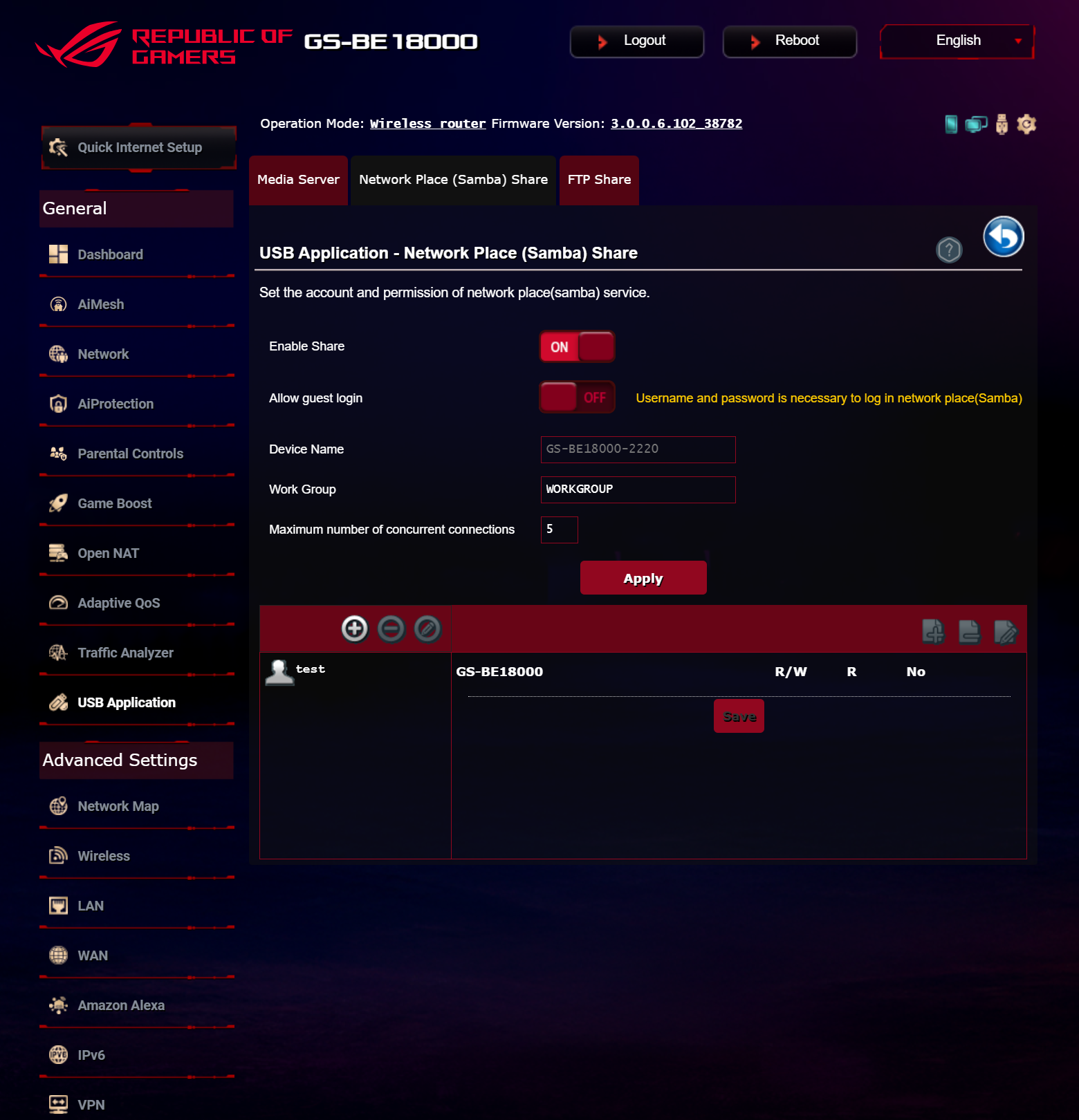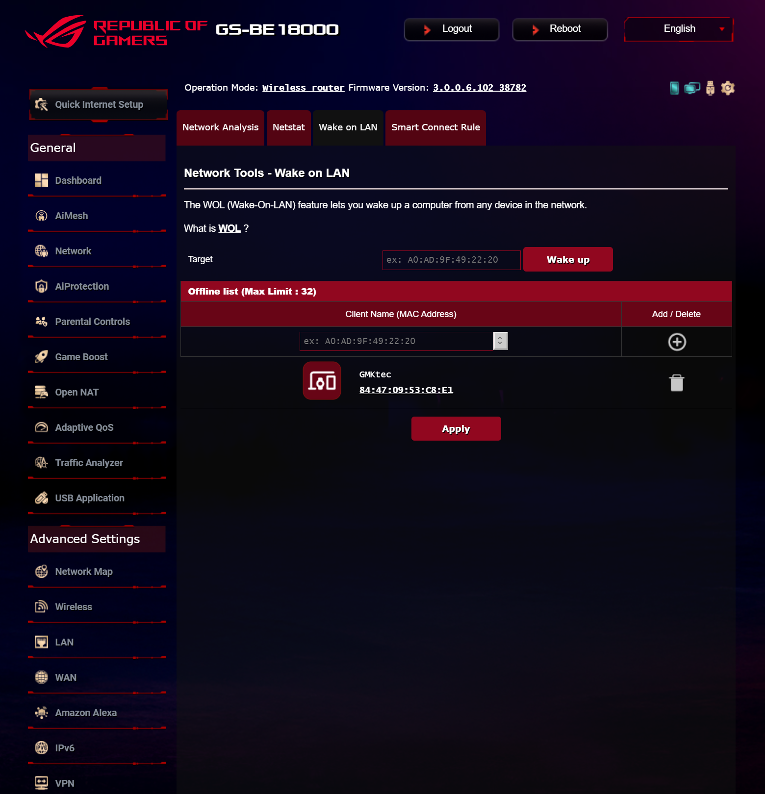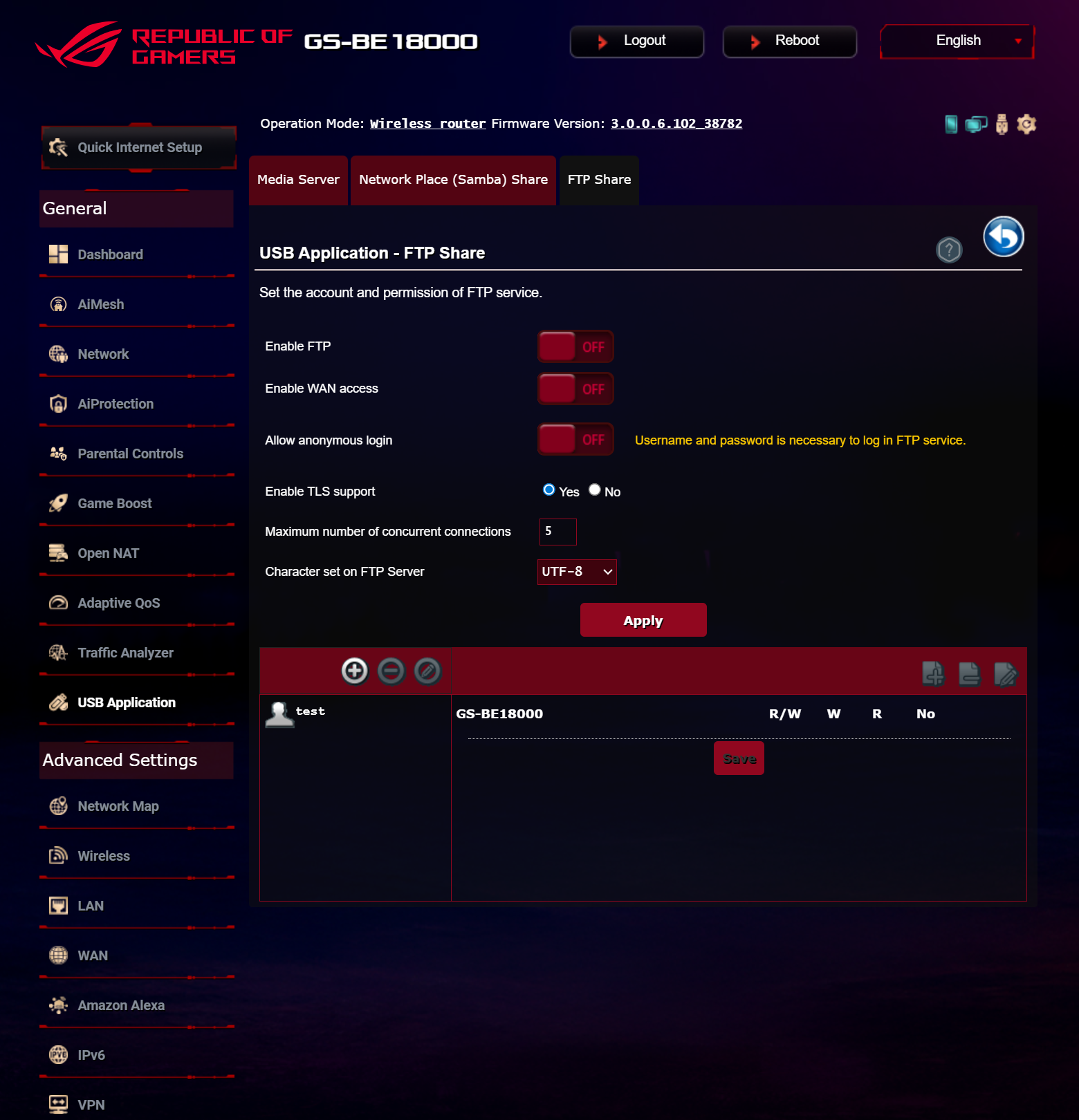 ASUS ROG STRIX GS-BE18000 оснащен прошивкой ASUSWRT 5.0 на базе операционной системы Linux. Интерфейс пользователя имеет черты, присущие серии Republic of Gamers, в частности, цветовую гамму в красных тонах и вкладку Dashboard, на которую выведен статус подключения к сети Интернет и состояние Wi-Fi, мониторинг трафика, а также мгновенное значение задержки доступа к сети и его среднее отклонение. Кроме того, Dashboard позволяет управлять подсветкой AURA RGB и искать серверы популярных онлайн игр с наименьшей задержкой.