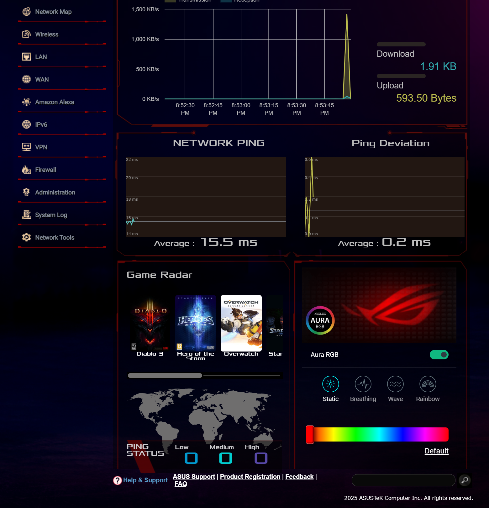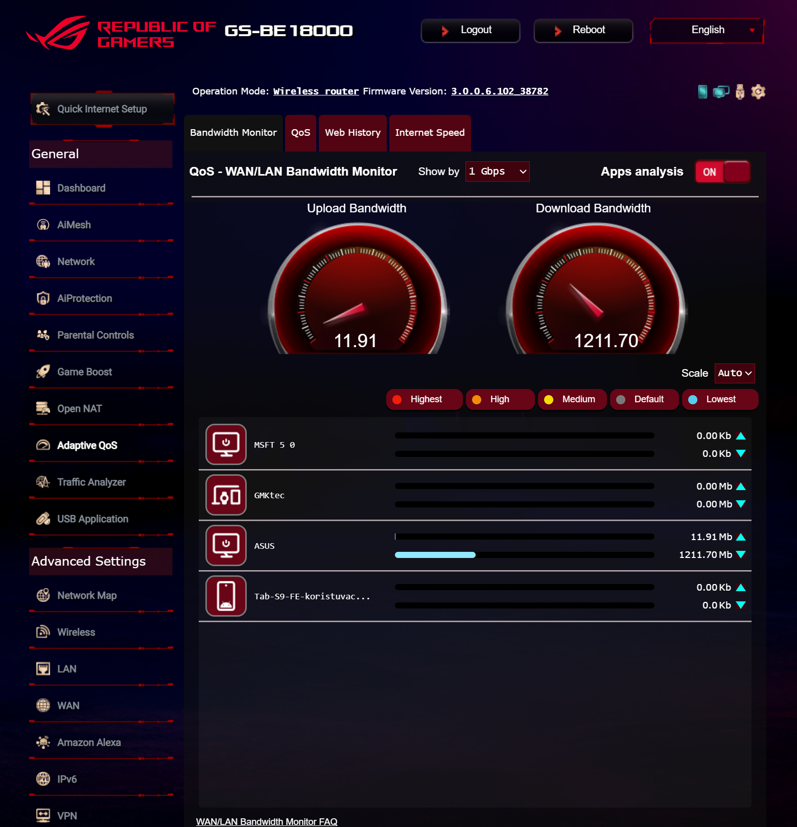 Кроме того, пользователи могут контролировать статус подключения WAN и состояние портов локальной сети, управлять функцией QoS и настройками устройства в сети AiMesh, а также задействовать режим Mobile Gaming Mode для повышения приоритета игрового трафика от мобильных устройств.
