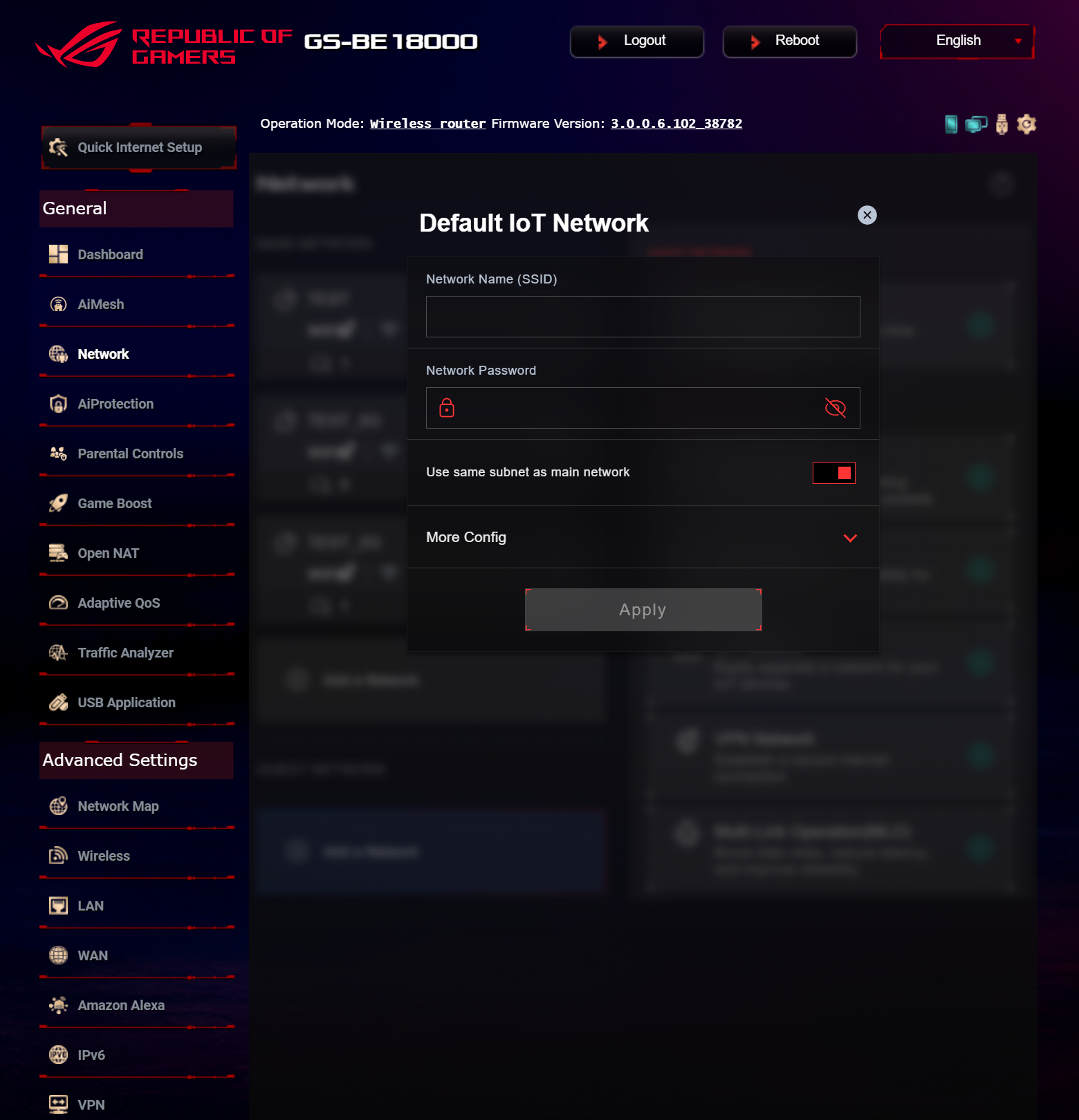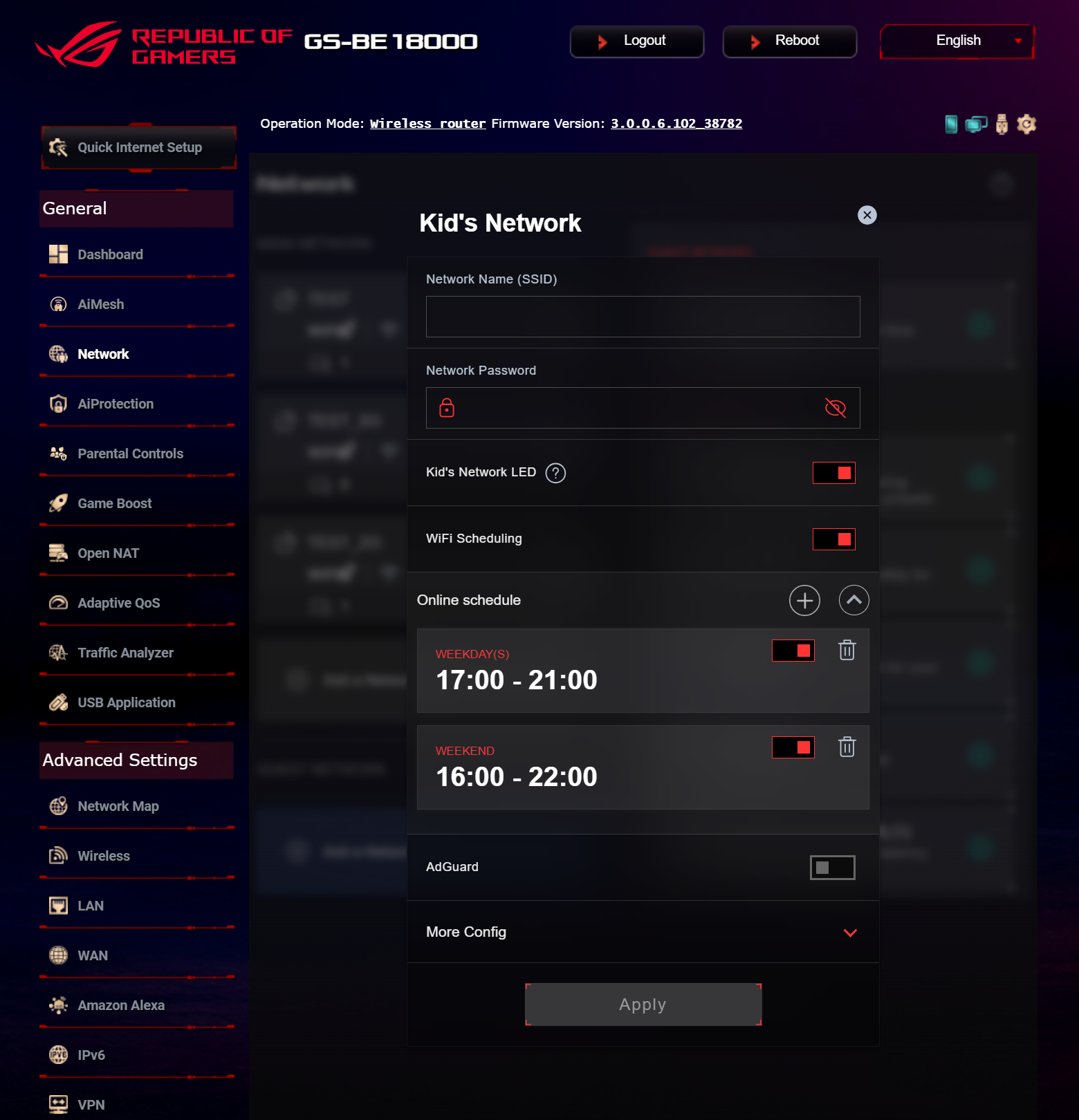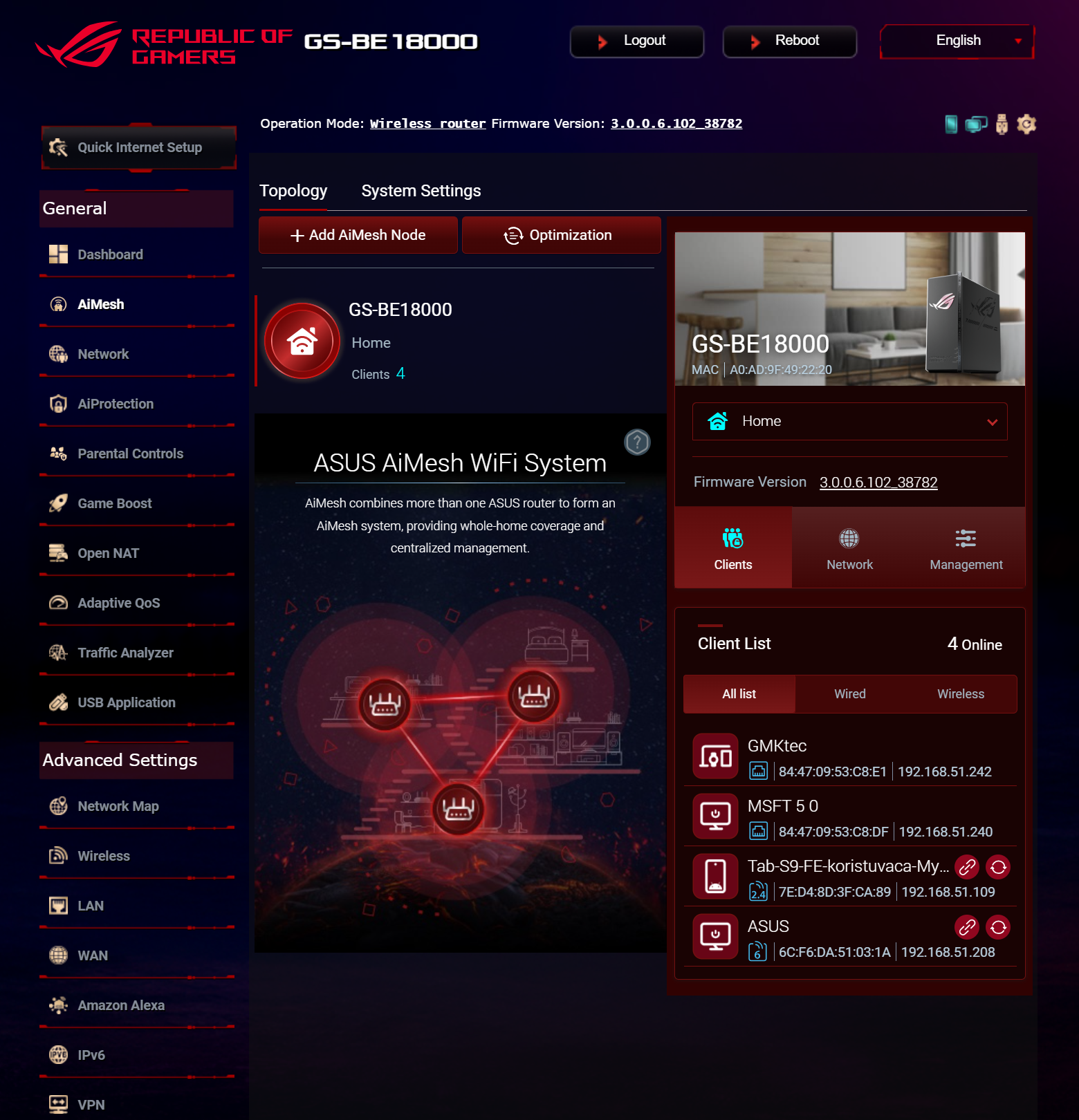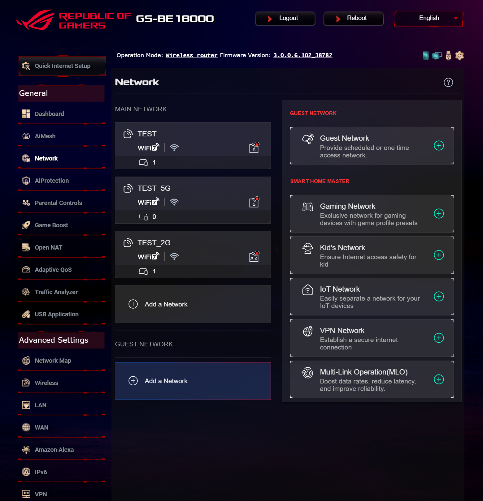 Продукт поддерживает работу в составе сети AiMesh, которая позволяет объединить несколько беспроводных маршрутизаторов ASUS для увеличения зоны покрытия Wi-Fi, в роли главного или подчиненного узла. Также, ROG STRIX GS-BE18000 предлагает расширенное управление Wi-Fi-подсистемой, в том числе возможность создавать гостевые сети и выделенные точки доступа для устройств IoT и клиентов, требующих функций «родительского контроля», а также добавить сеть с маршрутизацией к выбранному профилю VPN. Кроме того, пользователи могут создать выделенную «игровую» точку доступа с выбором DNS-сервера с наименьшей задержкой.