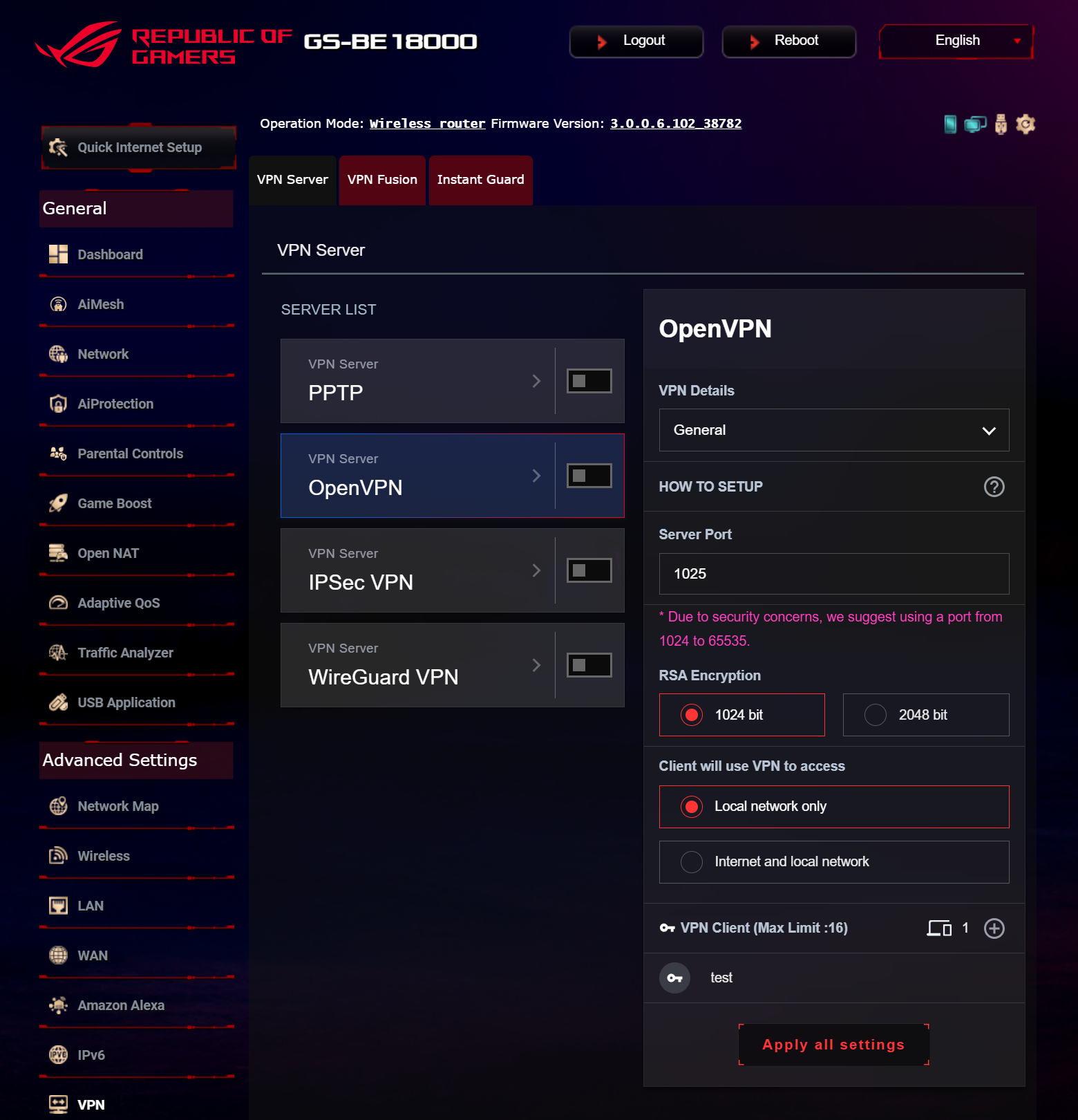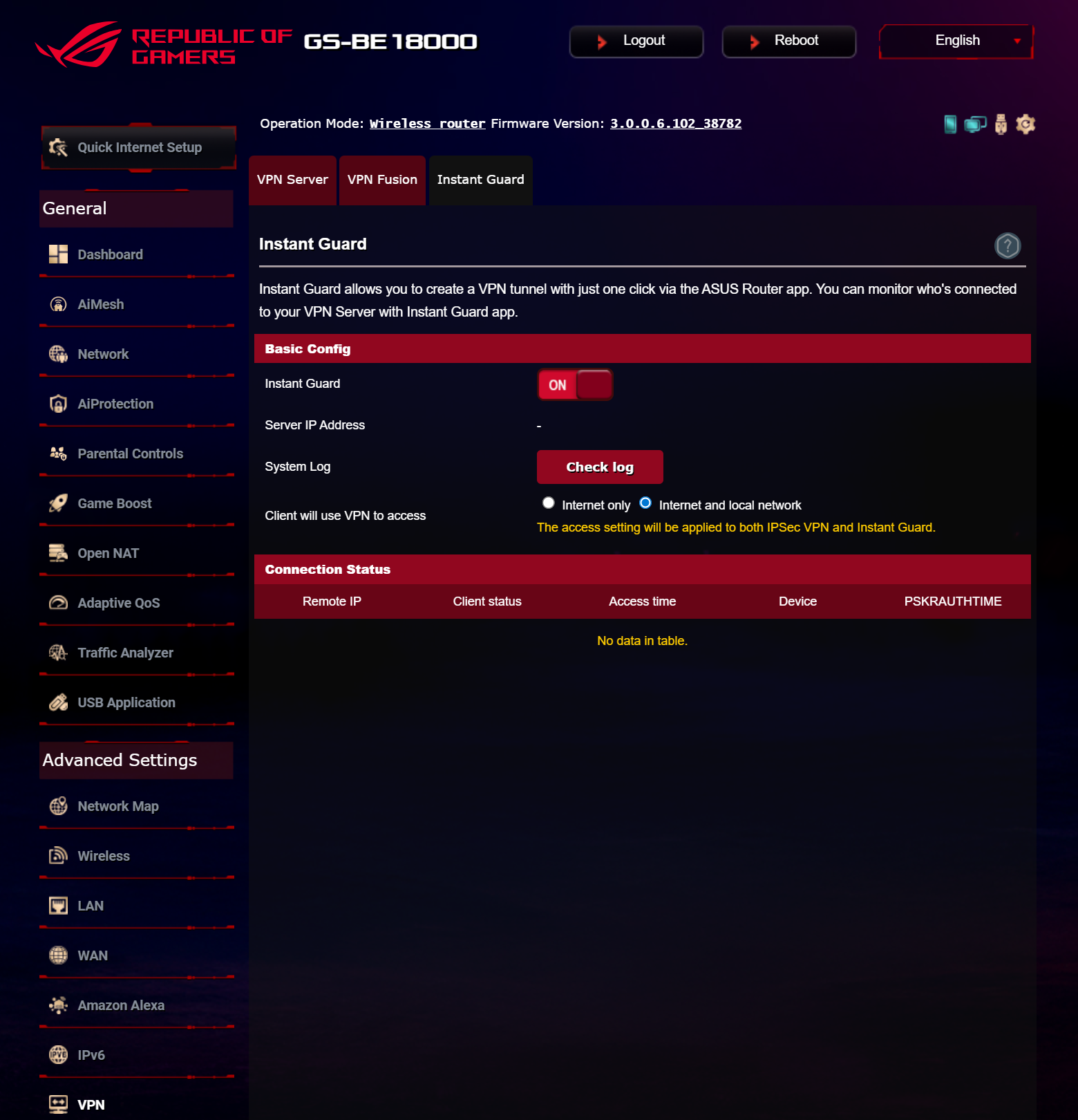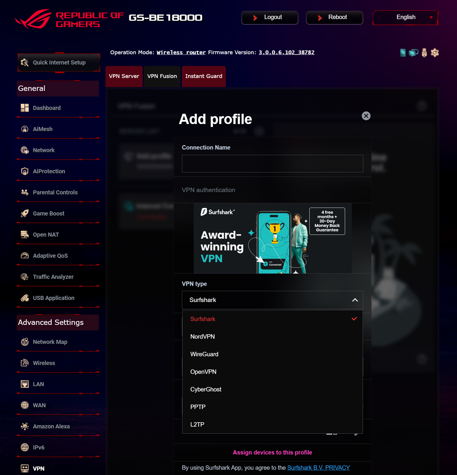 Продукт может интегрироваться в экосистему умного дома Amazon Alexa и работать с современной сетевой адресацией IPv6. Встроенный сервер виртуальных частных сетей поддерживает стандарты PPTP, IPSec, OpenVPN и WireGuard, а в роли клиента ROG STRIX GS-BE18000 может подключаться к VPN-хостам Surfshark, NordVPN, WireGuard, OpenVPN, SyberGhost, PPTP и L2TP. Функция VPN Fusion позволяет настроить индивидуальные правила маршрутизации для устройств локальной сети к отдельным VPN-профилям, а с помощью Instant Guard можно защитить мобильные устройства в публичных сетях.