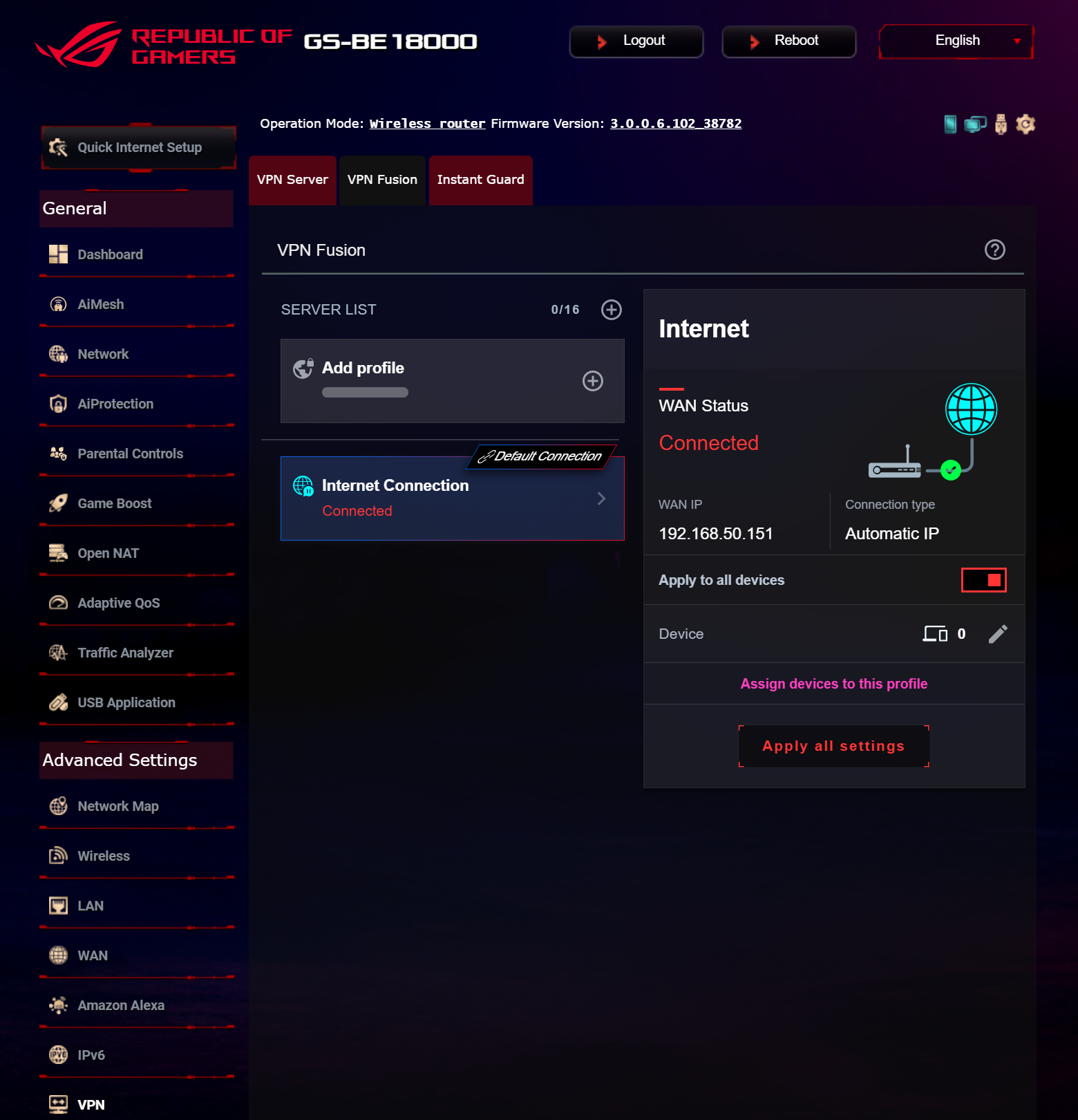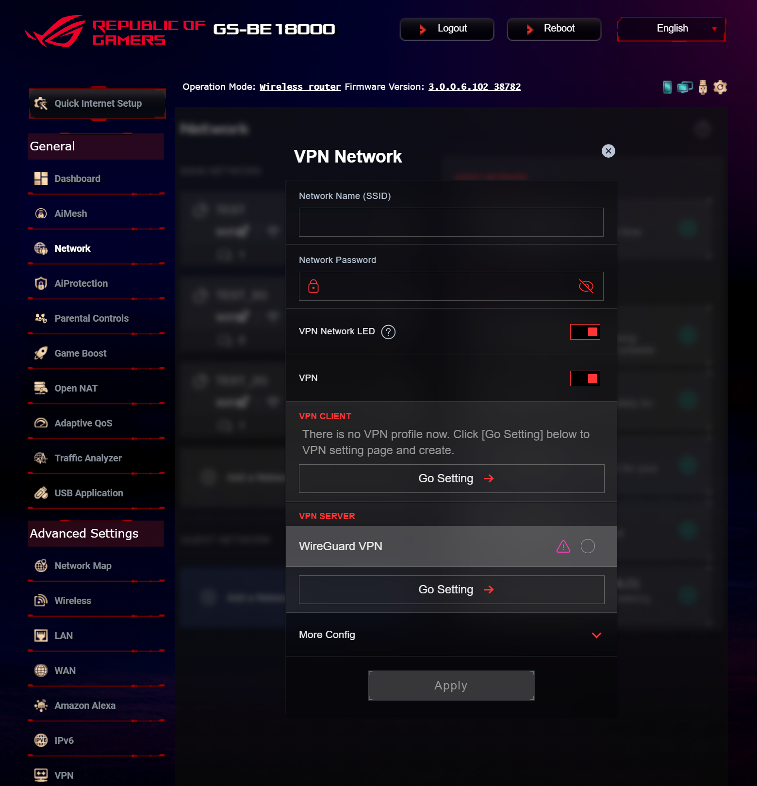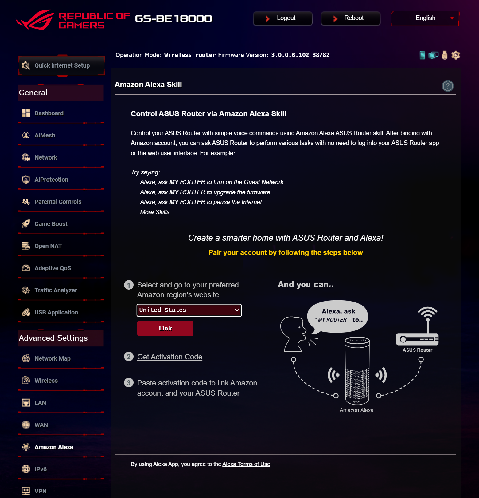 Продукт может интегрироваться в экосистему умного дома Amazon Alexa и работать с современной сетевой адресацией IPv6. Встроенный сервер виртуальных частных сетей поддерживает стандарты PPTP, IPSec, OpenVPN и WireGuard, а в роли клиента ROG STRIX GS-BE18000 может подключаться к VPN-хостам Surfshark, NordVPN, WireGuard, OpenVPN, SyberGhost, PPTP и L2TP. Функция VPN Fusion позволяет настроить индивидуальные правила маршрутизации для устройств локальной сети к отдельным VPN-профилям, а с помощью Instant Guard можно защитить мобильные устройства в публичных сетях.