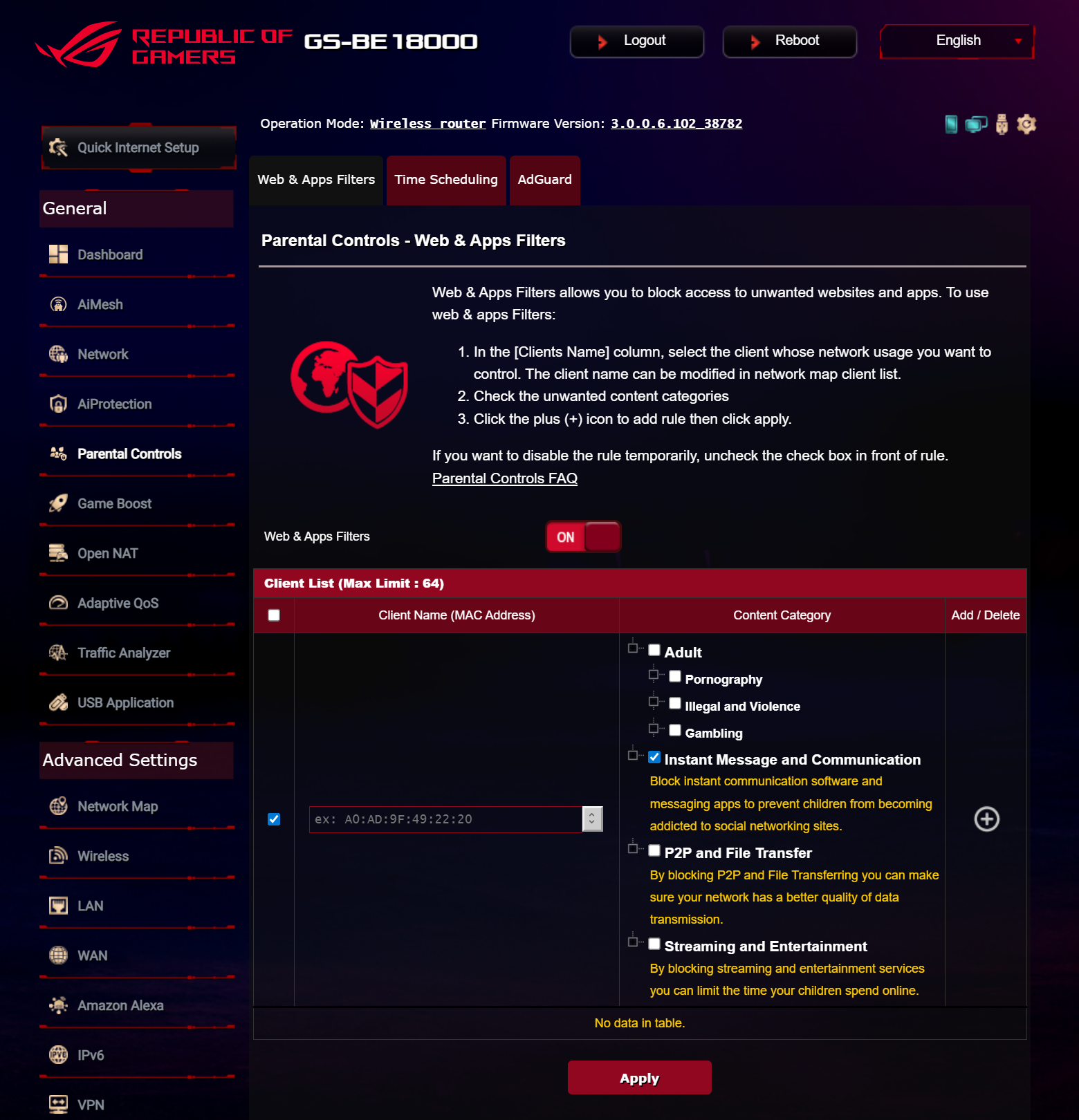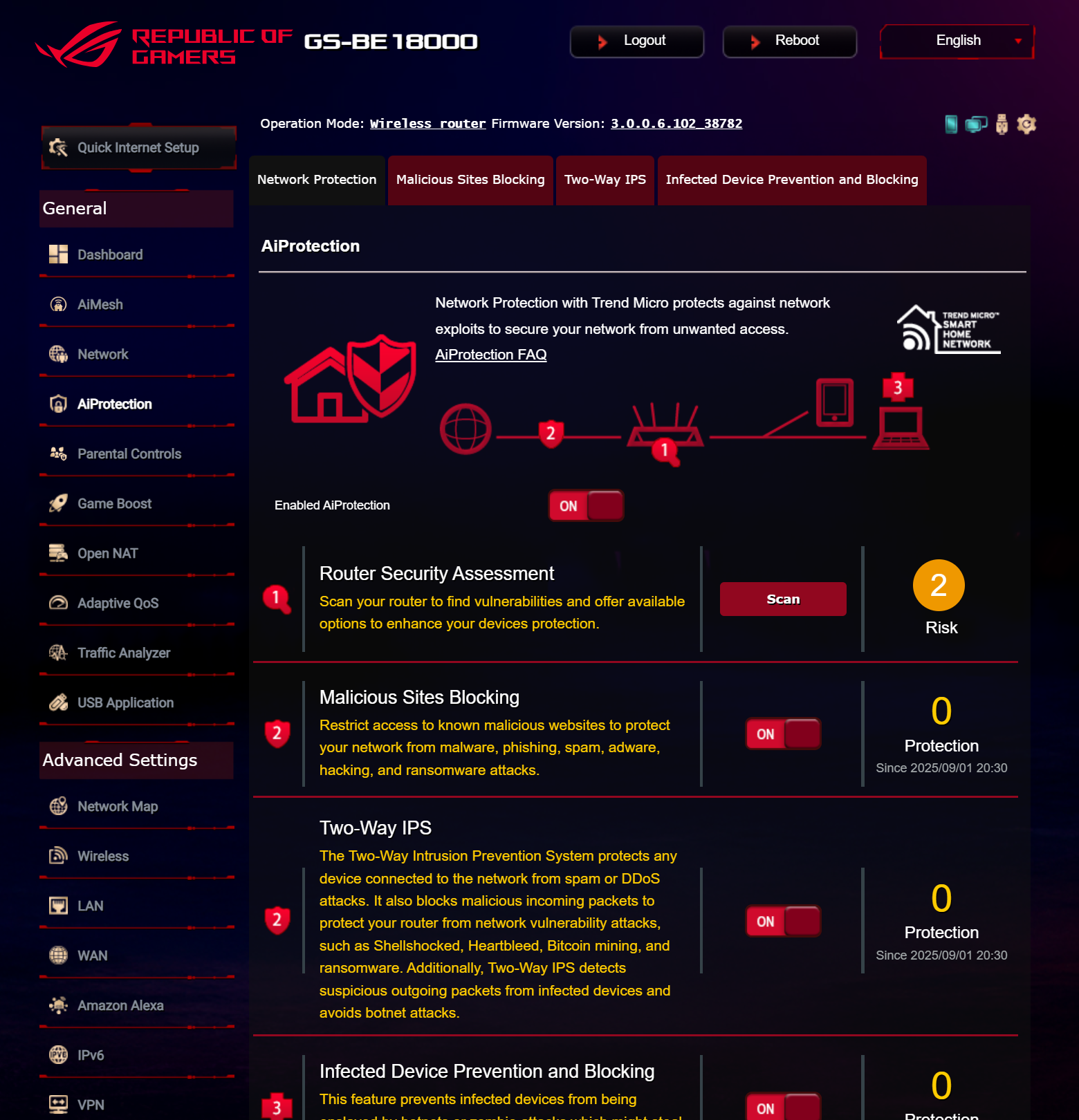 Беспроводной маршрутизатор оснащен комплексом киберзащиты AiProtection с обновлением сигнатур угроз в течение всего жизненного цикла продукта. AiProtection позволяет проводить оценку настроек устройства с точки зрения кибербезопасности, блокировать веб-ресурсы с вредоносным содержимым, противодействовать сетевым вторжениям, а также изолировать инфицированные клиенты в локальной сети. Также, ROG STRIX GS-BE18000 предлагает развитые функции родительского контроля, в том числе ограничение доступа к сайтам определенных категорий, разрешение пользования сетью Интернет по расписанию и фильтрацию веб-страниц.