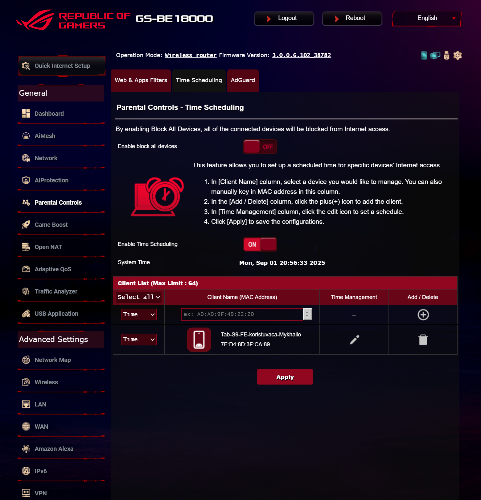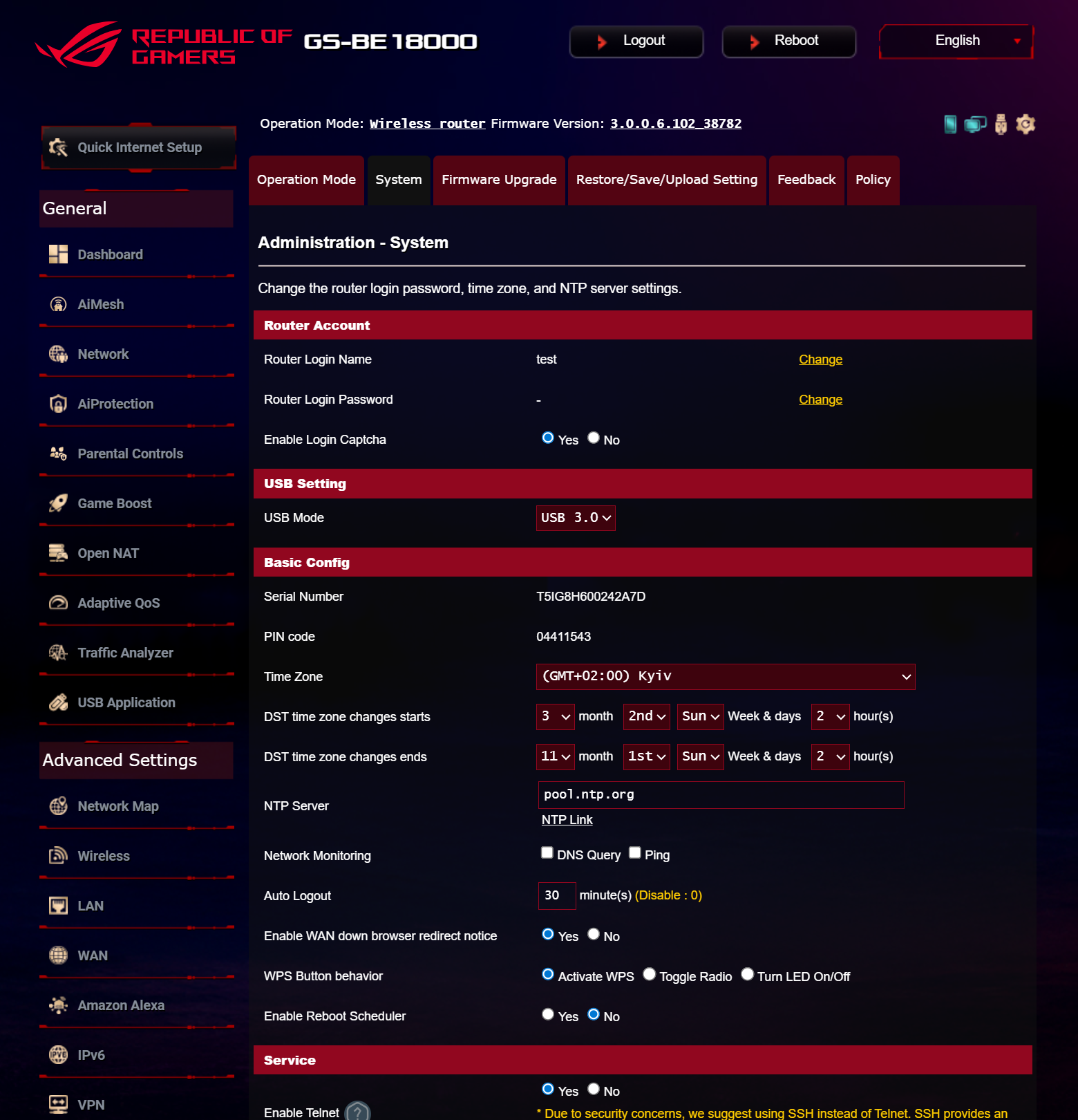 Помимо комплекса киберзащиты AiProtection беспроводной маршрутизатор оснащен классическим SPI-firewall, обеспечивающим защиту от атак DDoS и фильтрацию по URL, ключевым словам и протоколам. Функции системного администрирования позволяют выбрать режим работы устройства, настроить параметры учетной записи администратора и синхронизацию с сервером точного времени, автоматически обновлять прошивку и базы сигнатур сетевых угроз, а также сохранять конфигурацию прошивки с возможностью восстановления из резервной копии. Кроме того, меню настроек предоставляет возможность просматривать журналы системных событий и воспользоваться инструментами для диагностики подключения WAN.
