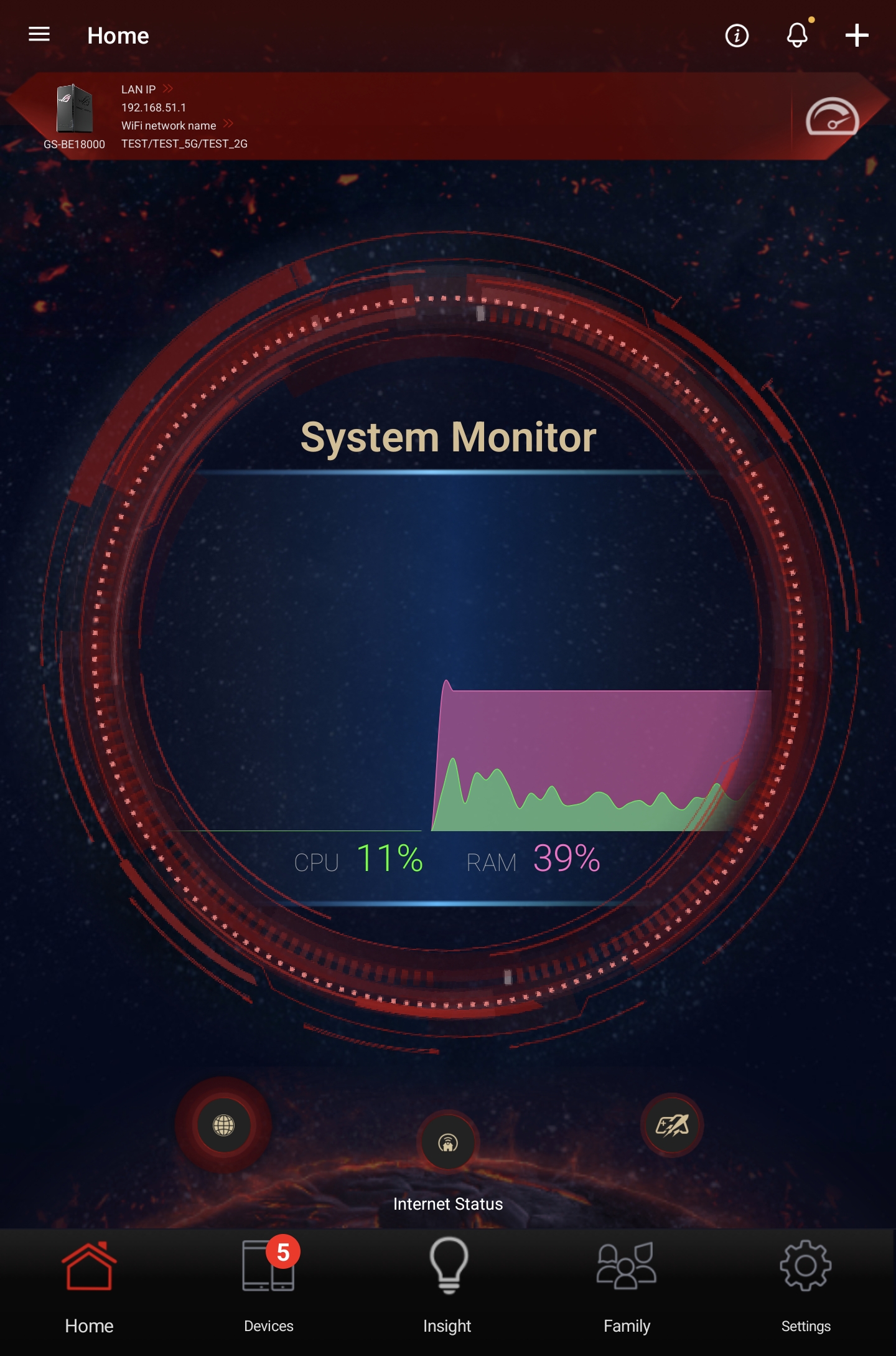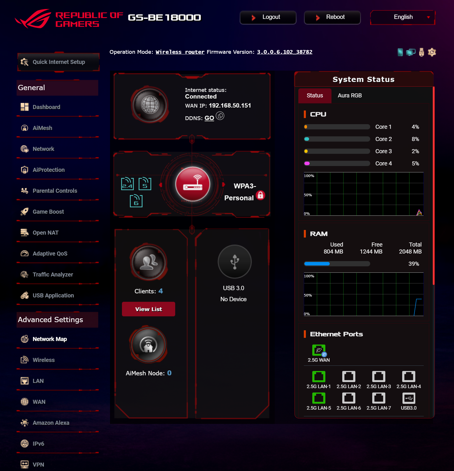 Для управления устройством пользователи могут установить мобильное приложение ASUS Router App для платформ iOS и Android. С его помощью можно выбрать режим подсветки AURA RGB, контролировать трафик в режиме реального времени, просматривать список подключенных клиентов, настраивать параметры сетей Wi-Fi и следить за загрузкой процессора и оперативной памяти.