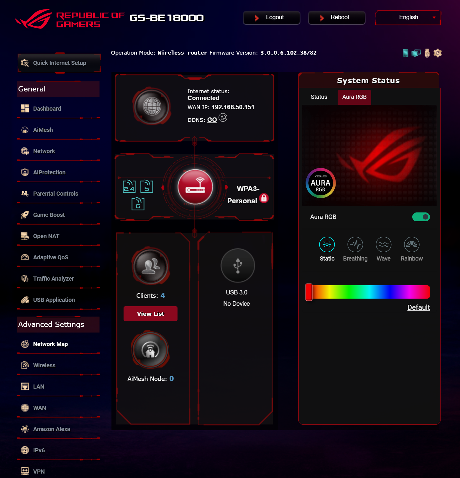 Стандартное для большинства беспроводных маршрутизаторов ASUS меню Network Map не только выводит схематическую карту сети и отображает статус всех основных подсистем, но и позволяет управлять подсветкой AURA RGB.