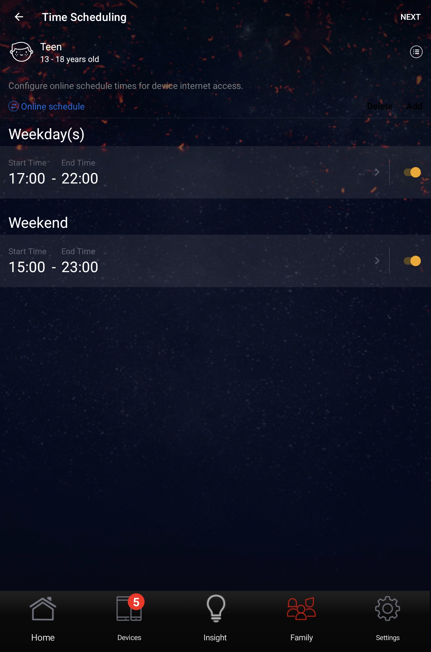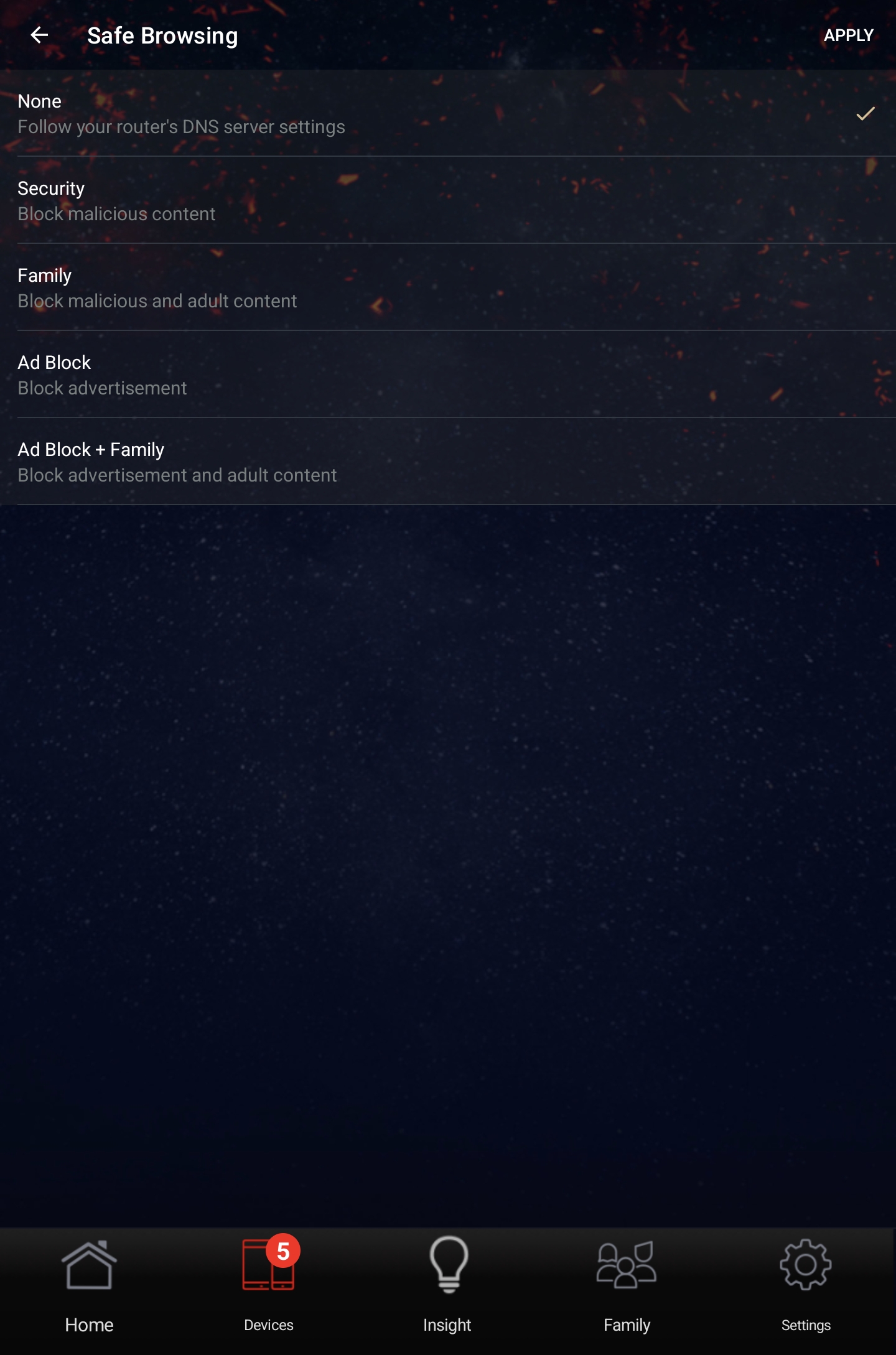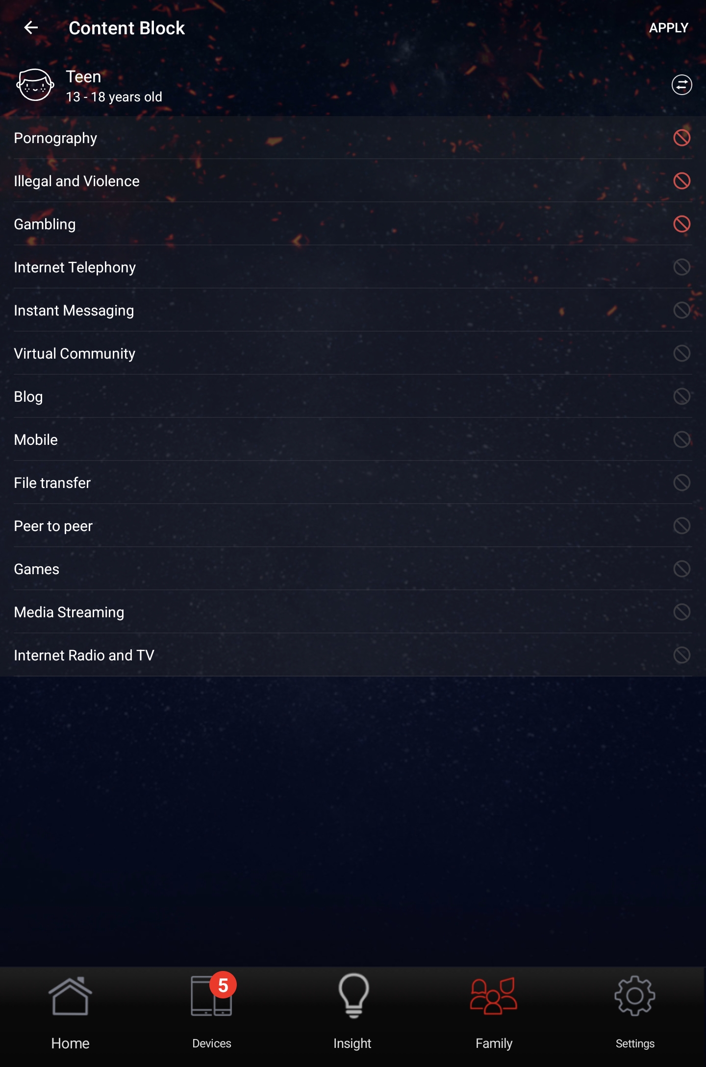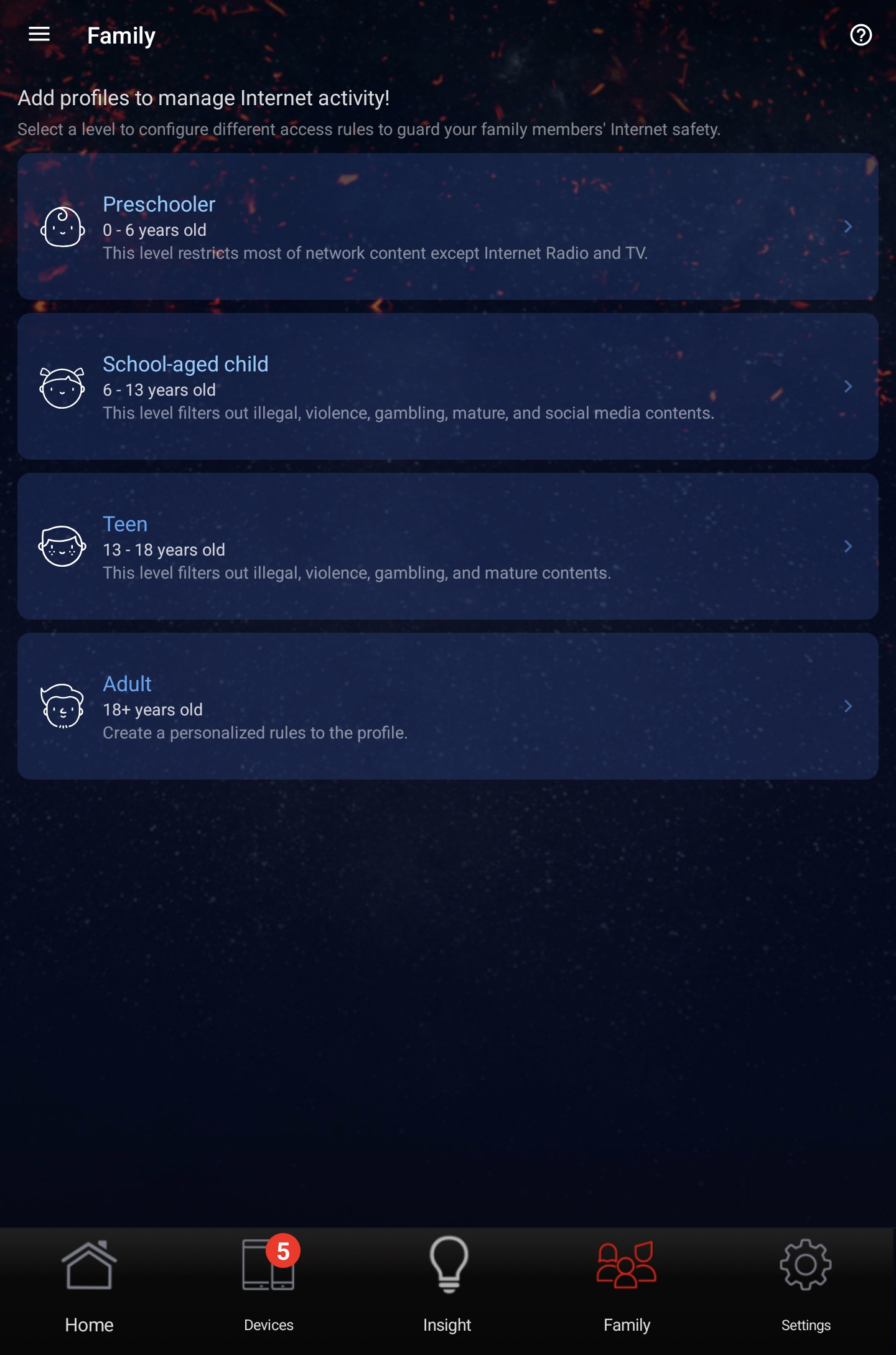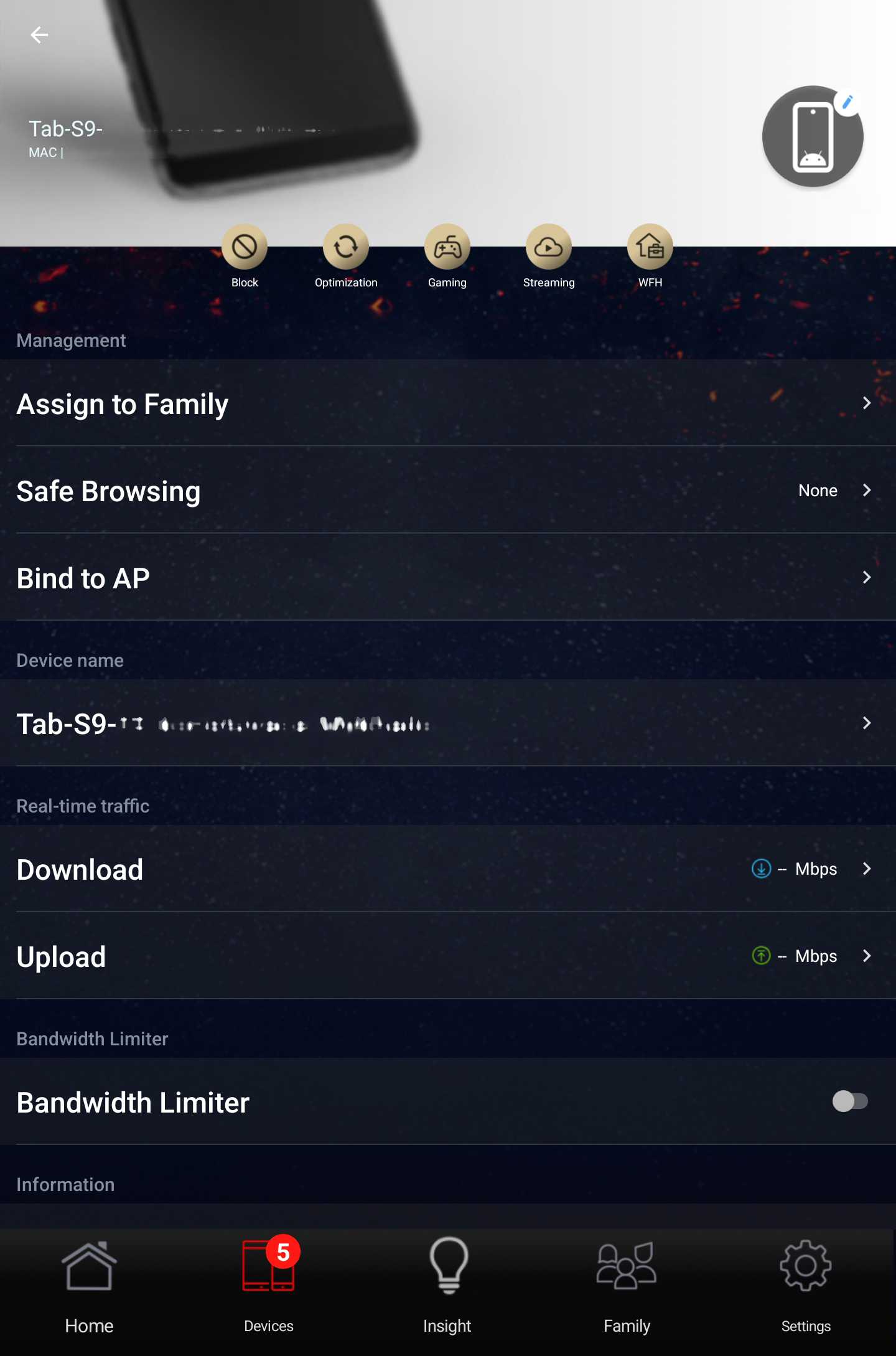 В приложении выводится перечень подключенных клиентов и для каждого из них отображается статус соединения, предоставляется возможность ограничить пропускную полосу подключения или полностью заблокировать выход в Интернет, а также включить режим «безопасного просмотра» для защиты от нежелательного контента.