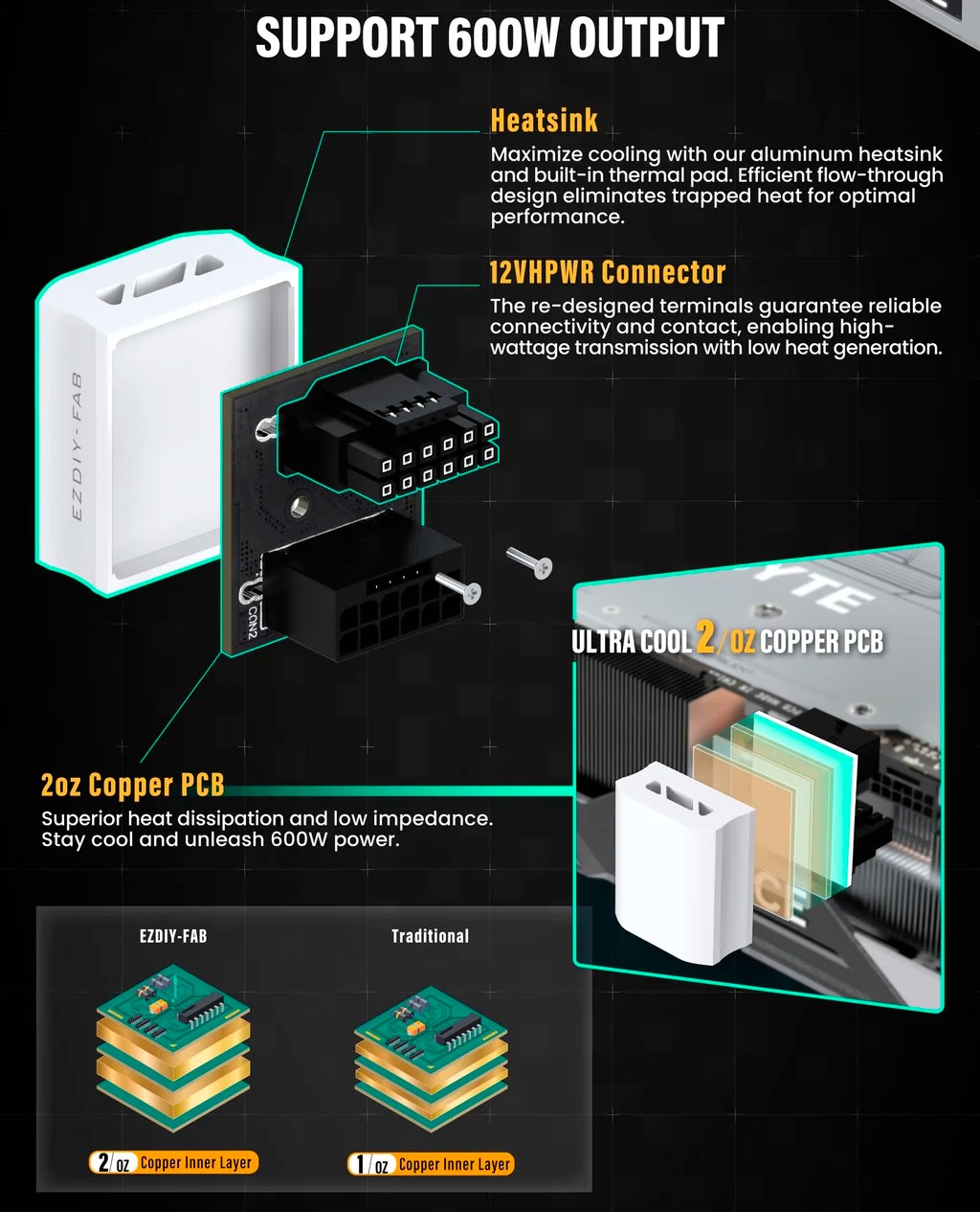 Но главной особенностью является наличие дополнительных толстых медных слоев в текстолите и алюминиевого корпуса с термопрокладкой. То есть сам переходник оснащен системой охлаждения для рассеивания тепла и повышения стабильности соединения. На официальном сайте указан список совместимых моделей, среди которых значатся видеокарты GeForce RTX 40/30, а новые GeForce RTX 50 пока не указаны.