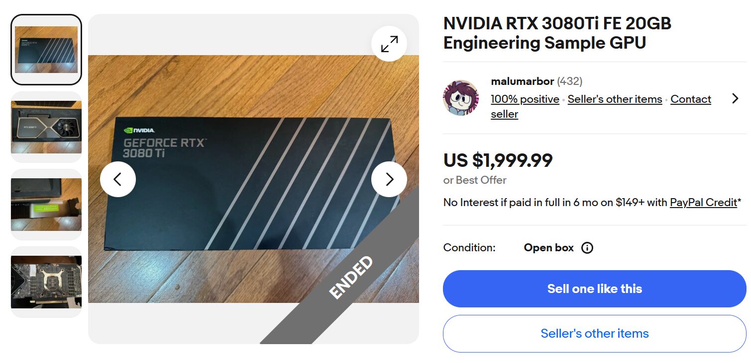 Инженерная версия GeForce RTX 3080 Ti Founders Edition была оценена продавцом в две тысячи долларов. Отмечается, что видеокарта полностью работоспособна, разве что, официально не поддерживается графическим драйвером «зелёных». Для запуска игр потребуется модифицированный драйвер, впрочем, на этом этапе более логичной покупкой станет GeForce RTX 4090 или RTX 5090. Вышеописанная GeForce RTX 3080 Ti 20GB будет интересна в первую очередь коллекционерам.