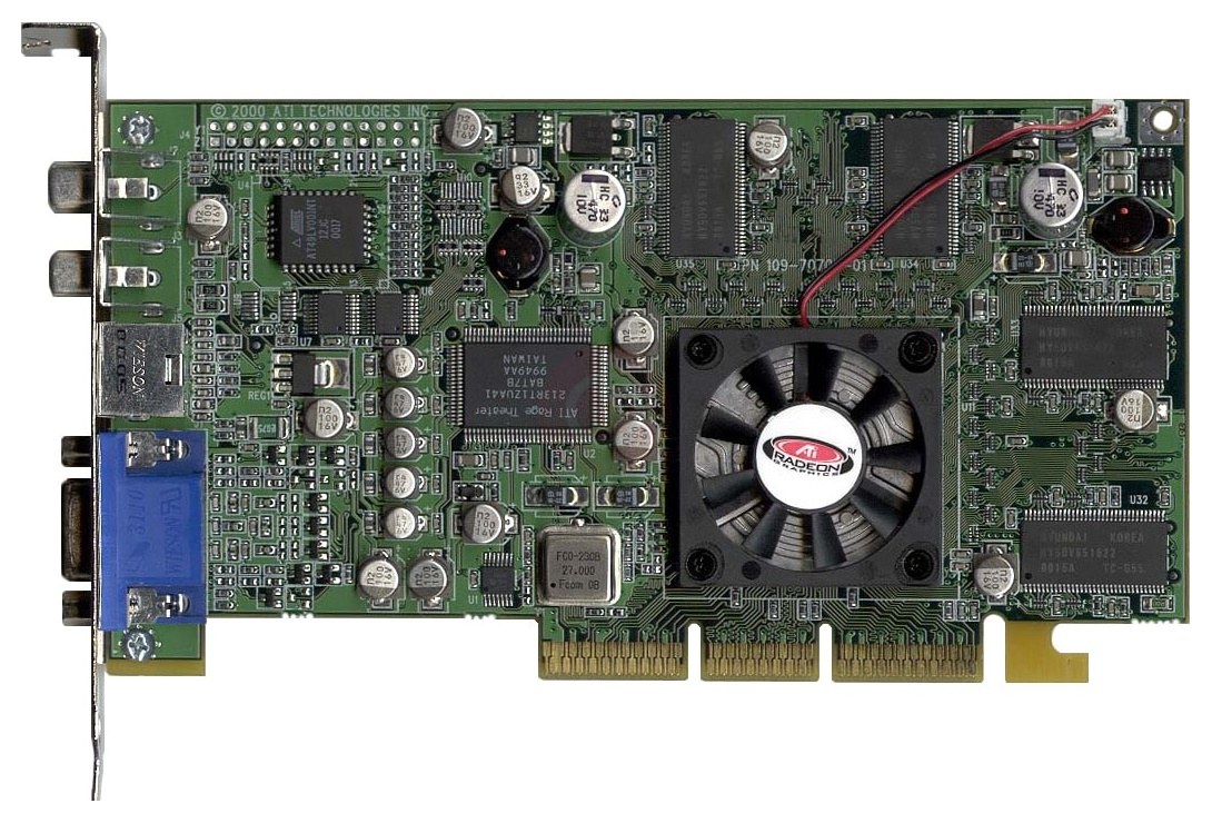 Видеокарта ATI Radeon также известная под кодовым именем R100 выпускалась по техпроцессу 180 нм. Чип имел аппаратный движок T&L (Transform and Lighting), поддерживал Direct3D 7.0 и еще не обладал аппаратной поддержкой шейдеров. Ядро работало на частоте 183 МГц. Первые версии оснащались памятью DDR 183 МГц объемом 64 МБ или 32 МБ. У современной Radeon RX 9070 XT на архитектуре RDNA 4 частота чипа около 3 ГГц и 16 ГБ видеопамяти.