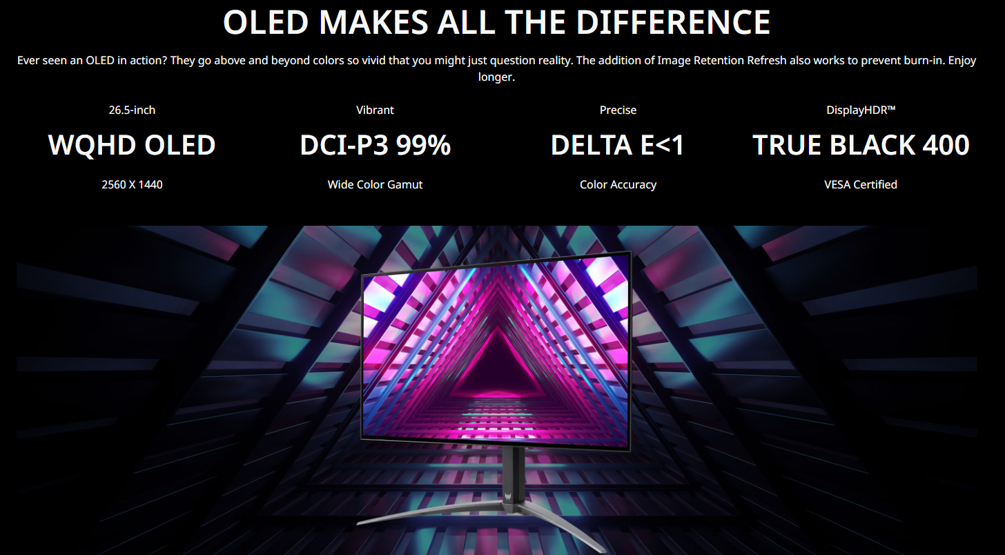 Из особенностей Acer Predator X27U F8 также стоит отметить 99% охват цветовой палитры DCI-P3, пиковую яркость 1500 кд/м², время отклика 0,01 мс, статическую контрастность 1,5 млн к 1, показатель Delta E<1 и сертификат VESA DisplayHDR 500 True Black. Для подключения к источнику изображения предусмотрено два HDMI 2.1, один DisplayPort 2.1 и USB‑C с 90 Вт Power Delivery. Есть поддержка технологии AMD FreeSync Premium Pro.