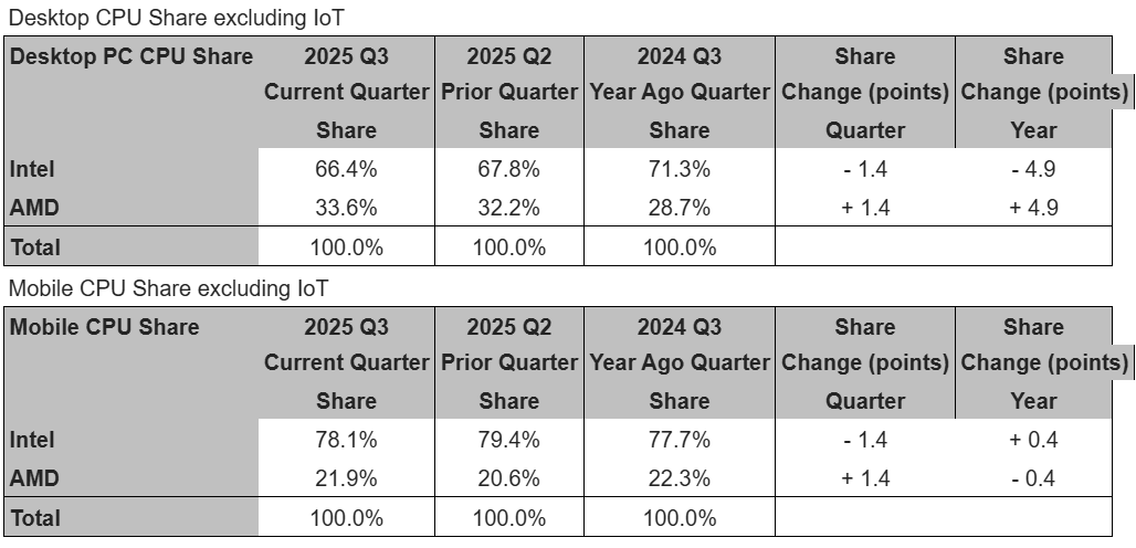 Наибольшими успехами AMD может похвастаться в настольном сегменте, где она ответственна за поставку больше трети всех x86-совместимых процессоров. Точный показатель по итогам квартала составил 33,6%, тогда как годом ранее он был равен 28,7%. В сегменте x86-процессоров для ноутбуков результаты AMD более скромные. В прошлом квартале «красные» поставили 21,9% всех таких CPU, что немного хуже прошлогодних показателей (22,3%).