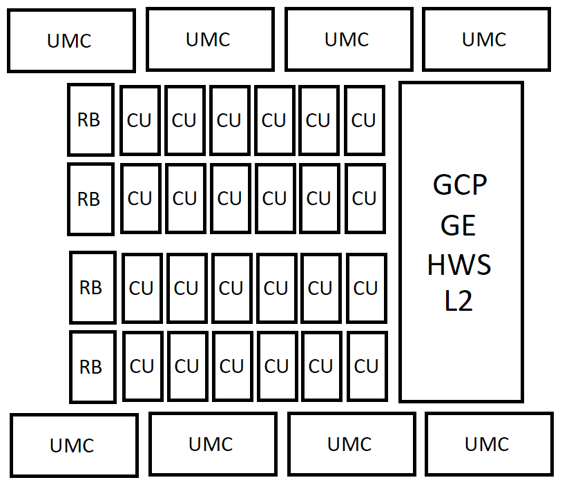 Старший GPU вероятно получит 96 блоков Compute Units (CU), которые будут объединены в 8 шейдерных массивов по 2 больших шейдерных блока. Для сравнения нужно напомнить, что чип Navi 48 в Radeon RX 9070 XT получил только 64 CU. Каждый шейдерный блок имеет собственный блок RB (Render Backed), который подключен к блоку SoC в центре, где находится управляющий процессор, графический движок, HWS и кэш второго уровня. Также у чипа будет 16 контроллеров памяти разрядностью 32-бита, что обеспечит работу шины памяти 512 бит. Такой кристалл может содержать до 128 МБ Infinity Cache. Данный GPU может получить 24 ГБ памяти или 32 ГБ, в зависимости от емкости используемых модулей GDDR7.