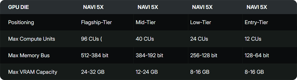 Второй в иерархии чип получит 40 CU и 6 контроллеров памяти, что обеспечит работу с памятью по шине 192 бит. Этот вариант может содержать до 48 МБ кэша Infinity. На борту будет 12 ГБ или 24 ГБ памяти.