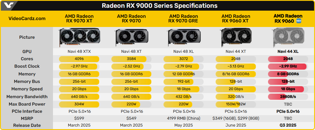 В основу Radeon RX 9060 ляжет графический чип AMD Navi 44, знакомый по Radeon RX 9060 XT. Более того, компания использовала ту же конфигурацию с 2048 потоковыми процессорами, интерфейсом PCIe 5.0 x16 и 128-разрядной шиной памяти, через которую GPU взаимодействует с восемью гигабайтами GDDR6. Главное отличие от XT-версии кроется в тактовых частотах.