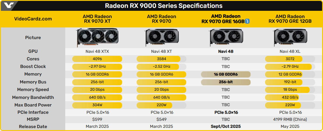 Линейка видеокарт AMD RDNA 4‑го поколения в скором времени пополнится ещё одной модель. По данным азиатских источников, «красные» готовят к релизу обновлённую версию Radeon RX 9070 GRE. Главной особенностью новинки станет увеличенный до 16 Гбайт объём видеобуфера. Это также означает использование 256-разрядной шины памяти, что в свою очередь повысит пропускную способность. В качестве ориентировочных сроков релиза Radeon RX 9070 GRE 16GB указывается сентябрь-октябрь.