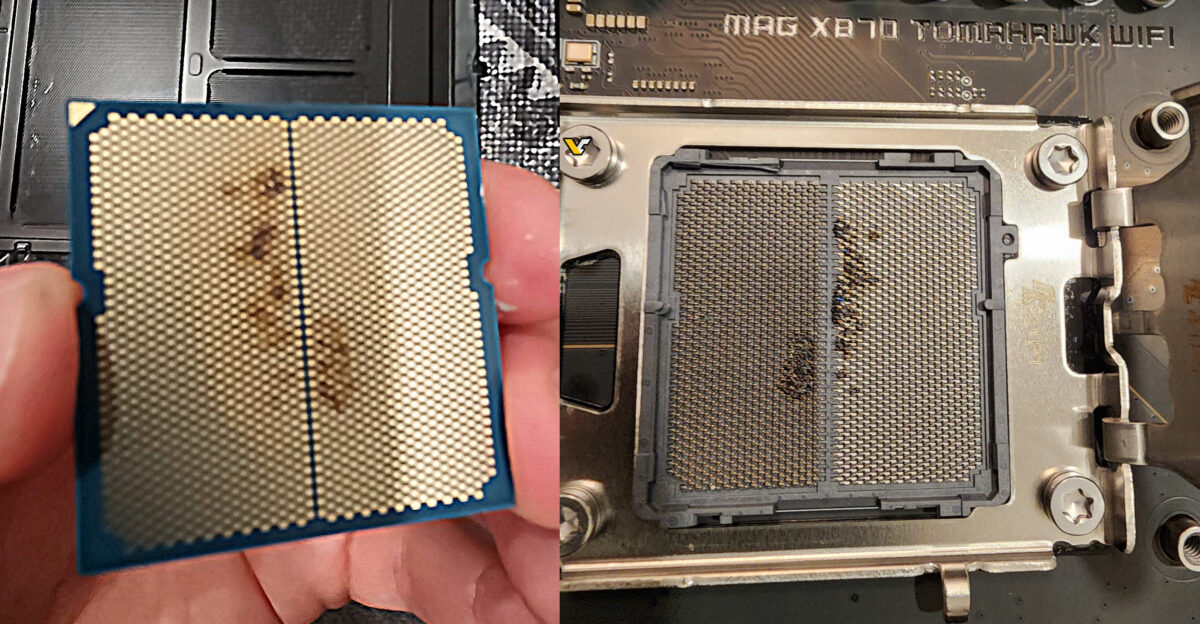 Между тем, один из новоиспечённых владельцев AMD Ryzen 7 9800X3D — нового игрового флагмана платформы AM5 — столкнулся с аналогичной проблемой. Фотографиями неисправного CPU и сокета он поделился на портале Reddit. Это первый зафиксированный случай выгорания нового процессора, чей официальный релиз состоялся всего неделю назад. В настоящее время трудно сказать, что именно привело к повреждению CPU, но одна правдоподобная теория уже есть.