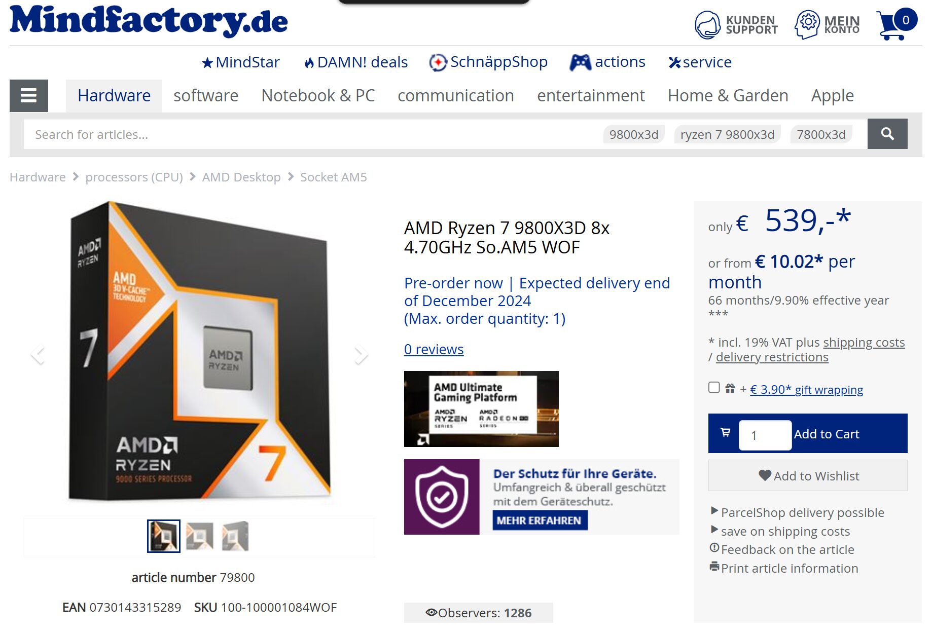Сейчас зарубежные ритейлеры предлагают оформить предварительный заказ, правда, покупателям придётся подождать. В частности, немецкий интернет-магазин Mindfactory, известный своей открытой статистикой продаж, уведомил покупателей, что при заказе Ryzen 7 9800X3D они получат его только в конце декабря. Хорошая новость в том, что цена нового процессора пока остаётся на рекомендованном AMD уровне.