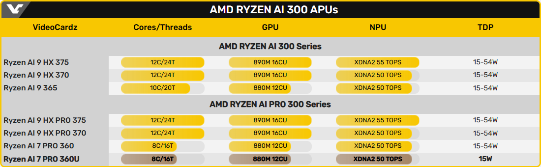 В арсенале AMD Ryzen AI 7 PRO 360U есть 8 ядер/16 потоков с архитектурой Zen 5(c), встроенная графика Radeon 880M и NPU-блок XDNA 2-го поколения с производительностью 50 TOPS. Главное отличие новинки от выпущенного ранее Ryzen AI 7 PRO 360, судя по всему, кроется параметрах энергопотребления. По мнению зарубежных коллег, штатный показатель TDP у этого процессора равен всего 15 Вт.