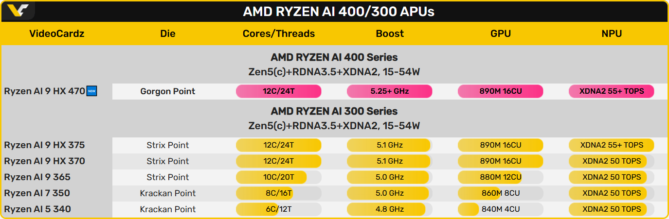 Процессоры AMD Gorgon Point станут «рефрешем» уже знакомой линейки. Утилита подтвердила, что Ryzen AI 9 HX 470 получил 12 ядер/24 потока и встроенную графику Radeon 890M, а единственным отличием от актуального Ryzen AI 9 HX 370 стала прибавка тактовой частоты. В динамическом разгоне новинка сможет покорить 5,25 ГГц против 5,1 ГГц. Среди первых устройства на базе APU Gorgon Point выпустит компания HP, в ноутбуке которой и был замечен вышеупомянутый процессор.