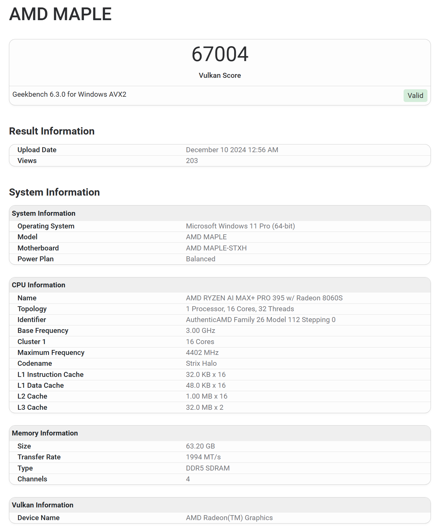 В вышеупомянутом тестовом пакете был испытан флагманский процессор Ryzen AI Max+ 395, а точнее его графический блок Radeon 8060S. Использовалась референсная платформа AMD MAPLE-STXH с 64 гигабайтами оперативной памяти.