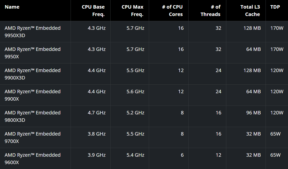 С точки зрения технических характеристик процессоры AMD Ryzen Embedded 9000 близки к обычным CPU Ryzen 9000‑й серии. Они тоже имеют конструктивное исполнение AM5, могут предложить до 16 ядер Zen 5 и до 128 МБ кэш-памяти третьего уровня благодаря технологии 3D V‑Cache. Отмечается наличие контроллеров DDR5 и PCI Express 5.0, а паспортный уровень TDP составляет от 65 до 170 Вт в зависимости от модели. Краткие спецификации новинок приведены ниже.