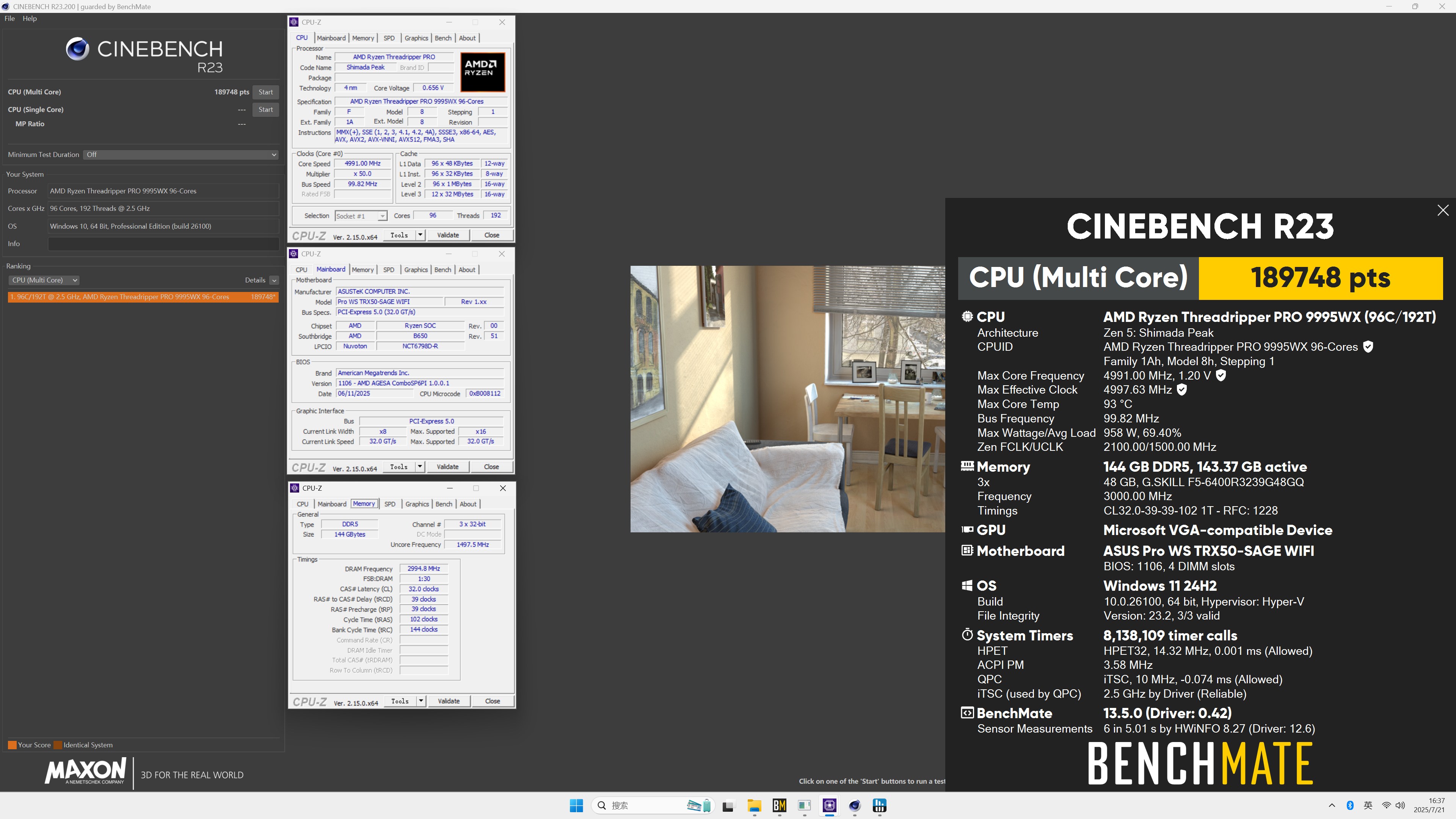 Энтузиасту SkyWalkerAMD посчастливилось раздобыть образец AMD Ryzen Threadripper PRO 9995WX до официального старта продаж. Он испытал новинку в нескольких оверклокерских дисциплинах, используя готовую систему жидкостного охлаждения (модель не уточняется). Например, максимальный показатель CPU Frequency составил 5608,78 МГц, а в тесте Cinebench R23 на частоте около 5,0 ГГц удалось набрать 189 748 баллов. Это всего на 10% хуже рекордного показателя Ryzen Threadripper PRO 7995WX, установленного при участии испарителя жидкого азота.